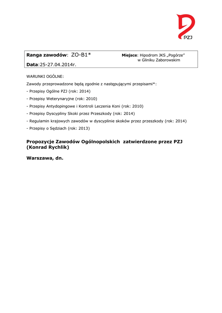 Ranga zawodów: ZO-B1* Miejsce: Hipodrom JKS „Pogórze” w Gliniku Zaborowskim Data:25-27.04.2014r. WARUNKI OGÓLNE: Zawody przeprowadzone będą zgodnie z następującymi przepisami*: - Przepisy Ogólne PZJ (rok: 2014) - Przepisy Weterynaryjne (rok: 2010) - Przepisy Antydopingowe i Kontroli Leczenia Koni (rok: 2010) - Przepisy Dyscypliny Skoki przez Przeszkody (rok: 2014) - Regulamin krajowych zawodów w dyscyplinie skoków przez przeszkody (rok: 2014) - Przepisy o Sędziach (rok: 2013) Propozycje Zawodów Ogólnopolskich zatwierdzone przez PZJ (Konrad Rychlik) Warszawa, dn. I. INFORMACJE OGÓLNE 1. Zawody: 1.1 Zawody Ogólnopolskie: Ranga zawodów: 1*x 2* 3* ZO-B CSN ZODiM-B Zawody halowe: T N Kategoria: Seniorzy Młodzi Jeźdźcy Kuce i Małe Konie Juniorzy Juniorzy Młodsi Data : 25-27.04.2014r. Miejsce: Glinik Zaborowski W trakcie ZO będą rozegrane Zawody Regionalne – osobne Propozycje 2. Organizator (kompletny adres) Nazwa: JKS”POGÓRZE”, UCHWAT TEAM. Adres: GLINIK ZABOROWSKI 181 Kod pocztowy: 38-100 STRZYŻÓW Telefon: 17 2763 466 Email: [email protected] Internet: www.uchwatteam.pl Fax : 17 2763 466 3. Komitet Organizacyjny Przewodniczący: Włodzimierz UCHWAT Dyrektor Zawodów: Włodzimierz UCHWAT Biuro Zawodów: Katarzyna UCHWAT Rzecznik Prasowy: Kinga Maślak Szef Stajni: Katarzyna UCHWAT 604 096 641 604 198 141 II. OSOBY OFICJALNE (zgodnie z Przepisami o Sędziach wyd. 6.5) 1. Komisja Sędziowska: Przewodniczący: AGNIESZKA KLOC Sędzia PZJ: BOŻENA GNACY Sędziowie stylu konia: BOGDAN KUCHEJDA, TADEUSZ GŁOSKOWSKI Członkowie: PAWEŁ MALINOWSKI, MAGDALENA KRYCZKA 2. Gospodarz Toru: ADAM GALUBA Asystent Gospodarza Toru :Tomasz PRÓCHNIAK 3. Komisarze: EWA BRODECKA- NYKIEL, ALEKSANDER CYRAN 4. Lekarz weterynarii zawodów: WALDEMAR KALINOWSKI III WARUNKI TECHNICZNE Otwarcie stajni Sprawdzanie dokumentów data 24.04.2014r godzina 15:00 24.04.2014r 20:00 Plac konkursowy: podłoże: PIASKOWE TYPU „All weather” niezależne od pogody w pełni przepuszczalne wodę) wymiary: 47 mx80m Rozprężalnia: podłoże: PIASKOWE TYPU „All weather” niezależne od pogody w pełni przepuszczające wodę) wymiary: 40 mx40m hala wymiary:18mx50m i Producent łyżek bezpieczeństwa (PZJ - Przepisy Dyscypliny GALA inż. Włodzimierz Uchwat B – Art 210): IV. WARUNKI UCZESTNICTWA 1.Uczestnictwo Zgodnie z Przepisami Ogólnymi PZJ oraz Regulaminem Dyscypliny Skoków PZJ 2. Zgłoszenia: Termin zgłoszeń wstępnych:10.04.2014R. Termin zgłoszeń imiennych: Termin zgłoszeń ostatecznych:20.04.2014 R. Zgłoszenia prosimy wysyłać na adres: JKS"POGÓRZE" GLINIK ZABOROWSKI 181, 38-100 STRZYŻÓW Fax : 17 2763 466 Email: [email protected] Zgłoszenia wyłącznie na drukach PZJ 3. Warunki finansowe : Bez przedpłat, płatne w całości na miejscu zawodów. Zgłoszenia mailowe w terminie i nie wycofane do 20.04.2014r. są jednoznaczne z przyjęciem zobowiązania do zapłaty. Organizator dysponuje ograniczona iloscia 60 boksów. W przypadku dużego zainteresowania obowiązuje kolejność zgłoszeń. Opłata za program badań antydopingowych: 15 zł od konia (TYLKO ZO) Opłaty wpisowe (zgodnie z Regulaminem Rozgrywania Zawodów w skokach art.8, pkt 5) RMK – wpisowe 80 zł/ koń ŚR – wpisowe 80 zł/ koń DR - wpisowe 100 zł/ koń Opłata za boks 350 zł Pasza i siano własne: TAK Możliwość zakupu siana: 1 balik – 7 zł, słomy: 1 balik – 5 zł Kostka trocin odpylonych – 50 zł Podłączenie samochodu do prądu: 75 zł Konie startujące bez boksu mają opłatę wpisową obniżoną o 100 zł. Prosimy w zgłoszeniu zaznaczyć, że nie będą Państwo korzystać z boksu. Boksy o wymiarach 3m x 3 m ściółka standard - słoma 4. Zakwaterowanie i wyżywienie: na koszt własny: T N na koszt KO: T N ZAWODNIKÓW, LUZAKÓW, TRENERÓW, WŁAŚCICIELI KONI ZAPRASZAMY NA: W CZWARTEK: RIDERS PARTY W GÓRNEJ ALTANIE GRA DJ TIESTO OD 21.oo W PIĄTEK: BEZPŁATNY WYJAZD DO PARKU WODNEGO DO STRZYŻOWA (basen wynajęty przez organizatora tylko dla uczestników zawodów)(WWW.CSTR.PL) OD GODZINY 20.00 DO 22.00 (PROSIMY JEDYNIE O ZABRANIE STROJÓW KĄPIĘLOWYCH ) W SOBOTĘ: KOLACJĘ INTEGRACYJNĄ Z MUZYKĄ OD GODZINY 20.00 W ALTANIE Z GRILLEM. W TRAKCIE TRWANIA ZAWODÓW CZYNNA LOŻA VIP cennik w załączniku. ZAKWATEROWANIE NA TERENIE ZAWODÓW: DWÓR MARIA ANTONINA – NA TERENIE ZAWODÓW http://dwormariaantonina.pl/ TEL: 604198141, 17 25 00 835 Ceny po rabacie dla uczestników zawodów. W cenę wliczone jest śniadanie: Pokój 1 os 190 zł Pokój 2 os 260 zł Pokój 3 os 330 zł Pokój 4 os 360 zł Doba hotelowa od 14.00 do 12.00 Agroturystyka „ U Jadzi” , na terenie zawodów, cena 45zł/os Tel: 608 184 295 Agroturystyka „U Kasi”, na terenie zawodów, cena 45zł/os Tel. 604 198 141 5. Kary za brak dokumentów – według stawek PZJ. 6. Za reklamacje i odwołania obowiązuje kaucja w wys.:200 PLN 7. Dokonanie zmiany w zapisach do konkursu (po wywieszeniu list startowych) za zgodą sędziego głównego: 0 PLN 8. Wymagana dokumentacja dla koni aktualne badania i szczepienia ochronne 9. Organizator nie ponosi odpowiedzialności za kradzieże, wypadki oraz inne szkody mogące mieć miejsce podczas zawodów i transportu 10. Prosimy o przestrzeganie ciszy nocnej od godziny 23.oo do 7.oo 11. Kara finansowa za zakłócenie ciszy nocnej wynosi – 200 zł. – decyduje organizator. V. ZAGADNIENIA WETERYNARYJNE Lp. Funkcja Imię i nazwisko 1. Powiatowy lekarz wet. Wiesław ZIOBRO Lekarz wet. Zawodów Waldemar KALINOWSKI telefon 600 288 141 2. 3. 509 362 646 Szczepienia ochronne przeciwko grypie koni. Obowiązuje następujący schemat szczepień: a. szczepienie podstawowe: pierwsze szczepienie – w dniu rozpoczęcia szczepień drugie szczepienie – nie wcześniej niż 21-go dnia i nie później niż 92 dnia od pierwszego szczepienia. b. szczepienie przypominające: co 6 miesięcy od ostatniego szczepienia (jest dopuszczalny 21 dniowy okres karencji); żadne szczepienie przypominające nie może się odb