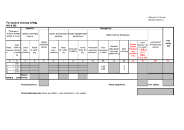Załacznik nr 2 do siwz DZ-2501/284/44/12 Formularz cenowy oferty WO-3-559 SprzedaŜ Planowane zuŜycie energii przez 12 m-cy. Opłata za energię czynną Ilość Strefa MWh w cena koszt czasow strefie jedn. [2.] x [3.] a* czasow (zł/MWh) (zł) ej 1. I II III IV RAZEM: 2. 800 215 850 840 Dystrybucja 3. 4. Opłata dystrybucyjna Opłata dystrybucyjna sieciowa jakościowa Opłata handlowa (zł/rok) 5. cena jedn. (zł/MWh) 6. Opłata stała za dystrybucję koszt Stawka [10.]x[11.]x Składnik Opłaty [12.]x[13.] koszt koszt Wskaźnik Moc cena jedn. stały stawki Ilość Przejścio + ([10.]x [2.] x [6.] [2.] x [8.] pewności zamówion wej (zł/MWh) sieciowej miesięcy [11.]x (zł) (zł) zasilania ** a (MW) (zł./MWh/ (zł/MW/m-c) [13.]x m-c) [14.]) (zł) 7. 8. 9. 10. 11. 0,85 0,65 12. 13. 14. 15. Abonament dystrybucyjny (zł/rok) 16. 6 6 Razem 2705 koszty: Koszt sprzedaŜy: Koszt całkowity netto (koszt sprzedaŜy + koszt dystrybucji + inne opłaty): Koszt dystrybucji : Inne opłaty: Inne opłaty (zł) 17. WO-3-175 SprzedaŜ Dystrybucja Planowane zuŜycie energii Opłata za energię przez 12 m-cy. czynną Ilość MWh cena Strefa koszt w jedn. czaso [2.] x strefie (zł/MWh wa* [3.] (zł) czaso ) wej 1. 2. 3. 4. C21 640 Opłata dystrybucyjna sieciowa Opłata handlow a (zł/rok) 5. Opłata dystrybucyjna jakościowa Opłata stała za dystrybucję Abonament koszt dystrybucyjny Stawka [10.]x[11.]x (zł/rok) Opłaty Składnik Wskaźnik stały [12.]x[13.] Moc cena koszt cena koszt Ilość pewności stawki Przejścio + ([10.]x jedn. [2.] x [6.] jedn. [2.] x [8.] zamówio miesięc wej zasilania sieciowej [11.]x (zł/MWh) (zł) (zł/MWh) (zł) na (MW) y (zł./MWh/ ** (zł/MW/m[13.]x m-c) c) [14.]) (zł) 6. 7. 8. 9. 10. 11. 12. 13. 14. 15. 0,22 6 12 6 0,18 6 Razem RAZEM: 640 koszty: Koszt sprzedaŜy: Koszt całkowity netto (koszt sprzedaŜy + koszt dystrybucji + inne opłaty): Koszt dystrybucji : 16. Inne opłaty: Inne opłaty (zł) 17. WO-3-568 SprzedaŜ Dystrybucja Planowane zuŜycie energii Opłata za energię przez 12 m-cy. czynną Ilość MWh cena Strefa koszt w jedn. [2.] x czaso strefie (zł/MWh wa* [3.] (zł) czaso ) wej 1. 2. 3. 4. C21 200 Opłata dystrybucyjna sieciowa Opłata handlow a (zł/rok) 5. Opłata dystrybucyjna jakościowa Opłata stała za dystrybucję Abonament koszt dystrybucyjny Stawka [10.]x[11.]x (zł/rok) Opłaty Składnik Wskaźnik stały [12.]x[13.] cena koszt cena koszt Moc Ilość pewności stawki Przejścio + ([10.]x jedn. [2.] x [6.] jedn. [2.] x [8.] zamówio miesięc wej zasilania sieciowej [11.]x (zł/MWh) (zł) (zł/MWh) (zł) na (MW) y (zł./MWh/ ** (zł/MW/m[13.]x m-c) c) [14.]) (zł) 6. 7. 8. 9. 10. 11. 12. 13. 14. 15. 0,1 6 12 6 0,085 6 Razem RAZEM: 200 koszty: Koszt sprzedaŜy: Koszt dystrybucji : Koszt całkowity netto (koszt sprzedaŜy + koszt dystrybucji + inne opłaty): * Podział na strefy czasowe charakteryzujące zuŜycie energii przez Zamawiającego pokazano na załączonym arkuszu ** Wskaźnik pewności zasilania nie moŜe być większy niŜ 1,5 - pola do wypełnienia przez dostawcę/oferenta 16. Inne opłaty: Inne opłaty (zł) 17.
