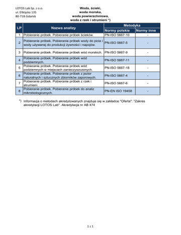 LOTOS Lab Sp. z o.o. ul. Elbląska 135 80-718 Gdańsk LP Woda, ścieki, woda morska, woda powierzchniowa, woda z rzek i strumieni *) Metodyka Nazwa analizy Normy polskie 1 Pobieranie próbek. Pobieranie próbek ścieków. Normy inne PN-ISO 5667-10 - Pobieranie próbek. Pobieranie próbek wody do picia i PN-ISO 5667-5 wody używanej do produkcji żywności i napojów. - 3 Pobieranie próbek. Pobieranie próbek wód morskich. PN-ISO 5667-9 - 2 4 5 6 7 8 Pobieranie próbek. Pobieranie próbek wód podziemnych. Pobieranie próbek. Pobieranie próbek wód podziemnych w miejscach zanieczyszczonych. Pobieranie próbek. Pobieranie próbek z jezior naturalnych i sztucznych zbiorników zaporowych. Pobieranie próbek. Pobieranie próbek z rzek i strumieni. Pobieranie próbek. Pobieranie próbek do analiz mikrobiologicznych. PN-ISO 5667-11 - PN-ISO 5667-18 - PN-ISO 5667-4 - PN-ISO 5667-6 - PN-EN ISO 19458 - *) Informacja o metodach akredytowanych znajduje się w zakładce "Oferta": "Zakres akredytacji LOTOS Lab". Akredytacja nr AB 474 1z1