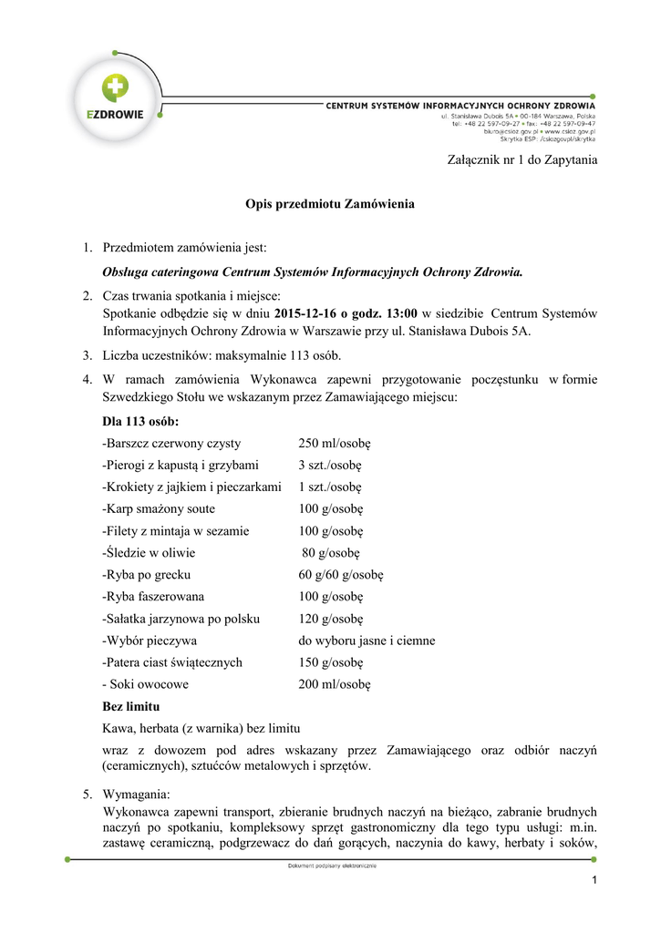 Załącznik nr 1 do Zapytania Opis przedmiotu Zamówienia 1. Przedmiotem zamówienia jest: Obsługa cateringowa Centrum Systemów Informacyjnych Ochrony Zdrowia. 2. Czas trwania spotkania i miejsce: Spotkanie odbędzie się w dniu 2015-12-16 o godz. 13:00 w siedzibie Centrum Systemów Informacyjnych Ochrony Zdrowia w Warszawie przy ul. Stanisława Dubois 5A. 3. Liczba uczestników: maksymalnie 113 osób. 4. W ramach zamówienia Wykonawca zapewni przygotowanie poczęstunku w formie Szwedzkiego Stołu we wskazanym przez Zamawiającego miejscu: Dla 113 osób: -Barszcz czerwony czysty 250 ml/osobę -Pierogi z kapustą i grzybami 3 szt./osobę -Krokiety z jajkiem i pieczarkami 1 szt./osobę -Karp smażony soute 100 g/osobę -Filety z mintaja w sezamie 100 g/osobę -Śledzie w oliwie 80 g/osobę -Ryba po grecku 60 g/60 g/osobę -Ryba faszerowana 100 g/osobę -Sałatka jarzynowa po polsku 120 g/osobę -Wybór pieczywa do wyboru jasne i ciemne -Patera ciast świątecznych 150 g/osobę - Soki owocowe 200 ml/osobę Bez limitu Kawa, herbata (z warnika) bez limitu wraz z dowozem pod adres wskazany przez Zamawiającego oraz odbiór naczyń (ceramicznych), sztućców metalowych i sprzętów. 5. Wymagania: Wykonawca zapewni transport, zbieranie brudnych naczyń na bieżąco, zabranie brudnych naczyń po spotkaniu, kompleksowy sprzęt gastronomiczny dla tego typu usługi: m.in. zastawę ceramiczną, podgrzewacz do dań gorących, naczynia do kawy, herbaty i soków, 1 talerzyki i talerze oraz sztućce, wszystko w ilości, która nie będzie powodowała konieczności mycia naczyń w miejscu wykonywania usługi, a także podgrzewacze do wody, stoły barowe w ilości min. 15 szt., obrusy na stół szwedzki i stoły barowe, serwetki, pojemniki na śmieci i odpadki. 6. Wykonawca zobowiązany jest do przygotowania stołów przed godziną 13:00 w dniu 2015-12-16. 7. Wykonawca powinien zapewnić obsługę kelnerską przez cały czas trwania spotkania, od godziny 13:00 do maksymalnie dwóch godzin. 8. Zamawiający oczekuje przedstawienia ofert z podaniem kosztu dla 1 osoby oraz obejmującego wszystkie wymagania opisane w przedmiocie zamówienia. Wykonawca w ofercie przedstawi kwoty jednostkowe netto i brutto w zł. 9. Płatność w terminie 14 dni od dnia dostarczenia do siedziby Zamawiającego prawidłowo wystawionej faktury lub rachunku. 10. Zamawiający zastrzega sobie możliwość zmiany terminu spotkania najpóźniej na 3 dni robocze przed terminem wskazanym w pkt 2 OPZ. 2
