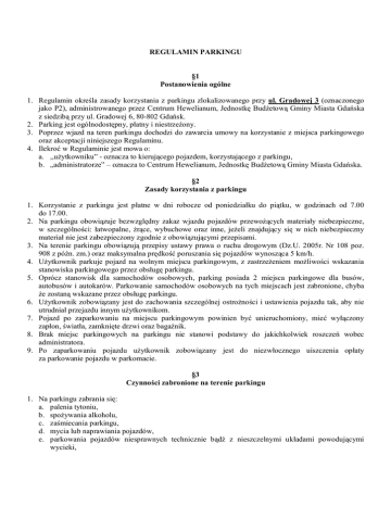 REGULAMIN PARKINGU §1 Postanowienia ogólne 1. Regulamin określa zasady korzystania z parkingu zlokalizowanego przy ul. Gradowej 3 (oznaczonego jako P2), administrowanego przez Centrum Hewelianum, Jednostkę Budżetową Gminy Miasta Gdańska z siedzibą przy ul. Gradowej 6, 80-802 Gdańsk. 2. Parking jest ogólnodostępny, płatny i niestrzeżony. 3. Poprzez wjazd na teren parkingu dochodzi do zawarcia umowy na korzystanie z miejsca parkingowego oraz akceptacji niniejszego Regulaminu. 4. Ilekroć w Regulaminie jest mowa o: a. ,,użytkowniku” - oznacza to kierującego pojazdem, korzystającego z parkingu, b. „administratorze” – oznacza to Centrum Hewelianum, Jednostkę Budżetową Gminy Miasta Gdańska. §2 Zasady korzystania z parkingu 1. Korzystanie z parkingu jest płatne w dni robocze od poniedziałku do piątku, w godzinach od 7.00 do 17.00. 2. Na parkingu obowiązuje bezwzględny zakaz wjazdu pojazdów przewożących materiały niebezpieczne, w szczególności: łatwopalne, żrące, wybuchowe oraz inne, jeżeli znajdujący się w nich niebezpieczny materiał nie jest zabezpieczony zgodnie z obowiązującymi przepisami. 3. Na terenie parkingu obowiązują przepisy ustawy prawa o ruchu drogowym (Dz.U. 2005r. Nr 108 poz. 908 z późn. zm.) oraz maksymalna prędkość poruszania się pojazdów wynosząca 5 km/h. 4. Użytkownik parkuje pojazd na wolnym miejscu parkingowym, z zastrzeżeniem możliwości wskazania stanowiska parkingowego przez obsługę parkingu. 5. Oprócz stanowisk dla samochodów osobowych, parking posiada 2 miejsca parkingowe dla busów, autobusów i autokarów. Parkowanie samochodów osobowych na tych miejscach jest zabronione, chyba że zostaną wskazane przez obsługę parkingu. 6. Użytkownik zobowiązany jest do zachowania szczególnej ostrożności i ustawienia pojazdu tak, aby nie utrudniał przejazdu innym użytkownikom. 7. Pojazd po zaparkowaniu na miejscu parkingowym powinien być unieruchomiony, mieć wyłączony zapłon, światła, zamknięte drzwi oraz bagażnik. 8. Brak miejsc parkingowych na parkingu nie stanowi podstawy do jakichkolwiek roszczeń wobec administratora. 9. Po zaparkowaniu pojazdu użytkownik zobowiązany jest do niezwłocznego uiszczenia opłaty za parkowanie pojazdu w parkomacie. §3 Czynności zabronione na terenie parkingu 1. Na parkingu zabrania się: a. palenia tytoniu, b. spożywania alkoholu, c. zaśmiecania parkingu, d. mycia lub naprawiania pojazdów, e. parkowania pojazdów niesprawnych technicznie bądź z nieszczelnymi układami powodującymi wycieki, f. innych działań niezgodnych z przepisami PPOŻ, g. prowadzenia handlu oraz jakiejkolwiek innej działalności gospodarczej, h. innych zachowań sprzecznych z zasadami współżycia społecznego lub zakłócających korzystanie z parkingu przez użytkowników. §4 Opłaty jednorazowe 1. Użytkownik zobowiązany jest do wniesienia opłaty za parkowanie, w formie wykupienia biletu parkingowego w parkomacie za kwotę odpowiadającą przewidywanemu czasowi parkowania od chwili zajęcia miejsca parkingowego, z zastrzeżeniem opłaty minimalnej za pierwszą godzinę parkowania. 2. Parkomaty przyjmują monety 10-,20-,50-groszowe oraz 1-,2-,5-złotowe (nie przyjmują monet okolicznościowych). 3. Parkomaty nie wydają reszty, nie przyjmują banknotów i kart płatniczych. 4. Jako potwierdzenie dokonania transakcji, parkomat drukuje oryginał i kopię biletu parkingowego. 5. Oryginał biletu parkingowego należy umieścić za przednią szybą na desce rozdzielczej wewnątrz pojazdu samochodowego, w sposób umożliwiający odczytanie dokumentu oraz potwierdzenie jego ważności. 6. Umieszczenie biletu parkingowego w miejscu niewidocznym lub w sposób uniemożliwiający bezpośredni odczyt z zewnątrz pojazdu traktuje się jako postój nieopłacony. 7. Niepełne wykorzystanie opłaconego czasu parkowania nie uprawnia do żądania zwrotu uiszczonej opłaty. 8. Obrót używanymi biletami parkingowymi jest zabroniony. 9. W przypadku parkowania pojazdu zajmującego więcej niż jedno miejsce parkingowe, opłatę uiszcza się za rzeczywiście zajmowane miejsca parkingowe. §5 Opłaty abonamentowe 1. Administrator dopuszcza parkowanie pojazdów – samochodów osobowych, posiadających wykupione karty abonamentowe. 2. Użytkownik może nabyć kartę abonamentową w siedzibie administratora przy ul. Gradowej 6 w Gdańsku, od poniedziałku do piątku, w godz. 8-15. 3. Posiadanie karty abonamentowej nie uprawnia użytkownika do rezerwacji miejsca parkingowego. 4. Kartę abonamentową należy umieścić za przednią szybą na desce rozdzielczej wewnątrz pojazdu samochodowego, w sposób umożliwiający odczytanie dokumentu oraz potwierdzenie jego ważności. 5. Umieszczenie karty abonamentowej w miejscu niewidocznym lub w sposób uniemożliwiający bezpośredni odczyt z zewnątrz pojazdu traktuje się jako postój nieopłacony. §6 Opłaty dla osób korzystających z oferty Centrum Hewelianum 1. Użytkownikom parkingu przysługują zniżki w opłatach za indywidualne bilety wstępu do Centrum Hewelianum. Zniżka nie obejmuje biletów grupowych i promocyjnych. 2. Zniżka przysługuje tylko w dniu dokonania płatności za parkowanie. 3. Wysokość zniżki wynosi 6 zł. 4. Zniżka przysługuje na podstawie kopii biletu parkingowego, przedłożonej przez użytkownika w recepcji Centrum Hewelianum, przy dokonywaniu opłaty za bilety wstępu. Późniejsze przedłożenie biletu parkingowego, nie uprawnia do uzyskania zniżki na wstęp lub zwrotu jego wartości użytkownikowi. 5. Zniżka przysługuje w dniach i godzinach otwarcia Centrum. Szczegółowe informacje dotyczące dni i godzin otwarcia, podawane są do publicznej wiadomości na stronie internetowej www.hewelianum.pl oraz w recepcji Centrum Hewelianum. §7 Opłaty dodatkowe i kontrola wnoszenia opłat 1. Za brak wniesienia opłaty parkingowej lub przekroczenie czasu parkowania wyznaczonego na bilecie parkingowym, pobiera się opłatę d