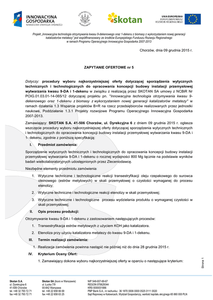 Projekt „Innowacyjna technologia otrzymywania kwasu 9-dekenowego oraz 1-dekenu z biomasy z wykorzystaniem nowej generacji katalizatorów metatezy” jest współfinansowany ze środków Europejskiego Funduszu Rozwoju Regionalnego w ramach Programu Operacyjnego Innowacyjna Gospodarka 2007-2013 www.skotansa.pl Chorzów, dnia 09 grudnia 2015 r. ZAPYTANIE OFERTOWE nr 5 Dotyczy: procedury wyboru najkorzystniejszej oferty dotyczącej sporządzenia wytycznych technicznych i technologicznych do opracowania koncepcji budowy instalacji przemysłowej wytwarzania kwasu 9-DA i 1-dekenu w związku z realizacją przez SKOTAN SA umowy z NCBiR Nr POIG.01.03.01-14-065/12 dotyczącej projektu pn. "Innowacyjna technologia otrzymywania kwasu 9dekenowego oraz 1-dekenu z biomasy z wykorzystaniem nowej generacji katalizatorów metatezy" w ramach działania 1.3 Wsparcie projektów B+R na rzecz przedsiębiorców realizowanych przez jednostki naukowe, Poddziałanie 1.3.1 Projekty rozwojowe Programu Operacyjnego Innowacyjna Gospodarka 2007-2013. Zamawiający: SKOTAN S.A. 41-506 Chorzów, ul. Dyrekcyjna 6 z dniem 09 grudnia 2015 r. ogłasza wszczęcie procedury wyboru najkorzystniejszej oferty dotyczącej sporządzenia wytycznych technicznych i technologicznych do opracowania koncepcji budowy instalacji przemysłowej wytwarzania kwasu 9-DA i 1- dekenu, zgodnie z poniższą specyfikacją: I. Przedmiot zamówienia: Sporządzenie wytycznych technicznych i technologicznych do opracowania koncepcji budowy instalacji przemysłowej wytwarzania 9-DA i 1-dekenu o rocznej wydajności 800 Mg łącznie na podstawie wyników badań wielkolaboratoryjnych udostępnionych przez Zleceniodawcę. Niezbędne elementy przedmiotu zamówienia: 1. Wytyczne techniczne i technologiczne reakcji transestryfikacji oleju rzepakowego do surowca oleinowego (estrów metylowych) w skali przemysłowej o czystości wymaganej do procesu etenolizy; 2. Wytyczne techniczne i technologiczne reakcji etenolizy w skali przemysłowej; 3. Wytyczne techniczne i technologiczne procesu wydzielania produktu o wymaganej czystości w skali przemysłowej; II. Opis procesu produkcji: Otrzymywanie kwasu 9-DA i 1-dekenu z zastosowaniem następujących procesów: 1. Transestryfikacja estrów metylowych z użyciem KOH jako katalizatora. 2. Etenoliza przy użyciu katalizatora metatezy do kwasu 9-DA i 1-dekenu. III. Termin realizacji zamówienia: 1. Realizacja zamówienia powinna nastąpić nie później niż do dnia 28 grudnia 2015 r. Kryterium Oceny Ofert: 1. Zamawiający dokona wyboru najkorzystniejszej oferty w oparciu o następujące kryterium: Skotan S.A. ul. Dyrekcyjna 6 41-506 Chorzów tel. +48 32 793 72 71 fax +48 32 793 72 71 Skotan SA (biuro w Warszawie) ul. Łucka 7/9 00-842 Warszawa tel. +48 22 658 66 69 fax +48 22 658 63 25 NIP 548-007-69-67 REGON 070629344 KRS 0000031886 PBP Bank S.A., nr rachunku: 36 1870 0006 0000 0525 0111 0020 Sąd Rejonowy w Katowicach, Wydział Gospodarczy, wartość kapitału akcyjnego 65 880 000 PLN Strona 1 IV. Projekt „Innowacyjna technologia otrzymywania kwasu 9-dekenowego oraz 1-dekenu z biomasy z wykorzystaniem nowej generacji katalizatorów metatezy” jest współfinansowany ze środków Europejskiego Funduszu Rozwoju Regionalnego w ramach Programu Operacyjnego Innowacyjna Gospodarka 2007-2013 www.skotansa.pl Najniższa oferowana cena [PLN] (waga kryterium – 100%) Kryterium nr 1 – cena przedstawiona w ofercie będzie oceniana zgodnie z zależnością: P1 = 100 * Cn / Cr * 100 gdzie: P1 – liczba punktów w kryterium 1 przyznanych rozpatrywanej ofercie 100 – maksymalna liczba punktów Cn – najniższa łączna oferowana cena w przetargu Cr – łączna cena rozpatrywanej oferty 100 – waga kryterium Maksymalną liczbę punktów 100 otrzyma najniższa oferowana cena. V. Wybór najkorzystniejszej oferty: 1. Oferty zawierające: a) cenę netto wyrażoną w polskich złotych; b) dane teleadresowe potencjalnego Oferenta; c) termin realizacji przedmiotu zamówienia; d) datę ważności oferty co najmniej do dnia 31 grudnia 2015 roku. prosimy dostarczyć do biura Zamawiającego w Chorzowie przy ul. Dyrekcyjnej 6 w formie papierowej do dnia 14.12.2015 roku do godz. 12.00. 2. Zamawiający niezwłocznie zawiadomi Oferenta, którego ofertę przyjęto do realizacji, o wyborze oferty oraz wyznaczy termin podpisania umowy. 3. Zamawiający niezwłocznie zawiadomi wszystkich pozostałych oferentów biorących udział w postępowaniu, że ich oferta nie została przyjęta do realizacji. 4. Zamawiający zastrzega sobie prawo unieważnienia postępowania bez dokonania wyboru którejkolwiek oferty bez podawania przyczyn. 5. Zamawiający nie dopuszcza możliwości składania ofert cząstkowych. VI. Informacje końcowe: 1. Niniejsze zapytanie ofertowe zostało umieszczone na stronach internetowych spółki SKOTAN SA (www.skotansa.pl) oraz w biurze Spółki w Chorzowie przy ul. Dyrekcyjnej 6 w miejscu ogólnodostępnym. Z poważaniem Strona 2 Marek Pawełczak Prezes Zarządu SKOTAN S.A. Skotan S.A. ul. Dyrekcyjna 6 41-506 Chorzów tel. +48 32 793 72 71 fax +48 32 793 72 71 Skotan SA (biuro w Warszawie) ul. Łucka 7/9 00-842 Warszawa tel. +48 22 658 66 69 fax +48 22 658 63 25 NIP 548-007-69-67 REGON 070629344 KRS 0000031886 PBP Bank S.A., nr rachunku: 36 1870 0006 0000 0525 0111 0020 Sąd Rejonowy w Katowicach, Wydział Gospodarczy, wartość kapitału akcyjnego 65 880 000 PLN