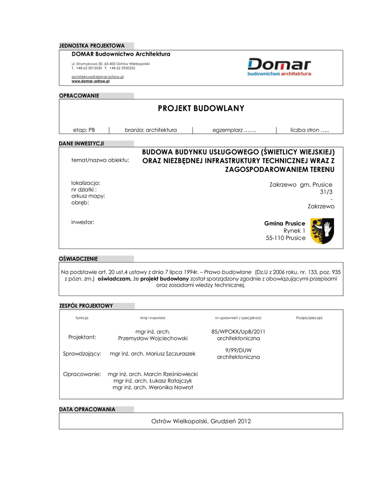 JEDNOSTKA PROJEKTOWA DOMAR Budownictwo Architektura ul. Strumykowa 30, 63-400 Ostrów Wielkopolski T. +48 62 5013530 F. +48 62 5920252 architektura@dom ar-ostrow.pl www.domar-ostrow.pl OPRACOWANIE PROJEKT BUDOWLANY etap: PB branża: architektura egzemplarz ……. liczba stron ….. DANE INWESTYCJI temat/nazwa obiektu: BUDOWA BUDYNKU USŁUGOWEGO (ŚWIETLICY WIEJSKIEJ) ORAZ NIEZBĘDNEJ INFRASTRUKTURY TECHNICZNEJ WRAZ Z ZAGOSPODAROWANIEM TERENU lokalizacja: nr działki : arkusz mapy: obręb: Zakrzewo gm. Prusice 31/3 Zakrzewo inwestor: Gmina Prusice Rynek 1 55-110 Prusice OŚWIADCZENIE Na podstawie art. 20 ust.4 ustawy z dnia 7 lipca 1994r. – Prawo budowlane (Dz.U z 2006 roku, nr. 133, poz. 935 z pózn. zm.) oświadczam, że projekt budowlany został sporządzony zgodnie z obowiązującymi przepisami oraz zasadami wiedzy technicznej. ZESPÓŁ PROJEKTOWY funkcja imię i nazwisko nr uprawnień / specjalność Projektant: mgr inż. arch. Przemysław Wojciechowski 85/WPOKK/UpB/2011 architektoniczna Sprawdzający: mgr inż. arch. Mariusz Szczuraszek 9/99/DUW architektoniczna Opracowanie: mgr inż. arch. Marcin Rześniowiecki mgr inż. arch. Łukasz Ratajczyk mgr inż. arch. Weronika Nawrot DATA OPRACOWANIA Ostrów Wielkopolski, Grudzień 2012 Podpis/pieczęć © DOMAR Budownictwo Architektura data: XII.2012 ul. Strumykowa 30, 63-400 Ostrów Wielkopolski T. +48 62 5013530 F. +48 62 5920252 2.0. SPIS ZAWARTOŚCI : lp. numer strony 1. 2. 3. 4. 5. 6. 7. 8. 2.1. Strona tytułowa projektu Spis zwartości projektu Dokumenty formalno –prawne Opis techniczny do projektu zagospodarowania terenu Opis techniczny do projektu architektoniczno-budowlanego Opis do ochrony przeciwpożarowej Projektowana charakterystyka energetyczna Część rysunkowa branży architektonicznej 1 2 3.0 4-8 5-20 21-22 23-25 26 SPIS DOKUMENTÓW FORMALNO-PRAWNYCH lp. dokument numer strony 1. 2. 3. 4. Kopia mapy do celów projektowych ( oryginał egz .nr 1) Warunki techniczne o przyłączenie do sieci wodociągowej Warunki techniczne na wykonanie przyłącza elektroenergetycznego Kopia uprawnień i przynależności do izby zawodowej projektanta branży architektonicznej Kopia uprawnień i przynależności do izby zawodowej sprawdzającego branży architektonicznej 3.1 3.2.1-3.2.2 3.3.1-3.3.4 5. 2.2. nr rysunku PZT1 PZT2 PZT2 A1 A2 A3 A4 A5 A6 A7 3.4.1-3.4.2 3.5.1-3.5.2 SPIS RYSUNKÓW tytuł skala numer strony Projekt zagospodarowania terenu Zbiorcza plansza sieci Plac zabaw Rzut przyziemia Rzut dachu Przekrój A-A Przekrój B-B Elewacja południowo - zachodnia Elewacja południowo – wschodnia Elewacje północno – zachodnia Elewacja północno - wschodnia 1:500 1:500 1:100 1:100 1:100 1:100 1:100 1:100 1:100 26 27 28 29 30 31 32 33 34 1:100 35 BUDOWA BUDYNKU USŁUGOWEGO (ŚWIETLICY WIEJSKIEJ) ORAZ NIEZBĘDNEJ INFRASTRUKTURY TECHNICZNEJ WRAZ Z ZAGOSPODAROWANIEM TERENU str. 2 © DOMAR Budownictwo Architektura ul. Strumykowa 30, 63-400 Ostrów Wielkopolski T. +48 62 5013530 F. +48 62 5920252 data: XII.2012 3.0 DOKUMENTY FORMALNO-PRAWNE BUDOWA BUDYNKU USŁUGOWEGO (ŚWIETLICY WIEJSKIEJ) ORAZ NIEZBĘDNEJ INFRASTRUKTURY TECHNICZNEJ WRAZ Z ZAGOSPODAROWANIEM TERENU str. 3 © DOMAR Budownictwo Architektura ul. Strumykowa 30, 63-400 Ostrów Wielkopolski T. +48 62 5013530 F. +48 62 5920252 data: XII.2012 4.0 OPIS TECHNICZNY DO PROJEKTU ZAGOSPODAROWANIA TERENU 4.1. DANE OGÓLNE 4.1.1. Temat: BUDOWA BUDYNKU USŁUGOWEGO (ŚWIETLICY WIEJSKIEJ) ORAZ NIEZBĘDNEJ INFRASTRUKTURY TECHNICZNEJ WRAZ Z ZAGOSPODAROWANIEM TERENU 4.1.2. Lokalizacja: ZAKRZEWO,GM. PRUSICE DZIAŁKA 31/3, OBRĘB : ZAKRZEWO 4.1.3. Inwestor : GMINA PRUSICE RYNEK 1 55-110 PRUSICE 4.1.4. Własność: INWESTOR 4.1.5. Podstawa opracowania: - umowa z Inwestorem, - wizja lokalna w terenie, - uzgodniona koncepcja programowo-funkcjonalna, - ROZPORZĄDZENIE MINISTRA INFRASTRUKTURY z dnia 12 kwietnia 2002 r. w sprawie warunków technicznych, jakim powinny odpowiadać budynki i ich usytuowanie. (Dz. U. Nr 75, poz. 690 z późniejszymi zmianami). - Decyzja o lokalizacji inwestycji celu publicznego wydana przez Burmistrza Miasta i Gminy Prusice 4.1.6. Jednostka projektowa : DOMAR Budownictwo Architektura 63-400 OSTRÓW WIELKOPOLSKI UL. STRUMYKOWA 30 TEL. 062 5013530 WWW.DOMAR-OSTROW.PL 4.2. ZAGOSPODAROWANIE DZIAŁKI: 4.2.1. Przedmiot inwestycji, zakres całego zamierzenia oraz kolejność realizacji obiektów: Przedmiotem inwestycji jest budowa budynku usługowego (świetlicy wiejskiej) z infrastrukturą techniczną i zagospodarowaniem terenu. Obiekt zostanie zrealizowany jednoetapowo, kolejność realizacji wg harmonogramu sporządzonego przez kierownika budowy. 4.2.2. Istniejący stan zagospodarowania terenu (położenie, istniejąca zabudowa, zieleń, ukształtowanie terenu , układ komunikacyjny) : Teren przeznaczony pod inwestycję położony jest we wsi Zakrzewo, gmina Prusice na dz. nr 13/3. Najbliższe sąsiedztwo stanowi zabudowa mieszkaniowa z towarzyszącą zabudową gospodarczą, pola uprawne, łąki oraz droga powiatowa. Działka 13/3 w BUDOWA BUDYNKU USŁUGOWEGO (ŚWIETLICY WIEJSKIEJ) ORAZ NIEZBĘDNEJ INFRASTRUKTURY TECHNICZNEJ WRAZ Z ZAGOSPODAROWANIEM TERENU str. 4 © DOMAR Budownictwo Architektura ul. Strumykowa 30, 63-400 Ostrów Wielkopolski T. +48 62 5013530 F. +48 62 5920252 data: XII.2012 chwili obecnej nie jest zabudowana żadnymi obiektami kubaturowymi. Działka jest równomiernie nasłoneczniona i charakteryzuje się małymi spadkami terenu. Działka posiada istniejący zjazd z drogi publicznej. 4.2.3. Stan projektowany, opis ogólny: Na działce 13/3 planuje się budowę parterowego budynku usługowego z przeznaczeniem na świetlicę wiejską. Obiekt zostanie wykonany w technologii tradycyjnej - murowanej z dachem stromym, dwuspadowym o kącie nachylenia 30˚=58%, połać pokryta dachówką ceramiczną. Budynek zlokalizowano na działce z zachowaniem wymaganych odległości od drogi, granic działki. Przy budynku zaprojektowano układ komunikacji w postaci chodnik
