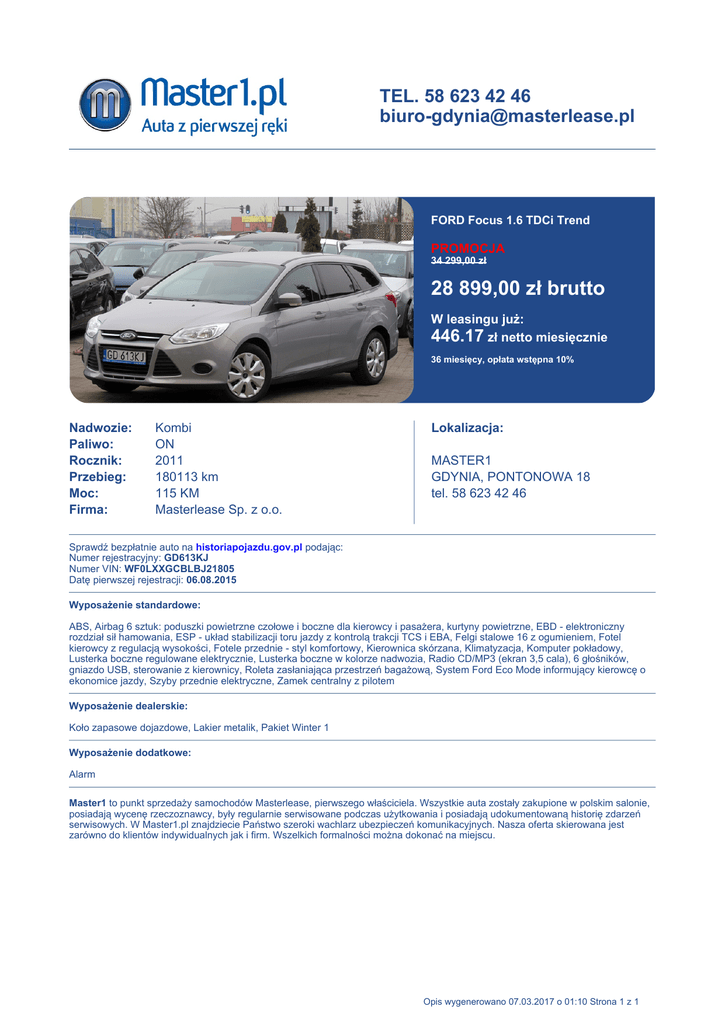 TEL. 58 623 42 46 [email protected] FORD Focus 1.6 TDCi Trend PROMOCJA 34 299,00 zł 28 899,00 zł brutto W leasingu już: 446.17 zł netto miesięcznie 36 miesięcy, opłata wstępna 10% Nadwozie: Paliwo: Rocznik: Przebieg: Moc: Firma: Kombi ON 2011 180113 km 115 KM Masterlease Sp. z o.o. Lokalizacja: MASTER1 GDYNIA, PONTONOWA 18 tel. 58 623 42 46 Sprawdź bezpłatnie auto na historiapojazdu.gov.pl podając: Numer rejestracyjny: GD613KJ Numer VIN: WF0LXXGCBLBJ21805 Datę pierwszej rejestracji: 06.08.2015 Wyposażenie standardowe: ABS, Airbag 6 sztuk: poduszki powietrzne czołowe i boczne dla kierowcy i pasażera, kurtyny powietrzne, EBD - elektroniczny rozdział sił hamowania, ESP - układ stabilizacji toru jazdy z kontrolą trakcji TCS i EBA, Felgi stalowe 16 z ogumieniem, Fotel kierowcy z regulacją wysokości, Fotele przednie - styl komfortowy, Kierownica skórzana, Klimatyzacja, Komputer pokładowy, Lusterka boczne regulowane elektrycznie, Lusterka boczne w kolorze nadwozia, Radio CD/MP3 (ekran 3,5 cala), 6 głośników, gniazdo USB, sterowanie z kierownicy, Roleta zasłaniająca przestrzeń bagażową, System Ford Eco Mode informujący kierowcę o ekonomice jazdy, Szyby przednie elektryczne, Zamek centralny z pilotem Wyposażenie dealerskie: Koło zapasowe dojazdowe, Lakier metalik, Pakiet Winter 1 Wyposażenie dodatkowe: Alarm Master1 to punkt sprzedaży samochodów Masterlease, pierwszego właściciela. Wszystkie auta zostały zakupione w polskim salonie, posiadają wycenę rzeczoznawcy, były regularnie serwisowane podczas użytkowania i posiadają udokumentowaną historię zdarzeń serwisowych. W Master1.pl znajdziecie Państwo szeroki wachlarz ubezpieczeń komunikacyjnych. Nasza oferta skierowana jest zarówno do klientów indywidualnych jak i firm. Wszelkich formalności można dokonać na miejscu. Opis wygenerowano 07.03.2017 o 01:10 Strona 1 z 1