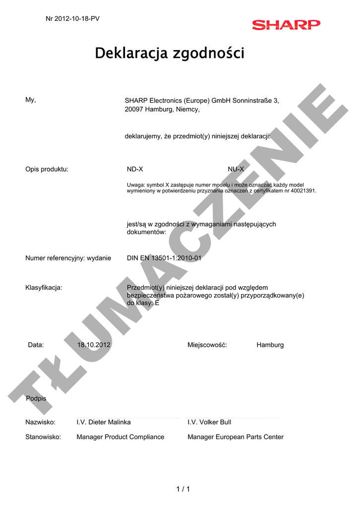 Nr 2012-10-18-PV Deklaracja zgodności My, IE SHARP Electronics (Europe) GmbH Sonninstraße 3, 20097 Hamburg, Niemcy, Opis produktu: E N deklarujemy, że przedmiot(y) niniejszej deklaracji: ND-X NU-X Z Uwaga: symbol X zastępuje numer modelu i może oznaczać każdy model wymieniony w potwierdzeniu przyznania oznaczeń z certyfikatem nr 40021391. DIN EN 13501-1:2010-01 M A Numer referencyjny: wydanie C jest/są w zgodności z wymaganiami następujących dokumentów: Przedmiot(y) niniejszej deklaracji pod względem bezpieczeństwa pożarowego został(y) przyporządkowany(e) do klasy: E ŁU Klasyfikacja: Data: 18.10.2012 Miejscowość: Hamburg T Podpis _______________________________________________________________________________________________________________________________________________________________________________________________________________________________________________________________________________________________________________________________________________________ ______________________________________________________________________________________________________________________________________________________________________________________________________________________________________________________________________________________________________________________________ Nazwisko: I.V. Dieter Malinka I.V. Volker Bull Stanowisko: Manager Product Compliance Manager European Parts Center 1/1