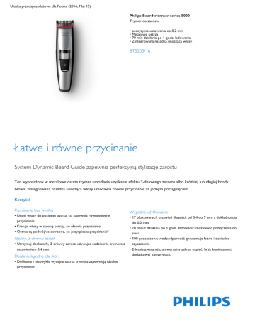 Ulotka przedsprzedażowa dla Polska (2016, Maj 15) Philips Beardtrimmer series 5000 Trymer do zarostu • precyzyjne ustawienia co 0,2 mm • Metalowe ostrza • 70 min działania po 1 godz. ładowania • Zintegrowana nasadka unosząca włosy BT5205/16 Łatwe i równe przycinanie System Dynamic Beard Guide zapewnia perfekcyjną stylizację zarostu Ten wyposażony w metalowe ostrza trymer umożliwia uzyskanie efektu 3-dniowego zarostu albo krótkiej lub długiej brody. Nowa, zintegrowana nasadka unosząca włosy umożliwia równe przycinanie za jednym pociągnięciem. Korzyści Przycinanie bez wysiłku • Unosi włosy do poziomu ostrza, co zapewnia równomierne przycinanie • Kieruje włosy w stronę ostrzy, co ułatwia przycinanie • Ostrza są podwójnie ostrzone, co przyspiesza przycinanie* Idealny, 3-dniowy zarost • Utrzymuj doskonały, 3-dniowy zarost, używając codziennie trymera z ustawieniem 0,4 mm Działanie łagodne dla skóry • Delikatne i niezwykle wydajne ostrza trymera zapewniają idealne przycinanie Wygodne użytkowanie • 17 blokowanych ustawień długości, od 0,4 do 7 mm z dokładnością do 0,2 mm • 70 minut działania po 1 godz. ładowania; możliwość podłączenia do sieci • 100-procentowa wodoodporność gwarantuje łatwe i dokładne czyszczenie • 2-letnia gwarancja, uniwersalny zakres napięć, brak konieczności dodatkowej konserwacji. Beardtrimmer series 5000 Cechy System Dynamic Beard Guide 100-procentowa wodoodporność System Dynamic Beard Guide wykorzystuje zintegrowaną nasadkę unoszącą włosy do poziomu ostrzy, co zapewnia równomierne przycinanie i pozwala uzyskać efekt 3-dniowego zarostu, krótką brodę lub długą brodę. Trymer jest całkowicie wodoodporny. Aby dokładnie wyczyścić głowicę, należy opłukać ją pod bieżącą wodą. Zintegrowana nasadka unosząca włosy Przytnij zarost jednym, szybkim ruchem przy zachowaniu delikatności. Nasza nowa, zintegrowana nasadka unosi zarost do poziomu ostrzy, co zapewnia wygodne i równomierne przycinanie. Metalowe ostrza Ten trymer jest wyposażony w podwójnie ostrzone, metalowe ostrza, które przycinają więcej włosów za jednym pociągnięciem, co przyspiesza stylizację. 17 blokowanych ustawień długości Wybierz preferowaną długość przycinania, obracając kółko ustawień długości na uchwycie, do momentu wyświetlenia preferowanej długości od 0,4 do 7 mm z dokładnością do 0,2 mm. Wybrana długość zostanie zablokowana, co zapewni doskonałe, równomierne przycięcie. Delikatne dla skóry ostrza Wyjątkowo skuteczne, a jednocześnie bezpieczne przycinanie za każdym razem. Stalowe ostrza trymera do brody delikatnie pocierają o siebie, ostrząc się wzajemnie podczas przycinania, dzięki czemu zachowują ostrość i efektywność na dłużej. Zaokrąglone końcówki pomagają uniknąć podrażnienia skóry. Doskonałe ustawienia do stylizacji zarostu Utrzymuj idealny, 3-dniowy zarost dzień po dniu, używając najkrótszego ustawienia — 0,4 mm. Trwałość Firma Philips udziela 2-letniej gwarancji na ten trymer. Wszystkie produkty do stylizacji męskiego zarostu cechują się wysoką trwałością. Nie trzeba ich konsewrować oraz posiadają uniwersalny system napięć. Działanie sieciowe i akumulatorowe Ładuj trymer do brody przez 1 godzinę, aby uzyskać 70 minut działania bezprzewodowego. Jeśli potrzebujesz więcej energii do przycinania, możesz podłączyć trymer do sieci elektrycznej. Trymer został zaprojektowany z myślą o zasilaniu akumulatorowym i sieciowym. Dane wkrótce ulegną zmianie 2016, Maj 15 Beardtrimmer series 5000 Specyfikacje Prosimy pamiętać, że jest to ulotka przedsprzedażowa. Treść ulotki jest zgodna z naszą najlepszą wiedzą w momencie publikacji i w odniesieniu do danego kraju (podane powyżej). Treść ulotki może ulec zmianie bez powiadomienia. Firma Philips nie ponosi odpowiedzialności za treść ulotki. System tnący Precyzja (wielkość odstępów) Element tnący Nierysujące ząbki Od 0,2 mm Serwis Ostrza ze stali szlachetnej Zapewniają większy komfort Znajdź swój styl Liczba ustawień długości 17 wbudowanych ustawień długości Akcesoria Nasadka grzebieniowa Konserwacja Zintegrowana nasadka unosząca włosy Szczoteczka do czyszczenia Łatwa obsługa Czyszczenie Pierścień powiększający Wyświetlacz Działanie Możliwość pełnego mycia w wodzie Wygodna regulacja ustawień długości Wskaźnik naładowania Działanie sieciowe i akumulatorowe Wzornictwo Wykończenie Uchwyt Chromowane wykończenie Miękki w dotyku uchwyt Moc Czas pracy Ładowanie Automatyczne napięcie 70 minut Pełne ładowanie trwa 1 godzinę 100–240 V 2 lata gwarancji Nie wymaga konserwacji Tak Tak Wymiary opakowania Wysokość Szerokość Głębokość Waga netto Waga brutto EAN Liczba produktów w zestawie Kraj pochodzenia Kod towaru według Systemu Zharmonizowanego (HS) 24,50 cm 15,00 cm 6,00 cm 0,25 kg 0,40 kg 08710103759072 1 CN 851020 Karton zewnętrzny Długość Szerokość Wysokość Waga brutto EAN Liczba opakowań konsumenckich 27,00 cm 17,00 cm 27,50 cm 1,82 kg 18710103759079 4 * W porównaniu z poprzednim modelem firmy Philips Dane wkrótce ulegną zmianie 2016, Maj 15 Version: 3.1.1 EAN: 08710103759072 © 2016 Koninklijke Philips Electronics N.V. Wszelkie prawa zastrzeżone Dane mogą ulec zmianie bez uprzedniego powiadomienia. Znak towarowy jest własnością Koninklijke Philips Electronics N.V. lub odpowiednich podmiotów . www.philips.com