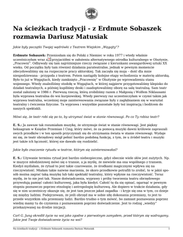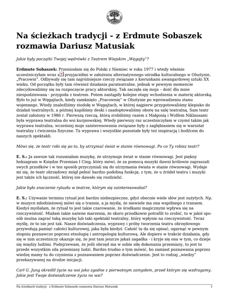 Na ścieżkach tradycji - z Erdmute Sobaszek rozmawia Dariusz Matusiak Jakie były początki Twojej wędrówki z Teatrem Wiejskim „Węgajty”? Erdmute Sobaszek: Przeniosłam się do Polski z Niemiec w roku 1977 i wtedy właśnie uczestniczyłam wraz z przyjaciółmi w założeniu alternatywnego ośrodka kulturalnego w Olsztynie, „Pracowni”. Odbywały się tam najróżniejsze rzeczy związane z kierunkami awangardowej sztuki XX wieku. Od początku były tam również działania parateatralne, jednak w pewnym momencie zdecydowaliśmy się na rozpoczęcie pracy aktorskiej. Tak zaczęła się moja – dość dla mnie niespodziewana - przygoda z teatrem. Potem nastąpiły kolejne etapy wchodzenia w materię aktorską. Było to już w Węgajtach, kiedy zamknięto „Pracownię” w Olsztynie po wprowadzeniu stanu wojennego. Wtedy znaleźliśmy stodołę w Węgajtach, w której najpierw przygotowaliśmy klepisko do działań teatralnych, a później kupiliśmy deski i zaadoptowaliśmy oborę na salę teatralną. Sam teatr został założony w 1986 r. Pierwszą rzeczą, którą zrobiliśmy razem z Małgosią i Wolfem Niklausami była wyprawa teatralna do wsi kurpiowskiej. Wtedy pierwszy raz uczestniczyłam w czymś takim jak wyprawa teatralna, wcześniej moje zainteresowania związane były z zagłębianiem się w warsztat teatralny i ćwiczenia fizyczne. Ta wyprawa i wszystkie pozostałe były też inspiracją i bodźcem do naszych spektakli. Mówi się, że teatr robi się po to, by utrzymać świat w stanie równowagi. Po co Ty robisz teatr? E. S.: Ja zawsze tak rozumiałam muzykę, że utrzymuje świat w stanie równowagi. Jest piękny heksagram w Księdze Przemian I Cing, który mówi, że za pomocą muzyki dawni królowie zapraszali swych przodków i w ten sposób przyczyniali się do utrzymania świata w stanie równowagi. Wydaje mi się, że teatr obrzędowy mógł pełnić bardzo podobną funkcję, z tym, że u źródeł teatru i muzyki jest także ich łączność, której nie dawało się rozdzielić. Jakie było znaczenie rytuału w teatrze, którym się zainteresowałaś? E. S.: Używanie terminu rytuał jest bardzo niebezpieczne, gdyż obecnie wiele słów jest zużytych. Np. w muzyce młodzieżowej mówi się o transie, a ja myślę, że niewiele ma ona wspólnego z transem. Kiedyś myślałam, że rytuał to jest takie czarowanie, że środkami magicznymi wpływa się na rzeczywistość. Miałam takie naiwne marzenia, że skoro przodkowie potrafili to zrobić, to w jakiś sposób można zagrać taką muzykę lub taki spektakl teatralny, który wpłynie na rzeczywistość. Teraz myślę, że to nie jest tak. Nasze doświadczenia, wyprawy i próby tworzenia teatru obrzędowego przywołują pamięć całości kulturowej, jaka była kiedyś. Całość tę da się opisać, ogarnąć w pewnym stopniu poznawczo poprzez etnologię i antropologię kulturową. Ale dopiero w trakcie działania, gdy się w nim uczestniczy okazuje się, że jest tam jeszcze jakaś zagadka - i kryje się ona w tym, co dzieje się między ludźmi. Podejrzewam, że jeśli obrzęd ma w sobie siłę dokonania przemiany, to jest to przede wszystkim siła przemiany ludzi. Bardzo trudno o tym mówić, bo zamiast poznawania poprzez wiedzę mamy tu do czynienia z poznawaniem poprzez doświadczenie. Jest to rodzaj „wiedzy” przekazywanej na drodze inicjacji. Carl G. Jung określił życie na wsi jako zgodne z pierwotnym zamysłem, przed którym się wzdragamy. Jakie jest Twoje doświadczenie życia na wsi? Na ścieżkach tradycji - z Erdmute Sobaszek rozmawia Dariusz Matusiak 1 E. S.: Mieszkając w Węgajtach przez kilkanaście lat uprawiałam ogród i dla mnie jest to bardzo ważne, gdyż wiele doświadczeń związanych z ogrodnictwem mogę przenosić na pracę w teatrze w prosty sposób. Bo proces pracy w ogrodzie jest taki, że najpierw porusza się ziemię a później się sadzi i to rośnie już samo, bez mojego udziału. Za każdym razem kiedy w pracy teatralnej chciałam dojść do efektów wprost, powodować na prostej drodze to, co mi się wydawało najbardziej istotne nie było to możliwe. Zawsze potrzebny był jakiś proces dojrzewania i dopiero potem przyszły efekty. I wydawało się wtedy, że przychodziły same przez się. Oczywiście wcześniej musiała być praca nad stworzeniem dobrych warunków. Dobrze to zobrazował Szekspir ukazując w swoich sztukach postać ogrodnika jako człowieka, który zachowuje właściwy stosunek do życia. A Twoje doświadczenie życia na wsi? Jak się tu odnajdujesz mieszkając w Węgajtach? E. S.: Ja nie jestem człowiekiem miasta, nigdy nie mieszkałam w środku miasta i nie było tego przeskoku na warunki wiejskie. Wychowałam się w takiej podmiejskiej miejscowości pod Berlinem, gdzie było sporo gospodarstw rolnych i dzieciństwo spędziłam dość blisko ziemi. Czym dla Ciebie jest dzika przyroda? To jest jedna z najważniejszych rzeczy w moim życiu, w pracy i w stosunku do rzeczywistości. Mam rodzaj zaufania, że jest to taka rzeczywistość, do której można się odwołać i wracać. Kiedy wchodzę do lasu, aby przygotować się do spektaklu część fizycznych przygotowań do spektaklu wykonuję w lesie - to wiem, że nie powinnam zakłócać tego miejsca swoją obecnością, bo ono jest czymś pełnym i żyjącym swoim rytmem. Mogę z niego brać a właściwie - mogę je naśladować! Cieszę się, że zadałeś mi to pytanie, choć trudno znaleźć właściwe słowa. Ale to co najważniejsze, to rodzaj zaufania, że mogę na tym polegać. Jest takie porównanie kultury ludowej do dzikiej, nieujarzmionej rzeki. Gdzie należy szukać jej jądra dzikości? Docierając do źródeł kultury ludowej? E. S.: Wciąż mam wrażenie, że kulturę ludową za mało poznałam. Ale wiem i mogę powiedzieć dlaczego pojechałabym na wyprawę na wieś a nie do miasta, chociaż i do miasta ostatnio jeździmy ze spektaklami. Na wsi ciągle nie ma zachowań anonimo