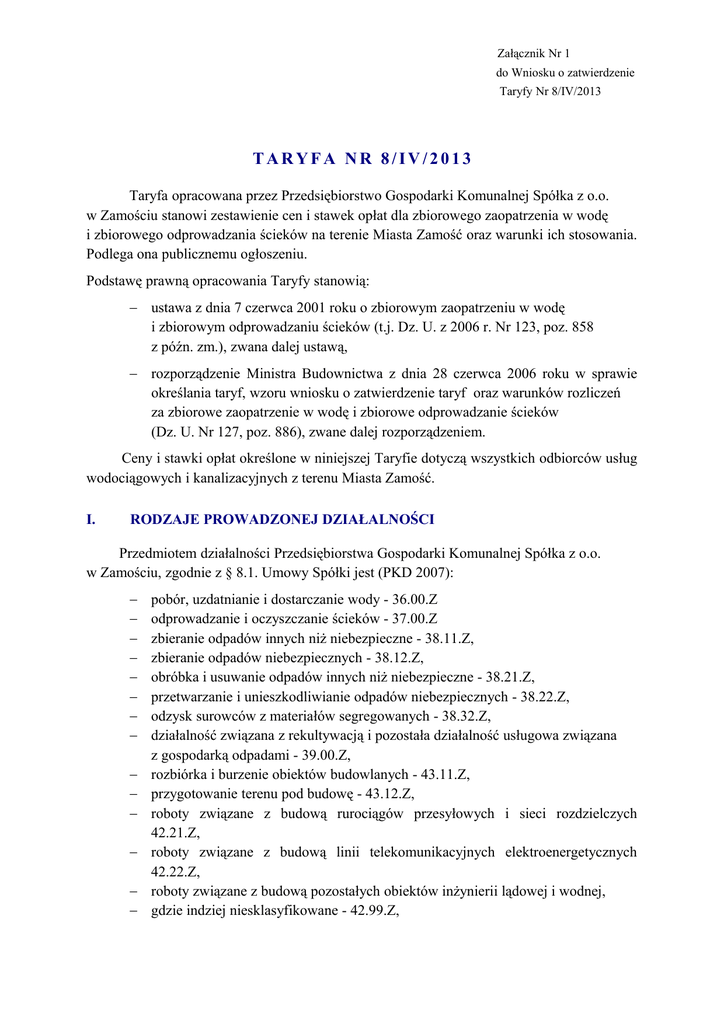 Załącznik Nr 1 do Wniosku o zatwierdzenie Taryfy Nr 8/IV/2013 TARYFA NR 8/IV/2013 Taryfa opracowana przez Przedsiębiorstwo Gospodarki Komunalnej Spółka z o.o. w Zamościu stanowi zestawienie cen i stawek opłat dla zbiorowego zaopatrzenia w wodę i zbiorowego odprowadzania ścieków na terenie Miasta Zamość oraz warunki ich stosowania. Podlega ona publicznemu ogłoszeniu. Podstawę prawną opracowania Taryfy stanowią: − ustawa z dnia 7 czerwca 2001 roku o zbiorowym zaopatrzeniu w wodę i zbiorowym odprowadzaniu ścieków (t.j. Dz. U. z 2006 r. Nr 123, poz. 858 z późn. zm.), zwana dalej ustawą, − rozporządzenie Ministra Budownictwa z dnia 28 czerwca 2006 roku w sprawie określania taryf, wzoru wniosku o zatwierdzenie taryf oraz warunków rozliczeń za zbiorowe zaopatrzenie w wodę i zbiorowe odprowadzanie ścieków (Dz. U. Nr 127, poz. 886), zwane dalej rozporządzeniem. Ceny i stawki opłat określone w niniejszej Taryfie dotyczą wszystkich odbiorców usług wodociągowych i kanalizacyjnych z terenu Miasta Zamość. I. RODZAJE PROWADZONEJ DZIAŁALNOŚCI Przedmiotem działalności Przedsiębiorstwa Gospodarki Komunalnej Spółka z o.o. w Zamościu, zgodnie z § 8.1. Umowy Spółki jest (PKD 2007): − − − − − − − − − − − − − − pobór, uzdatnianie i dostarczanie wody - 36.00.Z odprowadzanie i oczyszczanie ścieków - 37.00.Z zbieranie odpadów innych niż niebezpieczne - 38.11.Z, zbieranie odpadów niebezpiecznych - 38.12.Z, obróbka i usuwanie odpadów innych niż niebezpieczne - 38.21.Z, przetwarzanie i unieszkodliwianie odpadów niebezpiecznych - 38.22.Z, odzysk surowców z materiałów segregowanych - 38.32.Z, działalność związana z rekultywacją i pozostała działalność usługowa związana z gospodarką odpadami - 39.00.Z, rozbiórka i burzenie obiektów budowlanych - 43.11.Z, przygotowanie terenu pod budowę - 43.12.Z, roboty związane z budową rurociągów przesyłowych i sieci rozdzielczych 42.21.Z, roboty związane z budową linii telekomunikacyjnych elektroenergetycznych 42.22.Z, roboty związane z budową pozostałych obiektów inżynierii lądowej i wodnej, gdzie indziej niesklasyfikowane - 42.99.Z, 2 Tar yf a Nr 8/IV/2013 − pozostałe specjalistyczne roboty budowlane, gdzie indziej niesklasyfikowane 43.99.Z, − wykonywanie pozostałych instalacji budowlanych - 43.29.Z, − wykonywanie instalacji wodno - kanalizacyjnych, cieplnych, gazowych i klimatyzacyjnych - 43.22.Z, − wykonywanie instalacji elektrycznych - 43.21.Z, − konserwacja i naprawa pojazdów samochodowych, z wyłączeniem motocykli 45.20.Z, − sprzedaż detaliczna paliw do pojazdów silnikowych na stacjach paliw - 47.30.Z, − sprzedaż detaliczna artykułów używanych prowadzona w wyspecjalizowanych sklepach - 47.79.Z, − sprzedaż detaliczna prowadzona przez domy sprzedaży wysyłkowej lub Internet 47.91.Z, − pozostała sprzedaż detaliczna prowadzona poza siecią sklepową, straganami i targowiskami - 47.99.Z, − wynajem i zarządzanie nieruchomościami własnymi lub dzierżawionymi 68.20.Z, − pogrzeby i działalność pokrewna - 96.03.Z, − pozostałe sprzątanie - 81.29.Z, − działalność usługowa związana z zagospodarowaniem terenów zieleni - 81.30.Z. II. RODZAJ I STRUKTURA TARYFY Przedsiębiorstwo ustaliło Taryfę: − niejednolitą – zawierającą różne ceny dla poszczególnych taryfowych grup odbiorców za dostarczoną wodę i za odprowadzane ścieki, − wieloczłonową – zawierającą ceny i stawki opłat abonamentowych. III. TARYFOWE GRUPY ODBIORCÓW USŁUG Taryfowe grupy odbiorców wyodrębniono na podstawie planowanych kosztów świadczenia usług. Po analizie kosztów zaopatrzenia w wodę i odprowadzania ścieków dokonano podziału odbiorców usług na niżej wymienione grupy taryfowe: − gospodarstwa domowe, − pozostali odbiorcy. Charakterystyka taryfowych grup odbiorców dla zaopatrzenia w wodę: 1) Gospodarstwa domowe: – gospodarstwa domowe w budynkach mieszkalnych jedno i wielorodzinnych, – właściciele i zarządcy budynków, – wspólnoty mieszkaniowe, – Miasto Zamość za wodę pobraną z publicznych studni i zdrojów ulicznych. 2) Pozostali odbiorcy: − odbiorcy wody nie wymienieni w punkcie 1, Tar yf a Nr 8/IV/2013 3 − Miasto Zamość za wodę zużytą do zasilania publicznych fontann, zraszania ulic i terenów zielonych, oraz na cele przeciwpożarowe. Charakterystyka taryfowych grup odbiorców dla odprowadzania ścieków: 1) Gospodarstwa domowe: – gospodarstwa domowe w budynkach mieszkalnych jedno i wielorodzinnych, – właściciele i zarządcy budynków, – wspólnoty mieszkaniowe, 2) Pozostali odbiorcy: − odbiorcy usług nie wymienieni w punkcie 1. IV. RODZAJE I WYSOKOŚĆ CEN I STAWEK OPŁAT W rozliczeniach z odbiorcami usług będą stosowane następujące ceny i stawki opłat: 1) Ceny netto wyrażone w zł za 1 m3 (1000 litrów) wynoszą: a. za dostarczoną wodę: − 2,13 zł dla gospodarstw domowych, − 2,46 zł dla pozostałych odbiorców, b. za odprowadzone i oczyszczone ścieki: − 3,73 zł dla gospodarstw domowych, − 4,24 zł dla pozostałych odbiorców. 2) Stawki netto opłat abonamentowych wyrażonych w zł na odbiorcę usług za okres rozliczeniowy: − 4,40 zł za odczyt wodomierza głównego, urządzenia pomiarowego lub wodomierza odbiorcy zainstalowanego na innych źródłach dostawy wody niż sieć miejska, − 3,04 zł za odczyt wodomierza dodatkowego określającego ilość wody bezpowrotnie zużytej, − 3,35 zł za odczyt wodomierza lokalowego w budynku wielolokalowym, − 5,70 zł za rozliczenie należności za ilość dostarczonej wody i / lub za ilość odprowadzonych ścieków, dotyczy również hydrantów przeciwpożarowych. 3) Stawki netto opłat za przyłączenie do urządzeń wodociągowo-kanalizacyjnych, będących w posiadaniu Przedsiębiorstwa, wynikających z kosztów przeprowadzenia prób technicznych przyłącza wybudowanego przez odbiorcę usług, dla ws