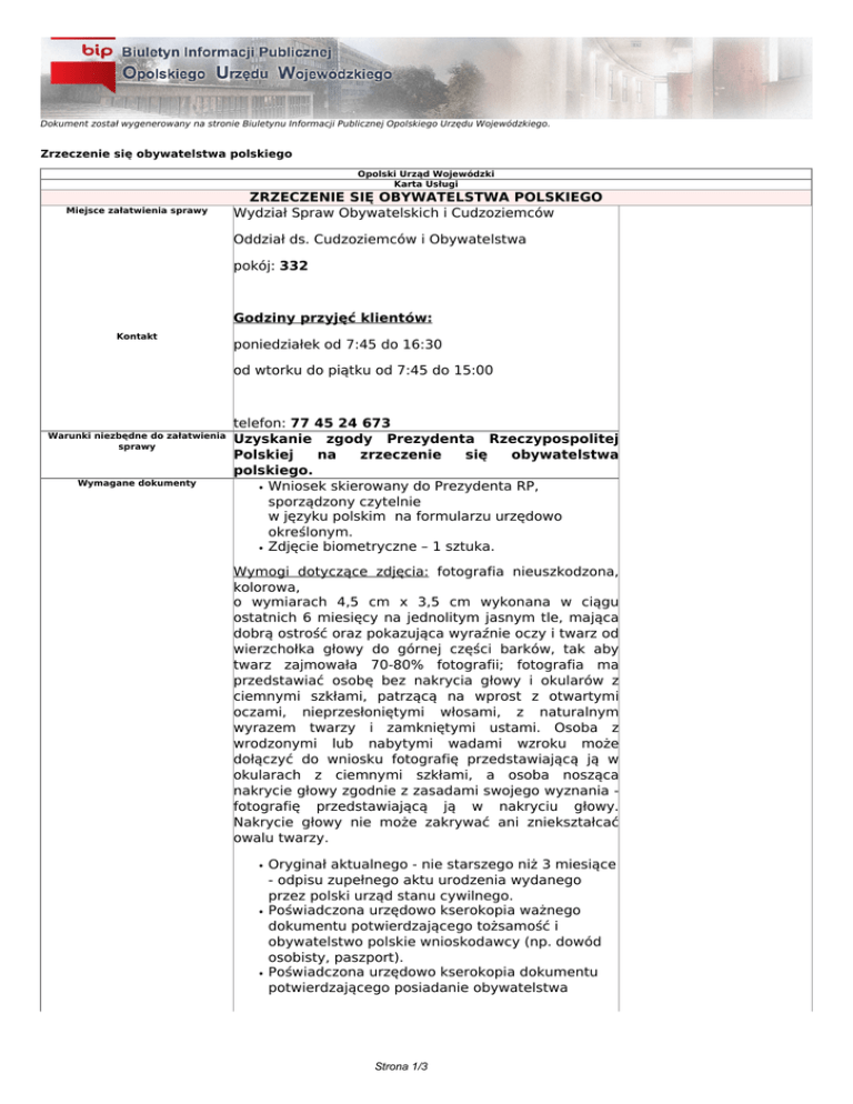 Dokument został wygenerowany na stronie Biuletynu Informacji Publicznej Opolskiego Urzędu Wojewódzkiego. Zrzeczenie się obywatelstwa polskiego Opolski Urząd Wojewódzki Karta Usługi Miejsce załatwienia sprawy ZRZECZENIE SIĘ OBYWATELSTWA POLSKIEGO Wydział Spraw Obywatelskich i Cudzoziemców Oddział ds. Cudzoziemców i Obywatelstwa pokój: 332 Godziny przyjęć klientów: Kontakt poniedziałek od 7:45 do 16:30 od wtorku do piątku od 7:45 do 15:00 Warunki niezbędne do załatwienia sprawy Wymagane dokumenty telefon: 77 45 24 673 Uzyskanie zgody Prezydenta Rzeczypospolitej Polskiej na zrzeczenie się obywatelstwa polskiego. Wniosek skierowany do Prezydenta RP, sporządzony czytelnie w języku polskim na formularzu urzędowo określonym. Zdjęcie biometryczne – 1 sztuka. Wymogi dotyczące zdjęcia: fotografia nieuszkodzona, kolorowa, o wymiarach 4,5 cm x 3,5 cm wykonana w ciągu ostatnich 6 miesięcy na jednolitym jasnym tle, mająca dobrą ostrość oraz pokazująca wyraźnie oczy i twarz od wierzchołka głowy do górnej części barków, tak aby twarz zajmowała 70-80% fotografii; fotografia ma przedstawiać osobę bez nakrycia głowy i okularów z ciemnymi szkłami, patrzącą na wprost z otwartymi oczami, nieprzesłoniętymi włosami, z naturalnym wyrazem twarzy i zamkniętymi ustami. Osoba z wrodzonymi lub nabytymi wadami wzroku może dołączyć do wniosku fotografię przedstawiającą ją w okularach z ciemnymi szkłami, a osoba nosząca nakrycie głowy zgodnie z zasadami swojego wyznania fotografię przedstawiającą ją w nakryciu głowy. Nakrycie głowy nie może zakrywać ani zniekształcać owalu twarzy. Oryginał aktualnego - nie starszego niż 3 miesiące - odpisu zupełnego aktu urodzenia wydanego przez polski urząd stanu cywilnego. Poświadczona urzędowo kserokopia ważnego dokumentu potwierdzającego tożsamość i obywatelstwo polskie wnioskodawcy (np. dowód osobisty, paszport). Poświadczona urzędowo kserokopia dokumentu potwierdzającego posiadanie obywatelstwa Strona 1/3 innego państwa lub przyrzeczenie jego nadania. Aktualnie wydany odpis aktu małżeństwa w oryginale wydany przez polski urząd stanu cywilnego. Poświadczona urzędowo kserokopia ważnego dokumentu potwierdzającego tożsamość i obywatelstwo małżonka wnioskodawcy (np. paszport, dokument podróży, dokument tożsamości obywatela UE). Obywatel polski sprawujący władzę rodzicielską nad małoletnim umieszcza dodatkowo we wniosku: Zdjęcie biometryczne małoletniego spełniające wcześniej opisane wymogi. Oryginał aktualnego - nie starszego niż 3 miesiące - odpisu aktu urodzenia małoletniego wydanego przez polski urząd stanu cywilnego. Kserokopię ważnego dokumentu potwierdzającego tożsamość i obywatelstwo polskie małoletniego. Poświadczoną urzędowo kserokopię dokumentu potwierdzającego posiadanie przez małoletniego obywatelstwa innego państwa lub przyrzeczenie jego nadania. Oświadczenie o wyrażeniu zgody na utratę przez małoletniego obywatelstwa polskiego przyjmowane do protokołu od drugiego z rodziców przez: - właściwego miejscowo wojewodę zamieszkuje w Polsce, - jeżeli rodzic ten - polskiego konsula - od osoby zamieszkałej za granicą lub przebywającej w Polsce na podstawie wizy lub w ruchu bezwizowym. W przypadku złożenia oświadczenia przed innym wojewodą lub konsulem, należy załączyć dokument, potwierdzający tę informację. Oświadczenie małoletniego, który ukończył 16 lat, o wyrażeniu zgody na utratę obywatelstwa polskiego przyjmowane do protokołu przez: - właściwego miejscowo wojewodę zamieszkuje w Polsce, - polskiego konsula za granicą. Opłaty Termin składania dokumentów Termin załatwienia sprawy Podstawa prawna - jeżeli małoletni - od małoletniego zamieszkałego W przypadku złożenia oświadczenia przed innym wojewodą lub konsulem, należy załączyć dokument potwierdzający tę informację. brak Przekazanie wniosku o wyrażenie zgody na zrzeczenie się obywatelstwa polskiego Ministrowi Spraw Wewnętrznych następuje niezwłocznie. Utrata obywatelstwa polskiego następuje po upływie 30 dni od dnia wydania postanowienia Prezydenta RP, jeśli w postanowieniu nie wskazano innego terminu. Ustawa z dnia 2 kwietnia 2009 r. o obywatelstwie Strona 2/3 polskim (Dz. U. z 2012 r., poz. 161). Dodatkowe informacje Prezydent RP wyraża zgodę na zrzeczenie się obywatelstwa polskiego lub odmawia jej wyrażenia w formie postanowienia. Wniosek o wyrażenie zgody na zrzeczenie się obywatelstwa polskiego składa się osobiście lub korespondencyjniez podpisem urzędowo poświadczonym za pośrednictwem właściwego miejscowo wojewody lub konsula. Wyrażenie zgody na zrzeczenie się obywatelstwa polskiego przez małoletniego pozostającego pod wyłączną władzą rodzicielską osoby lub osób nieposiadających obywatelstwa polskiego następuje na wniosek jego przedstawicieli ustawowych. Odmowa wyrażenia zgody na zrzeczenie się obywatelstwa polskiego nie wymaga uzasadnienia oraz nie podlega zaskarżeniu. W sprawach wyrażenia zgody na zrzeczenie obywatelstwa polskiego nie stosuje się przepisów Kodeksu postępowania administracyjnego, za wyjątkiem przepisów dot. doręczeń. Akty stanu cywilnego należy złożyć w oryginale, pozostałe dokumenty można poświadczyć urzędowo: - odpłatnie - u polskiego notariusza, - bezpłatnie - w Opolskim Urzędzie Wojewódzkim w Opolu przy składaniu wniosku. Należy wówczas przedłożyć oryginał dokumentu do wglądu oraz wykonane we własnym zakresie kserokopie. Tryb odwoławczy Informacje redakcyjne Dokumenty sporządzone w języku obcym składa się wraz z ich tłumaczeniem na język polski sporządzonym lub poświadczonym przez tłumacza przysięgłego lub polskiego konsula (art. 12 ustawy o obywatelstwie polskim). Opracowała: Agnieszka Kwiecień Pliki załączone do artykułu: Aneks do wniosku dla maloletniego- zrzeczenie.pdf (29.77 KB) Formularz wniosku o wyrazenie zgody na zrz