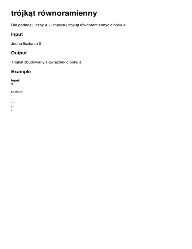 trójkąt równoramienny Dla podanej liczby a > 0 narysuj trójkąt równoramiennyc o boku a. Input Jedna liczba a>0 Output Trójkąt zbudowany z gwiazdek o boku a. Example Input: 3 Output: * ** *** ** *