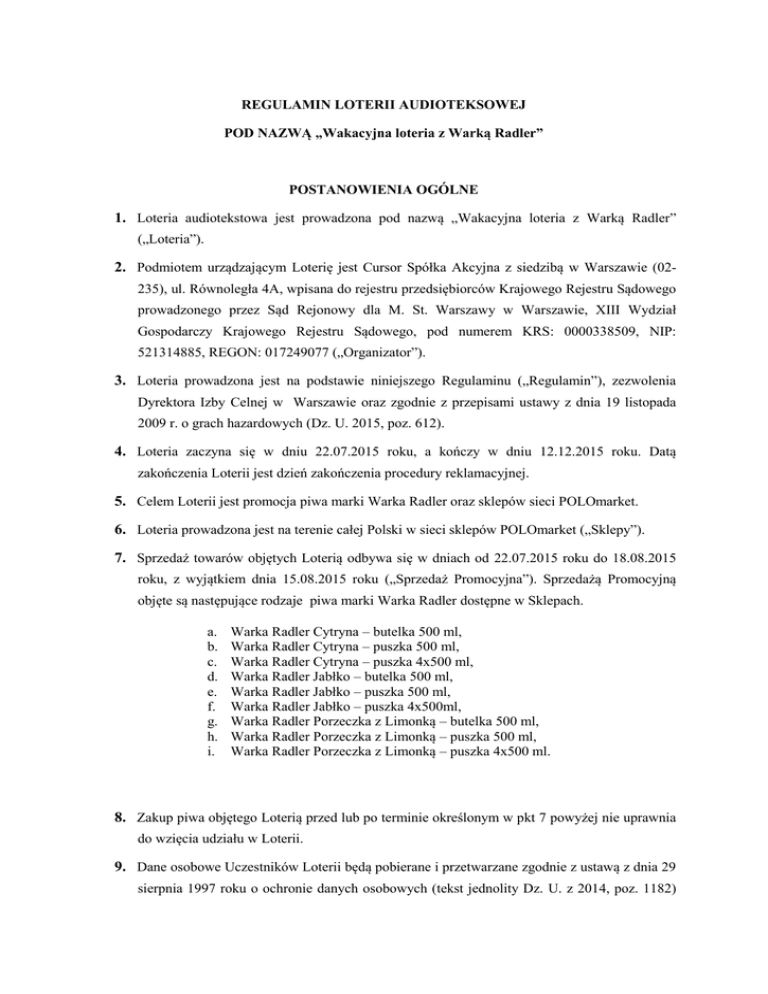 REGULAMIN LOTERII AUDIOTEKSOWEJ POD NAZWĄ „Wakacyjna loteria z Warką Radler” POSTANOWIENIA OGÓLNE 1. Loteria audiotekstowa jest prowadzona pod nazwą „Wakacyjna loteria z Warką Radler” („Loteria”). 2. Podmiotem urządzającym Loterię jest Cursor Spółka Akcyjna z siedzibą w Warszawie (02235), ul. Równoległa 4A, wpisana do rejestru przedsiębiorców Krajowego Rejestru Sądowego prowadzonego przez Sąd Rejonowy dla M. St. Warszawy w Warszawie, XIII Wydział Gospodarczy Krajowego Rejestru Sądowego, pod numerem KRS: 0000338509, NIP: 521314885, REGON: 017249077 („Organizator”). 3. Loteria prowadzona jest na podstawie niniejszego Regulaminu („Regulamin”), zezwolenia Dyrektora Izby Celnej w Warszawie oraz zgodnie z przepisami ustawy z dnia 19 listopada 2009 r. o grach hazardowych (Dz. U. 2015, poz. 612). 4. Loteria zaczyna się w dniu 22.07.2015 roku, a kończy w dniu 12.12.2015 roku. Datą zakończenia Loterii jest dzień zakończenia procedury reklamacyjnej. 5. Celem Loterii jest promocja piwa marki Warka Radler oraz sklepów sieci POLOmarket. 6. Loteria prowadzona jest na terenie całej Polski w sieci sklepów POLOmarket („Sklepy”). 7. Sprzedaż towarów objętych Loterią odbywa się w dniach od 22.07.2015 roku do 18.08.2015 roku, z wyjątkiem dnia 15.08.2015 roku („Sprzedaż Promocyjna”). Sprzedażą Promocyjną objęte są następujące rodzaje piwa marki Warka Radler dostępne w Sklepach. a. b. c. d. e. f. g. h. i. Warka Radler Cytryna – butelka 500 ml, Warka Radler Cytryna – puszka 500 ml, Warka Radler Cytryna – puszka 4x500 ml, Warka Radler Jabłko – butelka 500 ml, Warka Radler Jabłko – puszka 500 ml, Warka Radler Jabłko – puszka 4x500ml, Warka Radler Porzeczka z Limonką – butelka 500 ml, Warka Radler Porzeczka z Limonką – puszka 500 ml, Warka Radler Porzeczka z Limonką – puszka 4x500 ml. 8. Zakup piwa objętego Loterią przed lub po terminie określonym w pkt 7 powyżej nie uprawnia do wzięcia udziału w Loterii. 9. Dane osobowe Uczestników Loterii będą pobierane i przetwarzane zgodnie z ustawą z dnia 29 sierpnia 1997 roku o ochronie danych osobowych (tekst jednolity Dz. U. z 2014, poz. 1182) w celu przeprowadzenia Loterii. 10. Administratorem danych osobowych zebranych podczas Loterii jest - w rozumieniu wspomnianej wyżej ustawy - Cursor Spółka Akcyjna z siedzibą w Warszawie (02-235), ul. Równoległa 4A. Uczestnicy mają prawo dostępu do swoich danych osobowych, jak również żądania ich poprawiania lub usunięcia. Podanie danych osobowych jest dobrowolne, choć niezbędne dla prawidłowego przeprowadzenia Loterii i wydania nagród. ZASADY PROWADZENIA LOTERII 11. Loteria przeznaczona jest dla osób fizycznych, które ukończyły 18 lat, zamieszkałych na terenie Polski, dokonujących zakupu produktów objętych Loterią wskazanych w pkt 7 Regulaminu. 12. Aby zostać uczestnikiem Loterii („Uczestnik“) należy w okresie Sprzedaży Promocyjnej (tj. w dniach od 22.07.2015 roku do 18.08.2015 roku) spełnić łącznie następujące warunki: a. Dokonać w dowolnym Sklepie zakupu co najmniej 4 piw objętych Loterią udokumentowanego na jednym dowodzie zakupu (faktura lub paragon fiskalny) („Zakup Promocyjny”), b. dokonać prawidłowego zgłoszenia w Loterii („Zgłoszenie”) w sposób określony w pkt 14 Regulaminu, nie wcześniej niż po dokonaniu Zakupu Promocyjnego. 13. Uczestnik jest zobowiązany zachować dowód Zakupu Promocyjnego (faktura lub paragon fiskalny) w celu potwierdzenia uprawnień do ewentualnej nagrody, z zastrzeżeniem, iż data na dowodzie Zakupu Promocyjnego nie może być późniejsza niż dzień dokonania Zgłoszenia. 14. Prawidłowe Zgłoszenie udziału w Loterii, dla swej ważności i skuteczności, wymaga w terminie od godz. 00:00:00 dnia 22.07.2015 roku do godz. 23:59:59 dnia 18.08.2015 roku: przesłania wiadomości tekstowej SMS zawierającej w swojej treści: RADLER (pisane małymi lub wielkimi literami) oraz numer dowodu zakupu. Przykładowo: RADLER.123456. Poszczególne treści sms-a mogą być oddzielone spacją, dowolnym znakiem interpunkcyjnym lub wpisane łącznie. SMS należy przesłać na numer: 71826. Koszt przesłania SMS-a wynosi 1 zł netto plus podatek VAT (1,23 zł z VAT) niezależnie od operatora. Podany koszt dotyczy SMS-a zawierającego nie więcej niż 160 znaków (włącznie z prefiksem, ze spacjami oraz znakami interpunkcyjnymi), z zastrzeżeniem, że w przypadku użycia w treści SMS-a przynajmniej jednego polskiego znaku, podany koszt liczony jest za SMS-a zawierającego nie więcej niż 70 znaków. Opłata w wysokości 1,23 zł brutto jest pobierana niezależnie od tego, czy Zgłoszenie udziału w Loterii jest prawidłowe czy nie. Koszt przesłania SMS-a ponosi Uczestnik. SMS należy przesłać przy użyciu telefonu, w Loterii nie będą uwzględniane SMSy przesyłane za pomocą Internetu lub z użyciem programów lub robotów komputerowych. Dokonanie Zgłoszenia zostanie potwierdzone SMS-em zwrotnym na numer telefonu, z którego zostało wysłane Zgłoszenie. Koszt SMS-a zwrotnego ponosi Organizator. Szczegółowe zasady naliczania opłaty za SMS-a oraz treści SMS-ów zwrotnych zawiera załącznik nr 1 do Regulaminu. 15. Uczestnik może przesłać dowolną liczbę Zgłoszeń. Aby przesłać kolejne Zgłoszenie należy dokonać kolejnego Zakupu Promocyjnego. W przypadku, gdy Uczestnik dokona jednorazowego zakupu (na jednym dowodzie zakupu) wielokrotności 4 piw objętych Loterią, wówczas przysługuje mu prawo do wysyłki odpowiedniej liczby Zgłoszeń według zasady, że za każde zakupione 4 piwa objęte Loterią przysługuje Uczestnikowi prawo do wysłania jednego Zgłoszenia, np. Uczestnik zakupił 10 piw objętych Loterią, więc może wysłać 2 Zgłoszenia w Loterii. Jeden dowód zakupu może być podstawą do wielu Zgłoszeń w Loterii pod warunkiem spełnienia warunków regulaminowych 16. Prawidłowe Zgłoszenia, które zostaną wysłane i zarej