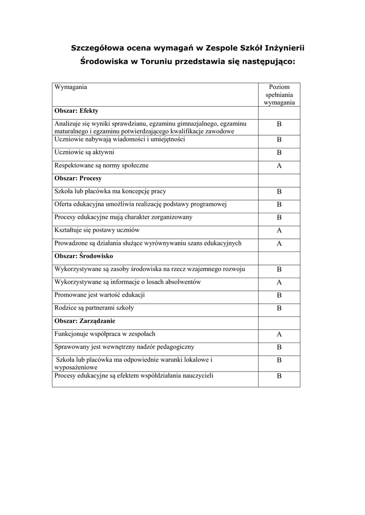 Szczegółowa ocena wymagań w Zespole Szkół Inżynierii Środowiska w Toruniu przedstawia się następująco: Wymagania Poziom spełniania wymagania Obszar: Efekty Analizuje się wyniki sprawdzianu, egzaminu gimnazjalnego, egzaminu maturalnego i egzaminu potwierdzającego kwalifikacje zawodowe Uczniowie nabywają wiadomości i umiejętności B Uczniowie są aktywni B Respektowane są normy społeczne A B Obszar: Procesy Szkoła lub placówka ma koncepcję pracy B Oferta edukacyjna umożliwia realizację podstawy programowej B Procesy edukacyjne mają charakter zorganizowany B Kształtuje się postawy uczniów A Prowadzone są działania służące wyrównywaniu szans edukacyjnych A Obszar: Środowisko Wykorzystywane są zasoby środowiska na rzecz wzajemnego rozwoju B Wykorzystywane są informacje o losach absolwentów A Promowane jest wartość edukacji B Rodzice są partnerami szkoły B Obszar: Zarządzanie Funkcjonuje współpraca w zespołach A Sprawowany jest wewnętrzny nadzór pedagogiczny B Szkoła lub placówka ma odpowiednie warunki lokalowe i wyposażeniowe Procesy edukacyjne są efektem współdziałania nauczycieli B B