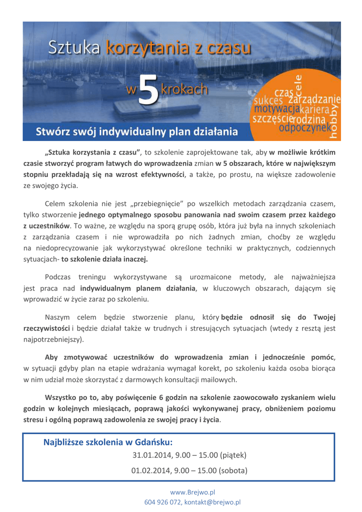 „Sztuka korzystania z czasu”, to szkolenie zaprojektowane tak, aby w możliwie krótkim czasie stworzyć program łatwych do wprowadzenia zmian w 5 obszarach, które w największym stopniu przekładają się na wzrost efektywności, a także, po prostu, na większe zadowolenie ze swojego życia. Celem szkolenia nie jest „przebiegnięcie” po wszelkich metodach zarządzania czasem, tylko stworzenie jednego optymalnego sposobu panowania nad swoim czasem przez każdego z uczestników. To ważne, ze względu na sporą grupę osób, która już była na innych szkoleniach z zarządzania czasem i nie wprowadziła po nich żadnych zmian, choćby ze względu na niedoprecyzowanie jak wykorzystywać określone techniki w praktycznych, codziennych sytuacjach- to szkolenie działa inaczej. Podczas treningu wykorzystywane są urozmaicone metody, ale najważniejsza jest praca nad indywidualnym planem działania, w kluczowych obszarach, dającym się wprowadzić w życie zaraz po szkoleniu. Naszym celem będzie stworzenie planu, który będzie odnosił się do Twojej rzeczywistości i będzie działał także w trudnych i stresujących sytuacjach (wtedy z resztą jest najpotrzebniejszy). Aby zmotywować uczestników do wprowadzenia zmian i jednocześnie pomóc, w sytuacji gdyby plan na etapie wdrażania wymagał korekt, po szkoleniu każda osoba biorąca w nim udział może skorzystać z darmowych konsultacji mailowych. Wszystko po to, aby poświęcenie 6 godzin na szkolenie zaowocowało zyskaniem wielu godzin w kolejnych miesiącach, poprawą jakości wykonywanej pracy, obniżeniem poziomu stresu i ogólną poprawą zadowolenia ze swojej pracy i życia. Najbliższe szkolenia w Gdańsku: 31.01.2014, 9.00 – 15.00 (piątek) 01.02.2014, 9.00 – 15.00 (sobota) www.Brejwo.pl 604 926 072, [email protected] Sztuka korzystania z czasu w 5 krokach Najbliższe szkolenia otwarte w Gdańsku Piątek, 31.01.2014, 9.00 – 15.00 Sobota, 01.02.2014, 9.00 – 15.00 Przy zgłoszeniu do 26.01.2014: 192zł/os. Zapisy i dodatkowe informacje Tel: 604 926 072 Miejsce: Kampus Oliwa – Uniwersytet Gdański, E-mail: [email protected] Gdańsk, ul. Bażyńskiego (dokładny adres zostanie podany 27.01.2014) www.Brejwo.pl W cenie szkolenia: www.facebook.com/MiroslawBrejwo Na stronie www.Brejwo.pl dostępne są także terminy szkoleń w innych miastach m.in. Gdynia, Elbląg, Toruń. Cena: 244zł/os. (VAT zw.) Materiały szkoleniowe Dyplom ukończenia szkolenia 3 konsultacje mailowe Program szkolenia 5 kroków do wysokiej efektywności osobistej, na których koncentruje się to szkolenie: 1. Ustal, co jest dla Ciebie ważne. 2. Wygraj ze złodziejami czasu. 3. Wykorzystaj najskuteczniejsze techniki zarządzania czasem. 4. Ulepsz swoje nawyki- w wielu przypadkach to one decydują o sukcesie i poczuciu szczęścia. 5. Bądź zmotywowany do działania i przestań odkładać wszystko na później. Metody wykorzystywane podczas szkolenia 1. praca nad indywidualnym planem działania 2. krótkie wykłady połączone z prezentacją multimedialną i filmami, 3. dyskusje i bank doświadczeń, 4. ćwiczenia i gry zespołowe, 5. studia przypadków Mirosław Brejwo Trener zarządzania czasem i efektywności osobistej. Od realizacji pierwszego szkolenia w 2004 roku, podczas spotkań z różnymi grupami odbiorców stara się wspierać Ich rozwój, pokazując jak odnaleźć pasję, polepszyć relacje z ważnymi osobami, stawiać czoła codziennym wyzwaniom, radzić sobie z porażkami i skutecznie osiągać sukcesy. Projektuje programy szkoleniowe, w których szczególny nacisk kładzie na wdrażanie metod, przynoszących wymierne korzyści i dające się od razu wprowadzić w życie. Prowadzi szkolenia i zajęcia z zakresu zarządzania czasem i osiągania celów, radzenia sobie ze stresem, automotywacji, asertywności i twórczego rozwiązywania problemów. Z wykształcenia jest psychologiem, prawnikiem oraz trenerem. Poza prowadzeniem szkoleń i wykładów, posiada doświadczenie m.in. realizowaniu akcji marketingowych, projektów dofinansowanych ze środków EFS i zarządzaniu projektami. Zrealizował około 1500 godzin szkoleń, wykładów i prezentacji. Organizator: mBrejwo Group Mirosław Brejwo, NIP: 604 006 94 03, wpis do rejestru instytucji szkoleniowych nr: 2.22/00153/2012 www.Brejwo.pl 604 926 072, [email protected]