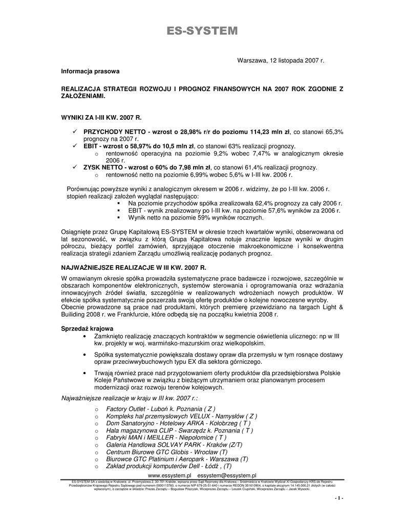 ES-SYSTEM Warszawa, 12 listopada 2007 r. Informacja prasowa REALIZACJA STRATEGII ROZWOJU I PROGNOZ FINANSOWYCH NA 2007 ROK ZGODNIE Z ZAŁOŻENIAMI. WYNIKI ZA I-III KW. 2007 R. PRZYCHODY NETTO - wzrost o 28,98% r/r do poziomu 114,23 mln zł, co stanowi 65,3% prognozy na 2007 r. EBIT - wzrost o 58,97% do 10,5 mln zł, co stanowi 63% realizacji prognozy. o rentowność operacyjna na poziomie 9,2% wobec 7,47% w analogicznym okresie 2006 r. ZYSK NETTO - wzrost o 60% do 7,98 mln zł, co stanowi 61,4% realizacji prognozy. o rentowność netto na poziomie 6,99% wobec 5,6% w I-III kw. 2006 r. Porównując powyższe wyniki z analogicznym okresem w 2006 r. widzimy, że po I-III kw. 2006 r. stopień realizacji założeń wyglądał następująco: Na poziomie przychodów spółka zrealizowała 62,4% prognozy za cały 2006 r. EBIT - wynik zrealizowany po I-III kw. na poziomie 57,6% wyników za 2006 r. Wynik netto na poziomie 59% wyników rocznych. Osiągnięte przez Grupę Kapitałową ES-SYSTEM w okresie trzech kwartałów wyniki, obserwowana od lat sezonowość, w związku z którą Grupa Kapitałowa notuje znacznie lepsze wyniki w drugim półroczu, bieżący portfel zamówień, sprzyjające otoczenie makroekonomiczne i konsekwentna realizacja strategii zdaniem Zarządu umożliwią realizację podanych prognoz. NAJWAŻNIEJSZE REALIZACJE W III KW. 2007 R. W omawianym okresie spółka prowadziła systematyczne prace badawcze i rozwojowe, szczególnie w obszarach komponentów elektronicznych, systemów sterowania i oprogramowania oraz wdrażania innowacyjnych źródeł światła, szczególnie w realizowanych wdrożeniach nowych produktów. W efekcie spółka systematycznie poszerzała swoją ofertę produktów o kolejne nowoczesne wyroby. Obecnie prowadzone są prace nad produktami, których premierę przewidziano na targach Light & Builiding 2008 r. we Frankfurcie, które odbędą się na początku kwietnia 2008 r. Sprzedaż krajowa • Zamknięto realizację znaczących kontraktów w segmencie oświetlenia ulicznego: np w III kw. projekty w woj. warmińsko-mazurskim oraz wielkopolskim. • Spółka systematycznie powiększała dostawy opraw dla przemysłu w tym rosnące dostawy opraw przeciwwybuchowych typu EX dla sektora górniczego. • Trwają również prace nad przygotowaniem oferty produktów dla przedsiębiorstwa Polskie Koleje Państwowe w związku z bieżącym utrzymaniem oraz planowanym procesem modernizacji oraz rozwoju terenów kolejowych. Najważniejsze realizacje w kraju w III kw. 2007 r.: o o o o o o o o o Factory Outlet - Luboń k. Poznania ( Z ) Kompleks hal przemysłowych VELUX - Namysłów ( Z ) Dom Sanatoryjno - Hotelowy ARKA - Kołobrzeg ( T ) Hala magazynowa CLIP - Swarzędz k. Poznania ( T ) Fabryki MAN i MEILLER - Niepołomice ( T ) Galeria Handlowa SOLVAY PARK - Kraków (Z/T) Centrum Biurowe GTC Globis - Wrocław (T) Biurowce GTC Platinium i Aeropark - Warszawa (T) Zakład produkcji komputerów Dell - Łódź , (T) www.essystem.pl [email protected] ES-SYSTEM SA z siedzibą w Krakowie, ul. Przemyslowa 2, 30-701 Kraków, wpisana przez Sąd Rejonowy dla Krakowa – Śródmieścia w Krakowie Wydział XI Gospodarczy KRS do Rejestru Przedsiębiorców Krajowego Rejestru Sądowego pod numerem 0000113760, o numerze NIP 679-25-51-640 i numerze REGON 351610904, o kapitale akcyjnym 14.145.000,21 złotych (w całości wpłaconym), o zarządzie w składzie: Prezes Zarządu – Bogusław Pilszczek, Wiceprezes Zarządu – Leszek Ciupiński, Wiceprezes Zarządu – Jacek Wysocki. -1- ES-SYSTEM o o o o o o o o o Muzeum Sztuki MANUFAKTURA - Łódź (T) Wydział Prawa Uniwersytet Łódzki (T) Teatr Muzyczny - Łódź (T) Centrum Sztuki Współczesnej - Toruń (Z) Stacja Metra A-21 SŁODOWIEC - Warszawa ( Z ) Galeria Handlowa SOLVAY PARK - Kraków (Z/T) Centrum dystrybucyjne Poczty Polskiej CER - Zabrze (Z ) Biurowiec TVP S.A. - Warszawa (T) Budynek Centrali ZUS - Warszawa (T) (Z) – zrealizowany (T) – w trakcie realizacji (Z/T) – zrealizowana część etapów Sprzedaż eksportowa Podstawowe cele w strategii sprzedaży eksportowej to wzrost obrotów przez zwiększenie liczby rynków i rozwój stałej współpracy z partnerami zagranicznymi, opartej na długoletnich umowach partnerskich. • Ekspansja eksportowa realizowana jest głównie na rynkach Unii Europejskiej. • Intensyfikowane są działania na innych rynkach zagranicznych: Syrii, w Libanie, Kanadzie, Kolumbii. • Jeden z ważnych zagranicznych projektów spółki będzie realizowany w IV kw. 2007 r. w Meksyku. Przykładowe realizacje zagraniczne z III kw. 2007 r.: o PALLADIUM centrum biurowo-handlowe - Praga o Oddziały Banku Ceska i Slovenska Sporitelna - Czechy i Słowacja o Show Room BMW - Istambuł o Biuro architektoniczne BENTABOL & RODRIGO ARCHITECTS – Barcelona o SWISS RE – biura - Mexico City o City Park "le Acciaierie" kompleks kinowo-rozrywkowy - Cortenuova (Bergamo) o Oddziały GE MONEY BANK na Słowacji o Kampus Universytetu T. Masarika, Biblioteka i otoczenie - Brno - Bohunice o Sieć sklepów ASDA (grupa WAL-MART) - kolejne 6 obiektów o Centrum rekreacji Fitness, baseny, restauracja - Lleida, Hiszpania W efekcie systematycznej realizacji planów rozwoju eksportu w 3 pierwszych kwartałach 2007 r. udział sprzedaży eksportowej w sprzedaży ogółem wyniósł 25,34%. W porównaniu do analogicznego okresu ubiegłego roku wartość sprzedaży eksportowej wzrosła o 56,5% do poziomu 28,95 mln zł. INWESTYCJE Zgodnie z cyklem inwestycyjnym, prace budowlane hali produkcyjnej i magazynowej w ES SYSTEM Wilkasy zostały zakończone. W hali produkcyjnej trwają instalacje i uruchomienia linii produkcyjnych, hala magazynowa została wyposażona i trwa jej uruchomienie. Dostawy linii produkcyjnych, technologii, maszyn i urządzeń są w trakcie realizacji, zgodnie z założonymi harmonogramami i podpisanymi umowami. Pierwsze efekty działań inwestycyjnych są już widoczne i pozwolą na wzrost mocy produkcyjnych o kilka