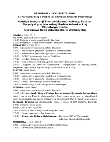 PROGRAM JAKUSZYCE 2016 11 Narciarski Bieg o Puchar im. adwokata Ryszarda Porzyckiego Komisja Integracji Środowiskowej, Kultury, Sportu i Turystyki przy Naczelnej Radzie Adwokackiej Współorganizator Okręgowa Rada Adwokacka w Wałbrzychu ŚRODA – 6.01.2016 Od 16.00 przyjazd uczestników 19.00 Kolacja w restauracji hotelu Biathlon 21.00 Powitanie Toast Noworoczny – Biathlon restauracja, CZWARTEK – 7.01.2016 8.00 śniadanie restauracja hotelu Biathlon 10.00 – szkolenie w grupach godzina z instruktorem 13.00 – szkolenie w grupach – godzina z instruktorem 16.00 – OBIAD restauracja hotelu Biathlon 17.30 – wykład–Tomasz Kałużny 18.30 – demonstracja ćwiczeń „przed sezonem” Tomasz Kałużny 20.00 – Wyjazd „na piwo do Harachowa” – opcjonalnie, na własny koszt, wspólnie, organizator zajmie się przejazdem w obie strony. PIĄTEK 8.01.2016 8.00 śniadanie restauracja hotelu Biathlon 10.00 – szkolenie w grupach godzina z instruktorem 13.00 – szkolenie w grupach – godzina z instruktorem 16.00 – OBIAD restauracja hotelu Biathlon 18.00 – konferencja z zakresu prawa sportowego SOBOTA – 9.01.2016 8.00 śniadanie restauracja hotelu Biathlon 11.00 11 Narciarski Bieg o Puchar im. adwokata Ryszarda Porzyckiego start i meta na Polanie Jakuszyckiej, bieg rozgrywany jest w klasyfikacji open bez podziału na grupy wiekowe, w kategoriach Pań i Panów oraz Dzieci, techniką dowolną na dystansach: Panie i Dzieci 2 500 metrów, Panowie 5 000 metrów, trasy łatwe. WRĘCZENIE PUCHARÓW 15.00– obiad w restauracji hotelowej Biathlonu. 17.00 Prawo sportowe – konferencja: 19.00 – Uroczysta Kolacja Dziekańska – Dziekan ORA w Wałbrzychu adwokat Wojciech Biegański NIEDZIELA – 10.01.2016 8.00 – śniadanie w restauracji hotelowej Biathlonu 13.00 – obowiązek opuszczenia pokoi. WYJAZD Organizator prosi o wyrozumiałość w wypadku zmian w programie z przyczyn od niego niezależnych