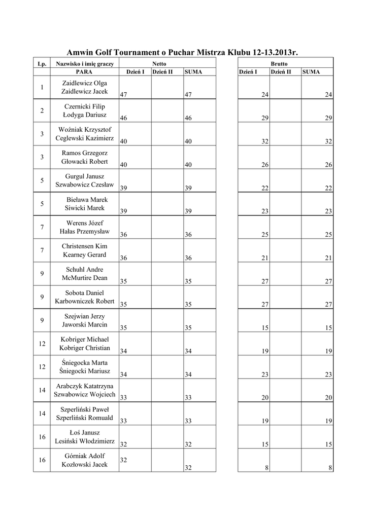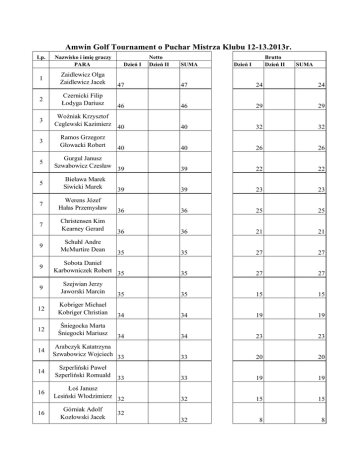 Amwin Golf Tournament o Puchar Mistrza Klubu 12-13.2013r. Lp. 1 2 3 3 5 5 7 7 9 9 9 12 12 14 14 16 16 Nazwisko i imię graczy PARA Dzień I Netto Dzień II SUMA Brutto Dzień II Dzień I SUMA Zaidlewicz Olga Zaidlewicz Jacek 47 47 24 24 Czernicki Filip Łodyga Dariusz 46 46 29 29 Woźniak Krzysztof Ceglewski Kazimierz 40 40 32 32 40 40 26 26 Gurgul Janusz Szwabowicz Czesław 39 39 22 22 Ramos Grzegorz Głowacki Robert Bieława Marek Siwicki Marek 39 39 23 23 Werens Józef Hałas Przemysław 36 36 25 25 Christensen Kim Kearney Gerard 36 36 21 21 Schuhl Andre McMurtire Dean 35 35 27 27 Sobota Daniel Karbowniczek Robert 35 35 27 27 Szejwian Jerzy Jaworski Marcin 35 35 15 15 Kobriger Michael Kobriger Christian 34 34 19 19 Śniegocka Marta Śniegocki Mariusz 34 34 23 23 Arabczyk Katatrzyna Szwabowicz Wojciech 33 33 20 20 33 33 19 19 Łoś Janusz Lesiński Włodzimierz 32 32 15 15 32 8 8 Szperliński Paweł Szperliński Romuald Górniak Adolf Kozłowski Jacek 32 18 19 20 21 22 22 24 Kaczmarek Marek Kaczmarek Robert 31 31 13 13 Śniegocka Marzena Śniegocki Maksymilian 30 30 14 14 Otto Hans Jorg Kobriger Patrick 29 29 13 13 Kozłowska Bożena Kozłowski Maciej 27 27 14 14 Szramowski Jerzy Piechowski Piotr 26 26 13 13 Zawistowski Piotr Zawistowski Andrzej 26 26 8 8 25 5 5 Pieński Maciej Iwasiewicz Piotr 25