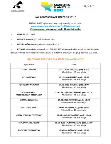 JAK ZGŁOSIĆ KLASĘ DO PROJEKTU? FORMULARZ zgłoszeniowy znajduje się na stronie: www.akademia.planetedocff.pl/jak-dolaczyc/ Zgłoszenia przyjmowane są do 10 października • CENA BILETU: 10 zł • MIEJSCE: KINO Iluzjon | ul. Narbutta 50a • OPIS FILMÓW: www.akademia.planetedocff.pl • PYTANIA: [email protected], tel.: 668 160 433 lub [email protected], tel. 662 099 400 Istnieje również możliwość umówienia się na inny termin projekcji – dla grup powyżej 100 osób. KALENDARZ PROJEKCJI DLA SZKÓŁ GIMNAZJALNYCH Tytuł filmu Data EFEKT CHOPINA 21.11. 2014 (PIĄTEK), godz. 12:00 50 min film + 45 min lekcja BYŁ SOBIE LAS 12.12.2014 (PIĄTEK), godz. 12:00 78 min film + 45 min lekcja FOTOGRAF WOJENNY 07.01.2015 (ŚRODA), godz.12:00 54 min film + 45 min lekcja #CHICAGOGIRL. FACEBOOKOWA REWOLUCJA 23.02.2015 (PONIEDZIAŁEK), godz.12:00 74 min film + 45 min lekcja KRAINA SZCZĘŚCIA 17.03.2015 (WTOREK), godz. 12:00 80 min film + 45 min lekcja WIĘCEJ NIŻ MIÓD 29.04.2015 (ŚRODA), godz. 12:00 90 min film + 45 min lekcja KREW W MOIM TELEFONIE 07.05.2015 (CZWARTEK), godz. 12:00 56 min film + 45 min lekcja KRAJOBRAZ BEZ LUDZI 15.06 2015 (PONIEDZIAŁEK), godz. 12:00 55 min film + 45 min lekcja ROCKOWE DZIEWCZYNY 17.06 2015 (ŚRODA), godz. 12:00 90 min film + 45 min lekcja