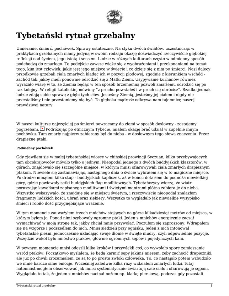 Tybetański rytuał grzebalny Umieranie, śmierć, pochówek. Sprawy ostateczne. Na styku dwóch światów, uczestnicząc w praktykach grzebalnych mamy jedyną w swoim rodzaju okazję doświadczyć rzeczywiście głębokiej refleksji nad życiem, jego istotą i sensem. Ludzie w różnych kulturach często w odmienny sposób podchodzą do zmarłego. To podejście zawsze wiąże się z wyobrażeniami i przekonaniami na temat tego, kim jest człowiek, jakie jest jego miejsce w świecie i co dzieje się z nim po śmierci. Nasi dalecy przodkowie grzebali ciała zmarłych kładąc ich w pozycji płodowej, zgodnie z kierunkiem wschód zachód tak, jakby mieli ponownie odrodzić się z Matki Ziemi. Usypywanie kurhanów również wyrażało wiarę w to, że Ziemia będąc w ten sposób brzemienną pozwoli zmarłemu odrodzić się po raz kolejny. W religii katolickiej mówimy "z prochu powstałeś i w proch się obrócisz". Rzadko jednak ludzie zdają sobie sprawę z głębi tych słów. Jesteśmy Ziemią, jesteśmy jej ciałem i nigdy nie przestaliśmy i nie przestaniemy nią być. Ta głęboka mądrość odkrywa nam tajemnicę naszej prawdziwej natury. W naszej kulturze najczęściej po śmierci powracamy do ziemi w sposób dosłowny - zostajemy pogrzebani. Podróżując po etnicznym Tybecie, miałem okazję brać udział w zupełnie innym pochówku. Tam zmarły najpierw zabierany był do nieba - w dosłownym tego słowa znaczeniu. Przez drapieżne ptaki. Podniebny pochówek Gdy zjawiłem się w małej tybetańskiej wiosce w chińskiej prowincji Syczuan, kilku przebywających tam obcokrajowców mówiło tylko o jednym. Nieopodal jednego z dwóch buddyjskich klasztorów, w górach, znajdowało się szczególne miejsce, w którym mnisi ofiarowywali ciała zmarłych drapieżnym ptakom. Niewiele się zastanawiając, następnego dnia o świcie wybrałem się w to magiczne miejsce. Po drodze minąłem kilka stup - buddyjskich kapliczek, aż w końcu dotarłem do podnóża niewielkiej góry, gdzie powiewały setki buddyjskich flag modlitewnych. Tybetańczycy wierzą, że wiatr poruszając kawałkami zapisanego modlitwami i świętymi mantrami płótna zabiera je do nieba. Wszystko wskazywało, że znajduję się w miejscu świętym, i rzeczywiście nieopodal znalazłem fragmenty ludzkich kości, ubrań oraz siekiery. Wszystko to wyglądało jak niewielkie wysypisko śmieci i robiło dość przygnębiające wrażenie. W tym momencie zauważyłem trzech mnichów stojących na górze kilkadziesiąt metrów od miejsca, w którym byłem ja. Ponad nimi szybowały ogromne ptaki. Jeden z mnichów energicznie zaczął wymachiwać w moją stronę tak, jakby chciał mnie przywołać. Poczułem się zaproszony. Wdrapałem się na wzgórze i podszedłem do nich. Mnisi siedzieli przy ognisku. Jeden z nich intonował tybetańskie pieśni, jednocześnie układając swoje dłonie w święte mudry, czyli odpowiednie pozycje. Wszędzie wokół było mnóstwo ptaków, głównie ogromnych sępów i pojedynczych kani. W pewnym momencie mnisi odeszli kilka kroków i przywlekli coś, co wywołało spore zamieszanie wśród ptaków. Początkowo myślałem, że będą karmić sępy jakimś mięsem, żeby zachęcić drapieżniki, ale już po chwili zrozumiałem, że są to po prostu zwłoki człowieka. To, co nastąpiło potem wzbudziło we mnie bardzo silne emocje. Wcześniej zaledwie kilka razy widziałem zmarłych ludzi, tutaj natomiast mogłem obserwować jak mnisi systematycznie ćwiartują całe ciało i ofiarowują je sępom. Wyglądało to tak, że jeden z mnichów nacinał nożem np. klatkę piersiową, podczas gdy pozostali Tybetański rytuał grzebalny 1 dwaj odganiali sępy. W momencie pojawienia się krwi i mięśni, ptaki dosłownie rzucały się na ciało i w ciągu zaledwie kilkunastu sekund połykały wnętrzności. Następnie mnisi siekierami i nożami odcinali kończyny nacinając je tak, żeby ptaki mogły oczyścić je do samych kości. Te zaś miażdżyli siekierami i również ofiarowywali ptakom. Ekologiczna mądrość Tybetańczyków Podniebny pochówek łączy w sobie pragmatyzm Tybetańczyków oraz ich szamańsko-buddyjskie wierzenia. W Tybecie rośnie niewiele lasów, a drewno jest bardzo cennym materiałem. Kremacja zwłok jest więc bardzo trudnym i drogim przedsięwzięciem. Podobnie jest z grzebaniem ciała w ziemi. Górska gleba pełna skał nie nadaje się do kopania głębokich dołów, poza tym w surowym klimacie przez większość roku jest tak zamarznięta, że nie można jej ruszyć Tybetańczycy wierzą w podstawową jedność wszechświata. Człowiek jest jego częścią, zatem umierając wraca ponownie do kręgu życia. Tutaj dzieje się to poprzez sępy, które unoszą zmarłego wysoko pod niebiosa jednocześnie włączając go w obieg życia. Poza tym buddyzm uczy, że należy dawać siebie zarówno innym ludziom, jak i naturze. Wydaje się więc zrozumiałe, że po śmierci ofiarowuje się ciało ptakom. Mimo więc zdecydowanie negatywnej postawy wobec tego rytuału, wyrażanej przez Chińczyków, którzy określają go jako barbarzyński i niecywilizowany oraz niezrozumienia i oburzenia, jakie rodzi się w umysłach niektórych turystów z Zachodu, ten rodzaj pochówku wyraża głęboko ekologiczną mądrość starożytnej kultury i religii tybetańskiej. Zwyczaj ofiarowania ciała zmarłych sępom przywędrował do Tybetu ze starożytnej Turcji i Persji. Już kilka tysięcy lat temu w Anatolii sępy pożerały zmarłych, a ich kości następnie gromadzono w domach. Wyznawcy Zoroastra natomiast umieszczali zmarłych w Wieżach Milczenia, do których zlatywały się sępy. Persowie migrując w VI w. do Indii, zachowali ten zwyczaj, który następnie przywędrował do Tybetu i tam przetrwał do dzisiejszych czasów. Doświadczenie jedności Cała ceremonia podniebnego pochówku trwała około dwóch godzin. Siedziałem tam jak zamurowany, targany silnymi emocjami: przerażeniem, poczuc