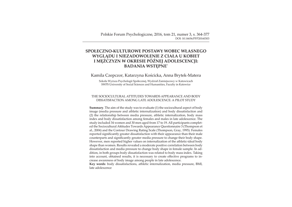 Polskie Forum Psychologiczne, 2016, tom 21, numer 3, s. 364-377 DZȱŗŖǯŗŚŜśŜȦŘŖŗŜŖřŖř RȬȱȱȱRȱ &ȱȱȱȱRȱȱ ȱ9 ȱȱȱXȱDZȱ ȱ9* ȱ££ǰȱ£¢ȱïǰȱȱ¢Ȭ £Ùȱ¢Č£ȱ¢ȱÙ£ǰȱ¢£Ùȱ ¢ȱ ȱ SWPS University of Social Sciences and Humanities, Faculty in Katowice THE SOCIOCULTURAL ATTITUDES TOWARDS APPEARANCE AND BODY ȱȱȱDZȱȱȱ Summaryǯȱȱȱȱȱ¢ȱ ȱȱȱǻŗǼȱȱȱȱȱ¢ȱ ȱǻȱȱȱȱ£Ǽȱȱ¢ȱȱȱ ǻŘǼȱ ȱ ȱ ȱ ȱ ǰȱ ȱ £ǰȱ ¢ȱ ȱ ¡ȱȱ¢ȱȱȱȱȱȱȱȱǯȱȱ study included 34 women and 30 men aged from 17 to 19. All participants completȱȱȱĴȱ ȱȱȱřȱǻȱȱ ǯǰȱŘŖŖŚǼȱȱȱȱ ȱȱȱǻǰȱ¢ǰȱŗşşśǼǯȱȱ ȱę¢ȱȱȱ ȱȱȱȱȱȱ ȱȱę¢ȱȱȱȱȱȱȱ¢ȱǯȱ ǰȱȱȱȱȱȱ£ȱȱȱȬȱ¢ȱ ȱȱ ǯȱȱȱȱȱȱȱ ȱ¢ȱ ȱȱȱȱȱȱ¢ȱȱȱȱǯȱȱǰȱȱȱȱ¢ȱȱ ȱȱȱ¢ȱȱ¡ǯȱȱ ȱ ǰȱ ȱ ǰȱ ȱ ȱ ¢ȱ ȱ ȱ ěȱ ȱ ȱ ȱ ȱȱ¢ȱȱȱȱȱȱǯ Key wordsDZȱ ¢ȱ ǰȱ ȱ £ǰȱ ȱ ǰȱ ǰȱ late adolescence ȱ ȱ ȱ ££àȱ ¢ȱ ȱ £ ȱ Ù ȱ ȱ £¢¢ ȱ £ȱ Ùȱ Ùȱ ǻǰȱ ǰȱ ǰȱ ŘŖŗśǼǯȱ ȱ ȱà Čȱ£ǰȱ¢ȱȱȱà ï£ȱȱ¿ȱÙà ¢ȱĊàÙȱ ȱȱ¢Ùȱ ǯ