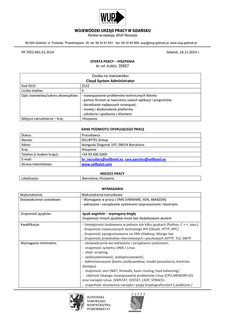 80-824 Gdańsk, ul. Podwale Przedmiejskie 30, tel. 58 32 61 801, fax: 58 32 64 894, [email protected], www.wup.gdansk.pl PP.7052-601.ES.2014 Gdańsk, 18.11.2014 r. OFERTA PRACY – HISZPANIA Nr ref. EURES: 35957 Osoba na stanowisko: Cloud System Administrator Kod ISCO: 2522 Liczba etatów: 3 Opis stanowiska/zakres obowiązków: - rozwiązywanie problemów technicznych klienta - pomoc firmom w tworzeniu swoich aplikacji i programów - doradzanie najlepszych rozwiązań, - rozwój i doskonalenie platformy - szkolenia i spotkania z klientem Miejsce zatrudnienia – kraj: Hiszpania DANE PODMIOTU OFERUJĄCEGO PRACĘ Status: Nazwa: Adres: Kraj: Telefon (z kodem kraju): E-mail: Strona internetowa: Pracodawca SELLBYTEL Group Avinguda Diagonal 197, 08014 Barcelona Hiszpania +34 93 400 5000 [email protected], [email protected] www.sellbytel.com Lokalizacja: MIEJSCE PRACY Barcelona, Hiszpania WYMAGANIA Wykształcenie: Doświadczenie zawodowe: Wykształcenie kierunkowe - Wymagane w pracy z VMS (VMWARE, XEN, AMAZON) - wdrażanie i zarządzanie systemami rozproszonymi i klastrami. Znajomość języków: Język angielski – wymagany biegły Znajomość innych języków może być dodatkowym atutem Kwalifikacje: - Umiejętności kodowania w jednym lub kilku językach (Python, C + +, Java,) - Znajomość nowoczesnych technologii API (OAuth, HTTP, RPC) - Znajomość oprogramowania na VMs (Hadoop, Mongo itp) - Znajomość protokołów internetowych i pocztowych (HTTP, TLS, SMTP - doświadczenie we wdrażaniu i zarządzaniu systemami, - znajomość systemu UNIX / Linux - shell- scripting, - wielozadaniowość, wieloprocesowość, - Administrowanie (konta użytkowników, model pozwolenia, kontrola dostępu) - znajomość sieci (NAT, firewalls, basic routing, load balancing), - zdolność łatwego rozwiązywania problemów Linux (CPU,MEMORY,IO) oraz narzędzi Linux (VMSTAT, IOSTAT, LSOF, STRACE)- znajomość stosowania narzędzi i pojęć kryptograficznych ( publiczne / Wymagania minimalne: prywatne KEY AUTH, SSH, itp.) - umiejętność czytania i rozumienia publikowanych dokumentów (google developers website, stackoverflow) - znajomość SQL (dowolny dialekt). WYNAGRODZENIE I WARUNKI ZATRUDNIENIA Wysokość pensji brutto: Waluta, w jakiej wypłacana jest pensja: Nazwa firmy, z którą zostanie podpisana umowa: Dodatkowe informacje: Rodzaj umowy: Data rozpoczęcia: Wymagane dokumenty Język, w którym muszą być sporządzone przedkładane dokumenty: Do kogo należy wysłać dokumenty: Gdzie należy wysłać dokumenty: Dane teleadresowe doradcy EURES lub przedstawiciela pracodawcy: 25 000 - 40 000 EUR/ rocznie – wynagrodzenie do negocjacji w zależności od posiadanych kwalifikacji i umiejętności. EUR SELLBYTEL Group - Pracodawca zapewnia szkolenia -Program Rozwoju Wewnętrznego: zapewniona możliwość rozwoju w firmie, prywatne ubezpieczenie zdrowotne, zwrot kosztów biletów -Darmowe lekcje hiszpańskiego / katalońskiego -Pomocw przyjeździe do Barcelony Pełen etat, czas nieokreślony Do uzgodnienia SPOSÓB SKŁADANIA WNIOSKU CV oraz list motywacyjny język angielski Do pracodawcy i do wiadomości WUP Gdańsk Dokumenty należy przesłać na adres e-mail: [email protected] oraz do wiadomości WUP Gdańsk: [email protected] W tytule maila proszę wpisać „EURES.ADMIN” Albert Martinez– [email protected] DODATKOWE INFORMACJE Uprzejmie informujemy, że pracodawca skontaktuje się tylko z wybranymi osobami WAŻNOŚĆ Data publikacji: 05.08.2014 r. Termin przedkładania podań o pracę / zakończenia ważności oferty: 01.01.2015 r. UWAGA: 1. Umowa z zagranicznym pracodawcą zostanie zawarta zgodnie z prawem kraju zatrudnienia. Oznacza to, że wszystkie roszczenia odnośnie do warunków, które obejmuje umowa, można kierować wyłącznie do odpowiedniego sądu w kraju zatrudnienia. Publiczne służby zatrudnienia (EURES) nie mogą pośredniczyć ani reprezentować pracownika w sądzie kraju zatrudnienia w przypadku sporu z pracodawcą. 2. Publiczne służby zatrudnienia (EURES) dokładają wszelkich starań, aby zapewnić rzetelność i wiarygodność ofert pracy zgłoszonych w lokalnym urzędzie pracy. Należy wyjaśnić, że oferta pracy została zgłoszona przez stronę trzecią i EURES nie odpowiada za ewentualne rozbieżności między warunkami pracy określonymi w ofercie pracy i warunkami oferowanymi przez potencjalnego pracodawcę. 3. Publiczne służby zatrudnienia (EURES) informują, że będą zbierać, przetwarzać i przekazywać potencjalnym pracodawcom zgodnie z przepisami dotyczącymi ochrony danych osobowych wszystkie dane osobowe dostarczone przez osoby poszukujące pracy.
