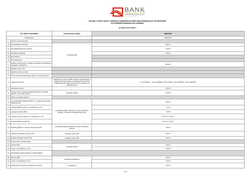 WYCIĄG Z TARYFY OPŁAT I PROWIZJI POBIERANYCH PRZEZ BANK SPÓŁDZIELCZY WE WSCHOWIE ZA CZYNNOŚCI BANKOWE DLA LUDNOŚCI na dzień 01.07.2016 r. III. KARTY PŁATNICZE MAESTRO Tryb pobierania opłaty Rodzaj karty debetowa 1. Wydanie pierwszej karty a) dla Posiadacza rachunku 0,00 zł b) dla Współposiadacza rachunku 0,00 zł c) dla osoby wskazanej d) karta główna 0,00 zł za każdą kartę e) karta dołączona 2. Wydanie nowej karty w miejsce utraconej lub duplikatu w przypadku uszkodzenia 3. Wydanie karty i PIN 4. Zasilenie rachunku karty 5. Kwota minimalnej pierwszej wpłaty na rachunek karty 6. Użytkowanie karty miesięcznie z góry za każdy miesiąc ważności karty z wyłączeniem kart charge i kredytowych dla których opłata pobierana jest rocznie z góry za każdy rok ważności karty 7. Zastrzeżenie karty - 0,00 zł 8. Zmiana limitów operacji bezgotówkowych lub wypłat gotówki na wniosek klienta za każdą zmianę 10,00 zł 9. Opłata za wypłatę gotówki a) w bankomatach SGB oraz BPS S.A i zrzeszonych banków spółdzielczych b) w bankomatach innych, niż wskazane w lit.a c) w kasach banków SGB 48,00 zł 2 zł S-KONTO; 2,00 zł SENIOR; 4,00 zł ROR; 4,00 zł PROFIT; 4,00 zł PRESTIŻ 0,00 zł 1,30 zł za każdą wypłatę, pobierana w dniu rozliczenia operacji, naliczana od wypłacanej kwoty 2 1,50 zł 2 d) w kasach innych banków, niż wskazane w lit.c 3% min. 4,50 zł e) w bankomatach za granicą 3% min. 4,50 zł za każdą wypłatę, pobierana w dniu rozliczenia operacji 0,60 zł 11. Wydanie pierwszego numeru PIN za każdy numer PIN 4,50 zł 12. Wydanie nowego numeru PIN za każdy numer PIN 8,00 zł 10. Wypłata gotówki w ramach usługi cash back 13. Zmiana PIN w bankomatach a) banków SGB b) innych, niż wskazane w lit.a 4,50 zł za każdą zmianę 7,00 zł 14. Sprawdzenie salda rachunku w bankomatach a) banków SGB b) innych, niż wskazane w lit.a 0,00 zł za każde sprawdzenie 15. Zestawienie transakcji przesyłane do klienta 1,00 zł 2,58 zł miesięcznie 1z2 III. KARTY PŁATNICZE MAESTRO Tryb pobierania opłaty Rodzaj karty Przesłanie ponownego zestawienia transakcji na życzenie 16. klienta 17. Ekspresowe przesłanie karty lub numeru PIN (dostarczenie w ciągu 3 dni roboczych) debetowa za każde zestawienie 5,00 zł za każdą przesyłkę 45,00 zł 18. Transakcje bezgotówkowe Opłata za przewalutowanie i rozliczenie transakcji 19. dokonanej w walucie innej niż PLN 20. 0,00 zł naliczana od kwoty transakcji, pobierana w dniu rozliczenia operacji 1,00% Za odroczony termin płatności od transakcji bezgotówkowych i wypłat gotówki a) w kraju b) za granicą 21. Opłata za wysłanie upomnienia (nie więcej niż jedno w okresie rozliczeniowym) lub wezwania do spłaty zadłużenia - w przypadkach określonych w umowie o kartę miesięcznie, naliczana od kwoty transakcji wykonanych w poprzednim cyklu rozliczeniowym za każde upomnienie / wezwanie 22. Zmiana limitu kredytowego 23. Przekroczenie limitu kredytowego 24. Za sporządzenie i wysłanie do BIK S.A. na żądanie Klienta informacji o spłacie kredytu 25. Minimalna kwota do zapłaty 1 jeżeli średniomiesięczne obroty z tytułu użytkowania karty w okresie ostatnich 12 miesięcy wynosiły od 400,00 zł do 799,99 zł - opłatę pobiera się w wysokości 50% 2 pod warunkiem, że placówka udostępnia usługę wypłat w POS jeżeli średniomiesięczne obroty z tytułu użytkowania karty w okresie ostatnich 12 miesięcy wynosiły co najmniej 800,00 zł – opłata wynosi 0,00 zł Opłaty miesięczne nie są pobierane w miesiącu rozpoczęcia oraz w miesiącu zakończenia korzystania z usługi świadczonej przez bank, a opłaty pobrane z góry są zwracane w części za niewykorzystany okres, jeżeli klient zrezygnował z usługi przed upływem roku od pobrania opłaty. 2z2