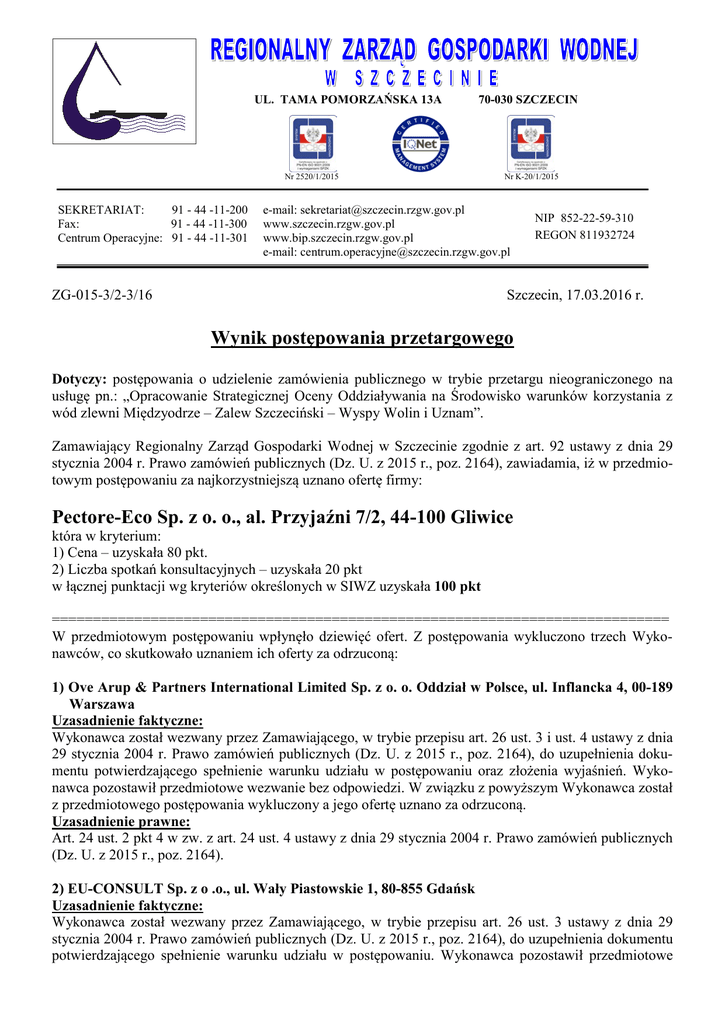 UL. TAMA POMORZAŃSKA 13A 70-030 SZCZECIN Nr 2520/1/2015 SEKRETARIAT: 91 - 44 -11-200 Fax: 91 - 44 -11-300 Centrum Operacyjne: 91 - 44 -11-301 Nr K-20/1/2015 e-mail: [email protected] www.szczecin.rzgw.gov.pl www.bip.szczecin.rzgw.gov.pl e-mail: [email protected] ZG-015-3/2-3/16 NIP 852-22-59-310 REGON 811932724 Szczecin, 17.03.2016 r. Wynik postępowania przetargowego Dotyczy: postępowania o udzielenie zamówienia publicznego w trybie przetargu nieograniczonego na usługę pn.: „Opracowanie Strategicznej Oceny Oddziaływania na Środowisko warunków korzystania z wód zlewni Międzyodrze – Zalew Szczeciński – Wyspy Wolin i Uznam”. Zamawiający Regionalny Zarząd Gospodarki Wodnej w Szczecinie zgodnie z art. 92 ustawy z dnia 29 stycznia 2004 r. Prawo zamówień publicznych (Dz. U. z 2015 r., poz. 2164), zawiadamia, iż w przedmiotowym postępowaniu za najkorzystniejszą uznano ofertę firmy: Pectore-Eco Sp. z o. o., al. Przyjaźni 7/2, 44-100 Gliwice która w kryterium: 1) Cena – uzyskała 80 pkt. 2) Liczba spotkań konsultacyjnych – uzyskała 20 pkt w łącznej punktacji wg kryteriów określonych w SIWZ uzyskała 100 pkt =========================================================================== W przedmiotowym postępowaniu wpłynęło dziewięć ofert. Z postępowania wykluczono trzech Wykonawców, co skutkowało uznaniem ich oferty za odrzuconą: 1) Ove Arup & Partners International Limited Sp. z o. o. Oddział w Polsce, ul. Inflancka 4, 00-189 Warszawa Uzasadnienie faktyczne: Wykonawca został wezwany przez Zamawiającego, w trybie przepisu art. 26 ust. 3 i ust. 4 ustawy z dnia 29 stycznia 2004 r. Prawo zamówień publicznych (Dz. U. z 2015 r., poz. 2164), do uzupełnienia dokumentu potwierdzającego spełnienie warunku udziału w postępowaniu oraz złożenia wyjaśnień. Wykonawca pozostawił przedmiotowe wezwanie bez odpowiedzi. W związku z powyższym Wykonawca został z przedmiotowego postępowania wykluczony a jego ofertę uznano za odrzuconą. Uzasadnienie prawne: Art. 24 ust. 2 pkt 4 w zw. z art. 24 ust. 4 ustawy z dnia 29 stycznia 2004 r. Prawo zamówień publicznych (Dz. U. z 2015 r., poz. 2164). 2) EU-CONSULT Sp. z o .o., ul. Wały Piastowskie 1, 80-855 Gdańsk Uzasadnienie faktyczne: Wykonawca został wezwany przez Zamawiającego, w trybie przepisu art. 26 ust. 3 ustawy z dnia 29 stycznia 2004 r. Prawo zamówień publicznych (Dz. U. z 2015 r., poz. 2164), do uzupełnienia dokumentu potwierdzającego spełnienie warunku udziału w postępowaniu. Wykonawca pozostawił przedmiotowe wezwanie bez odpowiedzi. W związku z powyższym Wykonawca został z przedmiotowego postępowania wykluczony a jego ofertę uznano za odrzuconą. Uzasadnienie prawne: Art. 24 ust. 2 pkt 4 w zw. z art. 24 ust. 4 ustawy z dnia 29 stycznia 2004 r. Prawo zamówień publicznych (Dz. U. z 2015 r., poz. 2164). 3) FPP Enviro Sp. z o. o., ul. Wilcza 50/52, 00-679 Warszawa Uzasadnienie faktyczne: Wykonawca został wezwany przez Zamawiającego, w trybie przepisu art. 26 ust. 3 ustawy z dnia 29 stycznia 2004 r. Prawo zamówień publicznych (Dz. U. z 2015 r., poz. 2164), do uzupełnienia dokumentu potwierdzającego spełnienie warunku udziału w postępowaniu. Wykonawca pozostawił przedmiotowe wezwanie bez odpowiedzi. W związku z powyższym Wykonawca został z przedmiotowego postępowania wykluczony a jego ofertę uznano za odrzuconą. Uzasadnienie prawne: Art. 24 ust. 2 pkt 4 w zw. z art. 24 ust. 4 ustawy z dnia 29 stycznia 2004 r. Prawo zamówień publicznych (Dz. U. z 2015 r., poz. 2164). Pozostali Wykonawcy uzyskali następującą punktację: Zielone Oko Ada Okrasińska Krzysztof Okrasiński Spółka Cywilna, ul. A. Krajowej 25/7, 58-100 Świdnica którzy w kryterium: 1) Cena – uzyskali 43,07 pkt. 2) Liczba spotkań konsultacyjnych – uzyskali 20 pkt w łącznej punktacji wg kryteriów określonych w SIWZ uzyskali 63,07 pkt Lemtech Consulting Sp. z o. o., ul. Szpitalna 40,31-024 Kraków która w kryterium: 1) Cena – uzyskała 36,31 pkt. 2) Liczba spotkań konsultacyjnych – uzyskała 20 pkt w łącznej punktacji wg kryteriów określonych w SIWZ uzyskała 56,31 pkt Ekovert Łukasz Szkudlarek, ul. Średzka 39/1, 54-001 Wrocław który w kryterium: 1) Cena – uzyskał 33,05 pkt. 2) Liczba spotkań konsultacyjnych – uzyskał 20 pkt w łącznej punktacji wg kryteriów określonych w SIWZ uzyskał 53,05 pkt MGGP S.A., ul. Kaczkowskiego 6, 33-100 Tarnów która w kryterium: 1) Cena – uzyskała 31,30 pkt. 2) Liczba spotkań konsultacyjnych – uzyskała 20 pkt w łącznej punktacji wg kryteriów określonych w SIWZ uzyskała 51,30 pkt Multiconsult Polska Sp. z o. o., ul. Bonifraerska 17, 00-203 Warszawa która w kryterium: 1) Cena – uzyskała 36,31 pkt. 2) Liczba spotkań konsultacyjnych – uzyskała 13,33 pkt w łącznej punktacji wg kryteriów określonych w SIWZ uzyskała 49,64 pkt Umowa w sprawie zamówienia publicznego może zostać zawarta w terminie określonym w art. 94 ustawy z dnia 29 stycznia 2004 r. Prawo zamówień publicznych. Ogłoszenie o wynikach zostało przesłane do wykonawców faksem oraz pocztą elektroniczną a także umieszczone na stronie internetowej i tablicy ogłoszeń RZGW w dniu 17.03.2016 r.
