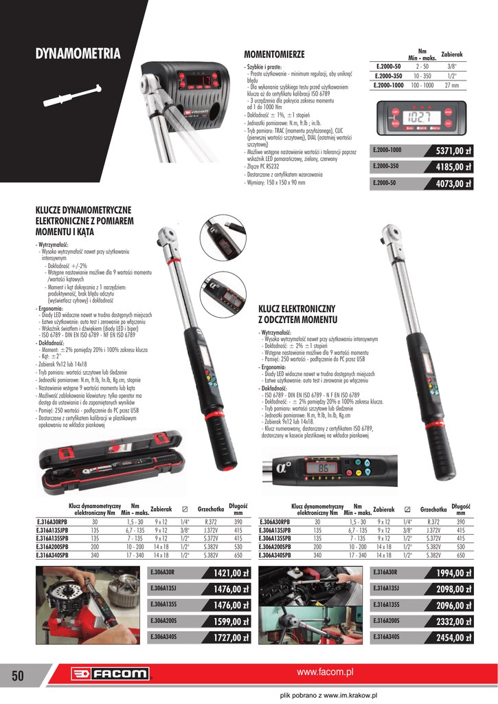 DynamometriA MOMENTOMIERZE - Szybkie i proste: - Proste użytkowanie - minimum regulacji, aby uniknąć błędu - Dla wykonania szybkiego testu przed użytkowaniem klucza aż do certyfikatu kalibracji ISO 6789 - 3 urządzenia dla pokrycia zakresu momentu od 1 do 1000 Nm - Dokładność ± 1%, ±1 stopień - Jednostki pomiarowe: N.m, ft.lb ; in.lb. - Tryb pomiaru: TRAC (momentu przyłożonego), CLIC (pierwszej wartości szczytowej), DIAL (ostatniej wartości szczytowej) - Możliwe wstępne nastawienie wartości i tolerancji poprzez wskaźnik LED pomarańczowy, zielony, czerwony - Złącze PC RS232 - Dostarczane z certyfikatem wzorcowania - Wymiary: 150 x 150 x 90 mm Nm Min - maks. Zabierak E.2000-50 2 - 50 3/8" E.2000-350 10 - 350 1/2" E.2000-1000 100 - 1000 27 mm E.2000-1000 5371,00 zł E.2000-350 4185,00 zł E.2000-50 4073,00 zł KLUCZE DYNAMOMETRYCZNE ELEKTRONICZNE Z POMIAREM MOMENTU I KĄTA - Wytrzymałość: - Wysoka wytrzymałość nawet przy użytkowaniu intensywnym - Dokładność +/-2% - Wstępne nastawianie możliwe dla 9 wartości momentu /wartości kątowych - Moment i kąt dokręcania z 1 narzędziem: produktywność, brak błędu odczytu (wyświetlacz cyfrowy) i dokładność - Ergonomia: - Diody LED widoczne nawet w trudno dostępnych miejscach - Łatwe użytkowanie: auto test i zerowanie po włączeniu - Wskaźnik światłem i dźwiękiem (diody LED i biper) - ISO 6789 - DIN EN ISO 6789 - NF EN ISO 6789 - Dokładność: - Moment: ±2% pomiędzy 20% i 100% zakresu klucza - Kąt: ±2° - Zabierak 9x12 lub 14x18 - Tryb pomiaru: wartości szczytowe lub śledzenie - Jednostki pomiarowe: N.m, ft.lb, In.lb, Kg.cm, stopnie - Nastawienie wstępne 9 wartości momentu lub kąta - Możliwość zablokowania klawiatury: tylko operator ma dostęp do ustawiania i do zapamiętanych wyników - Pamięć: 250 wartości - podłączenie do PC przez USB - Dostarczane z certyfikatem kalibracji w plastikowym opakowaniu na wkładce piankowej Klucz dynamometryczny Nm elektroniczny Nm Min - maks. Zabierak E.316A30RPB 30 1,5 - 30 9 x 12 E.316A135JPB 135 6,7 - 135 9 x 12 E.316A135SPB 135 7 - 135 9 x 12 E.316A200SPB 200 10 - 200 14 x 18 E.316A340SPB 340 17 - 340 14 x 18 50 Klucz elektroniczny z odczytem momentu - Wytrzymałość: - Wysoka wytrzymałość nawet przy użytkowaniu intensywnym - Dokładność: ± 2% ±1 stopień - Wstępne nastawianie możliwe dla 9 wartości momentu - Pamięć: 250 wartości - podłączenie do PC przez USB - Ergonomia: - Diody LED widoczne nawet w trudno dostępnych miejscach - Łatwe użytkowanie: auto test i zerowanie po włączeniu - Dokładność: - ISO 6789 - DIN EN ISO 6789 - N F EN ISO 6789 - Dokładność: - ± 2% pomiędzy 20% a 100% zakresu klucza. - Tryb pomiaru: wartości szczytowe lub śledzenie - Jednostki pomiarowe: N.m, ft.lb, In.lb, Kg.cm - Zabierak 9x12 lub 14x18. - Klucz numerowany, dostarczany z certyfikatem ISO 6789, dostarczany w kasecie plastikowej na wkładce piankowej 1/4" 3/8" 1/2" 1/2" 1/2" Grzechotka Długość mm R.372 390 J.372V 415 S.372V 415 S.382V 530 S.382V 650 Klucz dynamometryczny Nm elektroniczny Nm Min - maks. Zabierak E.306A30RPB 30 1,5 - 30 9 x 12 E.306A135JPB 135 6,7 - 135 9 x 12 E.306A135SPB 135 7 - 135 9 x 12 E.306A200SPB 200 10 - 200 14 x 18 E.306A340SPB 340 17 - 340 14 x 18 1/4" 3/8" 1/2" 1/2" 1/2" Grzechotka Długość mm R.372 390 J.372V 415 S.372V 415 S.382V 530 S.382V 650 E.306A30R 1421,00 zł E.316A30R 1994,00 zł E.306A135J 1476,00 zł E.316A135J 2098,00 zł E.306A135S 1476,00 zł E.316A135S 2096,00 zł E.306A200S 1599,00 zł E.316A200S 2332,00 zł E.306A340S 1727,00 zł E.316A340S 2454,00 zł www.facom.pl plik pobrano z www.im.krakow.pl