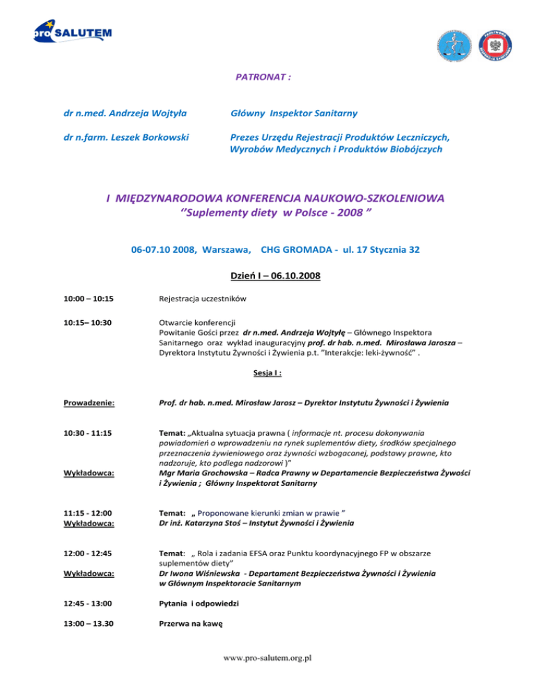 PATRONAT : dr n.med. Andrzeja Wojtyła Główny Inspektor Sanitarny dr n.farm. Leszek Borkowski Prezes Urzędu Rejestracji Produktów Leczniczych, Wyrobów Medycznych i Produktów Biobójczych I MIĘDZYNARODOWA KONFERENCJA NAUKOWO‐SZKOLENIOWA ‘’Suplementy diety w Polsce ‐ 2008 ” 06‐07.10 2008, Warszawa, CHG GROMADA ‐ ul. 17 Stycznia 32 Dzień I – 06.10.2008 10:00 – 10:15 Rejestracja uczestników Otwarcie konferencji Powitanie Gości przez dr n.med. Andrzeja Wojtyłę – Głównego Inspektora Sanitarnego oraz wykład inauguracyjny prof. dr hab. n.med. Mirosława Jarosza – Dyrektora Instytutu Żywności i Żywienia p.t. ”Interakcje: leki‐żywność” . 10:15– 10:30 Prowadzenie: 10:30 ‐ 11:15 Sesja I : Prof. dr hab. n.med. Mirosław Jarosz – Dyrektor Instytutu Żywności i Żywienia Temat: „Aktualna sytuacja prawna ( informacje nt. procesu dokonywania powiadomień o wprowadzeniu na rynek suplementów diety, środków specjalnego przeznaczenia żywieniowego oraz żywności wzbogacanej, podstawy prawne, kto nadzoruje, kto podlega nadzorowi )” Mgr Maria Grochowska – Radca Prawny w Departamencie Bezpieczeństwa Żywości Wykładowca: i Żywienia ; Główny Inspektorat Sanitarny 11:15 ‐ 12:00 Temat: „ Proponowane kierunki zmian w prawie ” Dr inż. Katarzyna Stoś – Instytut Żywności i Żywienia Wykładowca: 12:00 ‐ 12:45 Temat: „ Rola i zadania EFSA oraz Punktu koordynacyjnego FP w obszarze suplementów diety” Dr Iwona Wiśniewska ‐ Departament Bezpieczeństwa Żywności i Żywienia Wykładowca: w Głównym Inspektoracie Sanitarnym 12:45 ‐ 13:00 Pytania i odpowiedzi 13:00 – 13.30 Przerwa na kawę www.pro-salutem.org.pl Sesja II Prowadzenie: 13:30 ‐ 14:15 Dr n.med. Lucjan Szponar – Doradca Głównego Inspektora Sanitarnego Temat: „ Klasyfikacja środków spożywczych podlegających powiadomieniu (rodzaje – definicje, podstawy prawne, różnice, przeznaczenie ” Suplementy diety Środki specjalnego przeznaczenia żywieniowego Środki specjalnego przeznaczenia medycznego • wzbogacane środki spożywcze • witaminami – przykłady, problemy • minerałami – przykłady, problemy • innymi substancjami wzbogacającymi – przykłady, problemy Dr inż. Katarzyna Stoś – Instytut Żywności i Żywienia Wykładowca: 14:15 – 15:00 Temat: „Produkty z pogranicza ‐ środki specjalnego przeznaczenia żywieniowego a produkty lecznicze – postępowanie w celu odróżnienia na konkretnym przykładzie: produkty lecznicze przeznaczone do specjalnych celów żywieniowych” Wykładowca: Dr n.med. Lucjan Szponar – Doradca Głównego Inspektora Sanitarnego 15:00 – 15:15 Pytania i odpowiedzi 15:15 – 16:15 Przerwa na obiad Prowadzenie: 16:15 – 17:00 Wykładowca: 17:00 – 17:15 Sesja III : Prof. dr hab. n.med. Przemysław Mrozikiewicz – Dyrektor Instytutu Roślin i Przetworów Zielarskich w Poznaniu Temat: „Ocena składników środków spożywczych podlegających powiadomieniu, w tym składników ziołowych” Dr inż. Alina Mścisz ‐ Instytut Roślin i Przetworów Zielarskich w Poznaniu Pytania i odpowiedzi www.pro-salutem.org.pl Dzień II – 07.10.2008 Prowadzenie: 10:15– 11:00 11:00– 12:30 Sesja IV : Doc. dr hab. n. farm. Kazimierz Karłowski – Państwowy Zakład Higieny Wykład wprowadzający Temat: „Znakowanie suplementów diety i środków spożywczych specjalnego przeznaczenia żywieniowego w kontekście oświadczeń żywieniowych i zdrowotnych” Wykładowca: 12:30 – 13:00 Zasady ogólne stosowania oświadczeń zdrowotnych i żywieniowych Oświadczenia żywieniowe dla suplementów diety Oświadczenia zdrowotne dla suplementów diety Oświadczenia żywieniowe dla środków specjalnego przeznaczenia żywieniowego Oświadczenia zdrowotne dla środków specjalnego przeznaczenia żywieniowego Dr n.med. Janusz Ciok ‐ Instytut Żywności i Żywienia Przerwa na kawę Prowadzenie: 13:00 – 14:00 Sesja V: Doc. dr hab. n. farm. Kazimierz Karłowski – Państwowy Zakład Higieny Temat: „Nowa żywność” Definicja, podstawa prawna, wymagania, przykłady Klasyfikacja i procedura zatwierdzania „nowej żywności” Mgr Agnieszka Dolna – Departament Bezpieczeństwa Żywności i Żywienia Wykładowca: w Głównym Inspektoracie Sanitarnym 14:00 – 14.15 Podsumowanie i zakończenie konferencji ‐ dr n.med. Andrzej Wojtyła – Główny Inspektor Sanitarny. 14:15 Przerwa na obiad www.pro-salutem.org.pl