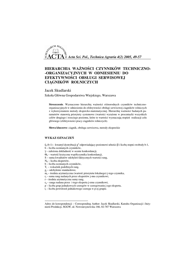 Acta Sci. Pol., Technica Agraria 4(2) 2005, 49-57 HIERARCHIA WA NO CI CZYNNIKÓW TECHNICZNO-ORGANIZACYJNYCH W ODNIESIENIU DO EFEKTYWNO CI OBSŁUGI SERWISOWEJ CI GNIKÓW ROLNICZYCH Jacek Skudlarski Szkoła Główna Gospodarstwa Wiejskiego, Warszawa Streszczenie. Wyznaczono hierarchi wa no ci ró norodnych czynników technicznoorganizacyjnych w odniesieniu do efektywno ci obsługi serwisowej ci gników rolniczych z wykorzystaniem metody ekspercko-matematycznej. Hierarchi wa no ci badanych parametrów stanowi priorytety systemowe (warto ci wyra one w procentach) wszystkich celów drugiego i trzeciego poziomu, które to warto ci wyznaczaj stopie realizacji celu głównego (efektywno ci pracy ci gników rolniczych). Słowa kluczowe: ci gnik, obsługa serwisowa, metody eksperckie WYKAZ OZNACZE fβ (b-1) – kwantyl dystrybucji χ2 odpowiadaj cy poziomowi ufno ci β i liczb stopni swobody b-1, b – liczba ocenianych czynników, γ – zało ona dokładno w ocenie konkordancji, Θ0 – warto krytyczna współczynnika konkordancji, S – suma kwadratów odchyle faktycznych warto ci rang, NE – liczba ekspertów, b – liczba ocenianych czynników, Ti – wska nik podobnych rang, gj – odchylenie standardowe, mj – rednia arytmetyczna (warto priorytetu lokalnego) j-tego czynnika, rj – suma rang nadanych przez ekspertów j-mu czynnikowi, r – rednia arytmetyczna sumy rang, rij – ranga nadana przez i-tego eksperta j-emu czynnikowi, p – liczba grup jednakowych szeregów w szeregowaniu j-ego eksperta, ti – liczba powtórze jednakowego szeregu w p-ej grupie. Adres do korespondencji – Corresponding Author: Jacek Skudlarski, Katedra Organizacji i In ynierii Produkcji, SGGW, ul. Nowoursynowska 166, 02-787 Warszawa 50 J. Skudlarski WST P Znacz cy wzrost mocy ci gników rolniczych wprowadzenie automatyki i elektroniki znacznie zwi ksza zapotrzebowane na obsług techniczn . Jak wykazuj do wiadczenia zagraniczne obsługa techniczna wiadczona przez serwis przynosi producentowi znaczne korzy ci finansowe [Interneta] zwłaszcza w okresie od zaprzestania produkcji danej maszyny przez producenta do momentu u ytkowania przez ostatniego nabywc [Kulibanowa 2000]. Do wiadczenia krajów b. ZSRR pokazuj , e nieefektywne działanie obsługi serwisowej maszyn rolniczych i ci gników obni a ich gotowo techniczn , nawet poni ej wystarczaj cych warto ci [Rasskazov 1997, Dokunihin 2001]. Racjonalizacja działa serwisu technicznego pozwoliła w tych krajach zwi kszy wykorzystanie roczne maszyn o 6-10% i obni y zu ycie cz ci zamiennych nawet o 30% [Czernoiwanov 1997]. Efektywno działania obsługi serwisowej jest równie istotna w warunkach polskiego rolnictwa, gdzie wydatki na usługi naprawcze sprz tu rolniczego si gaj ok. 19 mln zł rocznie [Pasyniuk 2004]. Z uwagi na fakt, e ok. 50% prac obsługowo naprawczych wykonuj rolnicy we własnym zakresie [Pasyniuk 2004], korzystaj c niekiedy z pomocy s siedzkiej efektywno obsługi serwisowej, powinna by rozpatrywana nie tylko pod k tem działalno ci słu b remontowych, ale równie zaopatrzenia w cz ci zamienne. Efektywno działania obsługi serwisowej powinna by rozumiana jako zdolno minimalizowania w gospodarstwie rolnym kosztów uwzgl dniaj cych nie tylko koszt usuni cia awarii (przy zachowaniu wymaganej jako ci naprawy), ale równie straty powstałe w wyniku oczekiwania na napraw czy dostarczenie cz ci zamiennych. Do wiadczenia autora oraz doniesienia literaturowe [Kulibanova 2000] pozwalaj stwierdzi , e na efektywno obsługi serwisowej wpływa szereg czynników, których wa no nie została dotychczas zhierarchizowana. Znajomo tej hierarchii wa no ci ma du e znaczenie dla producenta ci gników, gdy uwzgl dnienie najwa niejszych czynników pozwoli w najwy szym stopniu poprawi efektywno działania serwisu technicznego, co z pewno ci nie ujdzie uwagi rolników decyduj cych si na zakup ci gnika danego producenta. CEL I ZAKRES BADA Celem bada było okre lenie hierarchii wa no ci czynników techniczno-organizacyjnych z punktu widzenia ich wpływu na efektywno obsługi serwisowej ci gników rolniczych. Hierarchia wa no ci była okre lana dla obsługi serwisowej ci gników rolniczych stosowanych zarówno w gospodarstwach rolnych, jak i innych bran ach. _____________________________________________________________________________________________________________________________________________ Acta Sci. Pol. Hierarchia wa no ci czynników techniczno-organizacyjnych w odniesieniu do efektywno ci... 51 METODY W celu dokonania hierarchizacji czynników wpływaj cych na efektywno działania serwisu technicznego ci gników rolniczych zastosowano metod ocen ekspertów, która w literaturze jest znana pod nazw metody ekspercko-matematycznej [Jewlanow 1981, Masiuk 1998]. Metoda ta w sposób racjonalny ł czy proces intuicyjno-logicznej analizy danego problemu przez eksperta z liczbowymi metodami obróbki danych, zarówno przedstawienia wyników rozwi za , jak i dla kierowania procesem ekspertyzy. Uzyskane w rezultacie obróbki danych opinie ekspertów przyjmuje si jako rozwi zanie danego problemu. Metoda ekspercko-matematyczna pozwala analizowa i ocenia bardzo zró nicowane czynniki, a wyniki uzyskane przy jej wykorzystaniu ró ni si od wyników z innych metod zakresie 6–8% [Gordon i Helman 1974]. St d te powszechne zastosowanie tej metody w celach zbrojeniowych, gospodarczych [Jevlanow 1981] jak równie naukowych, zarówno za granic [Stopałov 1993, Nahatkian i Kriukov 1993, Masiuk 1998], jak i w kraju [Skudlarski 2002, Izdebski 2003]. Szczegółowy tok bada obejmuje m.in. matematyczne okre lenie minimalnej liczby ekspertów oraz ich dobór jako ciowy, a tak e weryfikacj zgodno ci ocen ekspertów za pomoc metod statystycznych. Minimaln liczb ekspertów wyznacza si ze wzoru [Jevlanow 1981]: NE = fβ (b − 1) (γ + 1)(b − 1)Θ 0 (1) Przy zało onym poziomie ufno ci – 0,95, dokładno ci w ocenie konkordancji – 0,1 i warto ci krytycznej współczynnika konkordancji – 0,1 i 