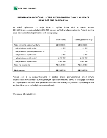INFORMACJA O OGÓLNEJ LICZBIE AKCJI I GŁOSÓW Z AKCJI W SPÓŁCE BANK BGŻ BNP PARIBAS S.A. Na dzień ogłoszenia 13 maja 2016 r. ogólna liczba akcji w Banku wynosi 84 238 318 szt. co odpowiada 84 238 318 głosom na Walnym Zgromadzeniu. Podział akcji na akcje na okaziciela i akcje imienne jest następujący: Liczba akcji Akcje imienne ogółem, w tym: Liczba głosów z akcji 13 024 915 13 024 915 19 676 19 676 4 4 - akcje imienne zwykłe serii C 3 235 3 235 - akcje imienne zwykłe serii G 8 000 000 8 000 000 - akcje imienne zwykłe serii H 5 002 000 5 002 000 Akcje na okaziciela 71 213 403 71 213 403 Akcje razem 84 238 318 84 238 318 - akcje imienne zwykłe serii A - akcje imienne uprzywilejowane serii B* * Akcje serii B są uprzywilejowane w postaci prawa pierwszeństwa przed innymi akcjonariuszami w zakresie sum uzyskanych z podziału majątku Banku w toku jego likwidacji, po zaspokojeniu roszczeń wierzycieli i do wartości nominalnej Akcji serii B. Uprzywilejowanie akcji serii B wygasa z chwilą ich dematerializacji. Warszawa, 13 maja 2016 r.