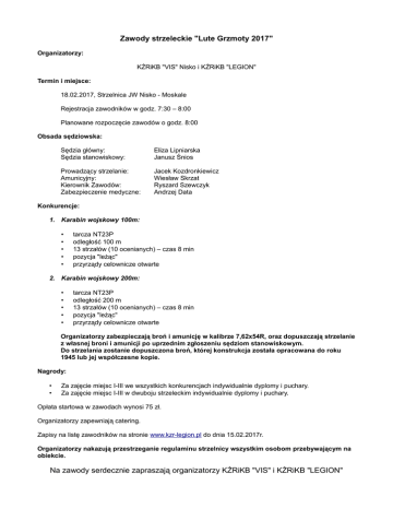 Zawody strzeleckie "Lute Grzmoty 2017" Organizatorzy: KŻRiKB "VIS" Nisko i KŻRiKB "LEGION" Termin i miejsce: 18.02.2017, Strzelnica JW Nisko - Moskale Rejestracja zawodników w godz. 7:30 – 8:00 Planowane rozpoczęcie zawodów o godz. 8:00 Obsada sędziowska: Sędzia główny: Sędzia stanowiskowy: Eliza Lipniarska Janusz Śnios Prowadzący strzelanie: Amunicyjny: Kierownik Zawodów: Zabezpieczenie medyczne: Jacek Kozdronkiewicz Wiesław Skrzat Ryszard Szewczyk Andrzej Data Konkurencje: 1. Karabin wojskowy 100m: • • • • • tarcza NT23P odległość 100 m 13 strzałów (10 ocenianych) – czas 8 min pozycja "leżąc" przyrządy celownicze otwarte 2. Karabin wojskowy 200m: • • • • • tarcza NT23P odległość 200 m 13 strzałów (10 ocenianych) – czas 8 min pozycja "leżąc" przyrządy celownicze otwarte Organizatorzy zabezpieczają broń i amunicję w kalibrze 7,62x54R, oraz dopuszczają strzelanie z własnej broni i amunicji po uprzednim zgłoszeniu sędziom stanowiskowym. Do strzelania zostanie dopuszczona broń, której konstrukcja została opracowana do roku 1945 lub jej współczesne kopie. Nagrody: • • Za zajęcie miejsc I-III we wszystkich konkurencjach indywidualnie dyplomy i puchary. Za zajęcie miejsc I-III w dwuboju strzeleckim indywidualnie dyplomy i puchary. Opłata startowa w zawodach wynosi 75 zł. Organizatorzy zapewniają catering. Zapisy na listę zawodników na stronie www.kzr-legion.pl do dnia 15.02.2017r. Organizatorzy nakazują przestrzeganie regulaminu strzelnicy wszystkim osobom przebywającym na obiekcie. Na zawody serdecznie zapraszają organizatorzy KŻRiKB "VIS" i KŻRiKB "LEGION"