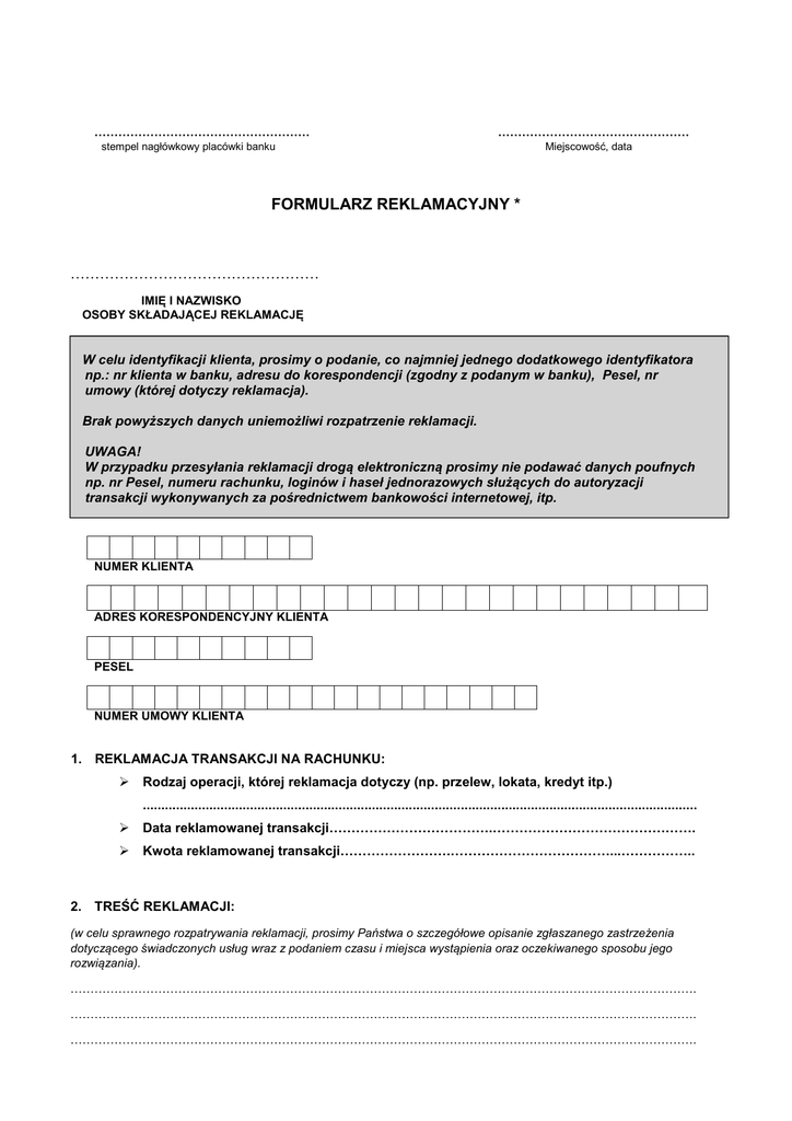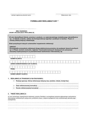 ……………………………………………… ………………………………………… stempel nagłówkowy placówki banku Miejscowość, data FORMULARZ REKLAMACYJNY * …………………………………………… IMIĘ I NAZWISKO OSOBY SKŁADAJĄCEJ REKLAMACJĘ W celu identyfikacji klienta, prosimy o podanie, co najmniej jednego dodatkowego identyfikatora np.: nr klienta w banku, adresu do korespondencji (zgodny z podanym w banku), Pesel, nr umowy (której dotyczy reklamacja). Brak powyższych danych uniemożliwi rozpatrzenie reklamacji. UWAGA! W przypadku przesyłania reklamacji drogą elektroniczną prosimy nie podawać danych poufnych np. nr Pesel, numeru rachunku, loginów i haseł jednorazowych służących do autoryzacji transakcji wykonywanych za pośrednictwem bankowości internetowej, itp. NUMER KLIENTA ADRES KORESPONDENCYJNY KLIENTA PESEL NUMER UMOWY KLIENTA 1. REKLAMACJA TRANSAKCJI NA RACHUNKU: Rodzaj operacji, której reklamacja dotyczy (np. przelew, lokata, kredyt itp.) ...................................................................................................................................................... Data reklamowanej transakcji……………………………….………………………………………. Kwota reklamowanej transakcji…………………….………………………………...…………….. 2. TREŚĆ REKLAMACJI: (w celu sprawnego rozpatrywania reklamacji, prosimy Państwa o szczegółowe opisanie zgłaszanego zastrzeżenia dotyczącego świadczonych usług wraz z podaniem czasu i miejsca wystąpienia oraz oczekiwanego sposobu jego rozwiązania). …………………………………………………………………………………………………………………………………………. …………………………………………………………………………………………………………………………………………. …………………………………………………………………………………………………………………………………………. …………………………………………………………………………………………………………………………………………. …………………………………………………………………………………………………………………………………………. …………………………………………………………………………………………………………………………………………. …………………………………………………………………………………………………………………………………………. …………………………………………………………………………………………………………………………………………. …………………………………………………………………………………………………………………………………………. 3. WYBÓR FORMY ODPOWIEDZI **: Listownie na adres:……………………………………………………………………………………………………….. Mailem na adres (pismo w formie pliku PDF):……………………………………………………………………………… Inny trwały nośnik informacji (np. płyta CD-ROM) ZAŁĄCZNIKI: 1. ………………………………………………………………………………………………. 2. ……………………………………………………………………………………………….. Zgodnie z ustawą z dnia 29 sierpnia 1997r. o ochronie danych osobowych (tj. Dz. U. z 2014r. poz. 1182 z późn. zm.) wyrażam zgodę na przetwarzanie moich danych osobowych w celach związanych z procesem rozpatrywania reklamacji przez Bank Spółdzielczy Rzemiosła w Krakowie z siedzibą w Krakowie ul. Dunajewskiego 7, 31-133 Kraków, którego akta rejestrowe są przechowywane w Sądzie Rejonowym dla Krakowa-Śródmieścia XI Wydział Gospodarczy Krajowego Rejestru Sądowego pod numerem KRS 0000096040. ……………...……………………………………………….. Podpis zgodny z posiadanym przez Bank BSR w Krakowie * Niniejszy formularz nie dotyczy reklamacji transakcji dokonanej kartą płatniczą, ** Wstawić X w wybrane pole, Wypełnia Pracownik Banku Oświadczam, że przyjąłem reklamację w dniu ………………………... ………………………………………………………… Czytelny podpis/pieczątka Pracownika Banku