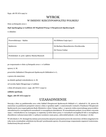 Sygn. akt III AUa 949/12 WYROK W IMIENIU RZECZYPOSPOLITEJ POLSKIEJ Dnia 15 listopada 2012 r. Sąd Apelacyjny w Lublinie III Wydział Pracy i Ubezpieczeń Społecznych w składzie: Przewodniczący - Sędzia SA Elżbieta Czaja (spr.) Sędziowie: SA Barbara Mazurkiewicz-Nowikowska SA Teresa Czekaj Protokolant: st. prot. sądowy Maciej Mazuryk po rozpoznaniu w dniu 15 listopada 2012 r. w Lublinie sprawy A. M. przeciwko Zakładowi Ubezpieczeń Społecznych Oddziałowi w L. o prawo do emerytury na skutek apelacji wnioskodawcy A. M. od wyroku Sądu Okręgowego w Lublinie z dnia 28 sierpnia 2012 r. sygn. akt VII U 1249/12 oddala apelację. Sygn. akt III AUa 949/12 UZASADNIENIE Decyzją z dnia 24 października 2011 roku Zakład Ubezpieczeń Społecznych Oddział w L. odmówił A. M. prawa do emerytury na podstawie przepisów ustawy z dnia 17 grudnia 1998 r. o emeryturach i rentach z Funduszu Ubezpieczeń Społecznych oraz rozporządzenia Rady Ministrów z dnia 7 lutego 1983 r. w sprawie wieku emerytalnego pracowników zatrudnionych w szczególnych warunkach i w szczególnym charakterze. W uzasadnieniu podano, że na dzień 1 stycznia 1999 r. wnioskodawca na wymagany co najmniej 15-letni okres pracy w warunkach szczególnych lub w szczególnym charakterze wykonywanej stale i w pełnym wymiarze czasu pracy, udowodnił jedynie 1 rok, 8 miesięcy i 16 dni . W odwołaniu A. M. domagał się zmiany powyższej decyzji przez przyznanie prawa do emerytury od dnia osiągnięcia 60 roku życia ewentualnie uchylenia tej decyzji i przekazania sprawy do ponownego rozpoznania organowi rentowemu. Zaskarżonej decyzji zarzucił : 1. naruszenia prawa materialnego, tj. art. 184 ust. 1 ustawy z dnia 17 grudnia 1998 r. o emeryturach i rentach z Funduszu Ubezpieczeń Społecznych w związku z § 2, 4 ust. 1 oraz wykazem A - dział XIV, poz. 24, pkt 1 stanowiącym załącznik do rozporządzenia Rady Ministrów z dnia 7 lutego 1983 r. w sprawie wieku emerytalnego pracowników zatrudnionych w szczególnych warunkach lub w szczególnym charakterze. W ocenie wnioskodawcy spełnił on wszystkie przesłanki do nabycia prawa do wcześniejszej emerytury. Kwestionowane okresy pracy w szczególnych warunkach został stwierdzone przez zatrudniający go zakład pracy zgodnie z przepisami rozporządzenia i w oparciu o dane dotyczące rodzaju wykonywanych prac w tamtym okresie. Powyższe zasady zaliczania określonych stanowisk do wykonywanych w warunkach szczególnych były potwierdzone także zarządzeniem nr 9 Ministra' Budownictwa i (...) z dnia 11 sierpnia 1983 r. w sprawie wykazu stanowisk pracy w zakładach pracy nadzorowanych przez Ministra Budownictwa i Przemysłu Materiałów Budowlanych. 2. naruszenia przepisów postępowania, tj. art. 7 i 77 k.p.a, poprzez nie wyjaśnienie wszystkich okoliczności sprawy bowiem ubezpieczony w kwestionowanych okresach wykonywał prace w szczególnych warunkach określonych w przepisach wykonawczych jako pracownik kontroli jakości produkcji i usług oraz nadzoru inżynieryjno-technicznego wykonujący swoje obowiązki w terenie razem z innymi pracownikami zatrudnionymi w warunkach szczególnych. Wykonywanie czynności „papierkowych” nie zajmowało ubezpieczonemu więcej niż pół godziny dziennie. W odpowiedzi na odwołanie organ rentowy wnosił o jego oddalenie. Wyrokiem z dnia 28 sierpnia 2012 roku Sąd Okręgowy w Lublinie oddalił odwołanie . Podstawa wyroku były następujące ustalenia : A. M. urodzony w dniu (...) Od 1989 r. do chwili obecnej prowadzi pozarolniczą działalność gospodarczą w formie sklepu obuwniczego. Decyzją z dnia 22 lutego 2000 r. przyznano skarżącemu prawo do renty z tytułu częściowej niezdolności do pracy od dnia 3 lutego 2000 r. Kolejnymi decyzjami prawo do świadczenia przyznawane było na dalsze okresy, a decyzją z dnia 3 lutego 2011 r. prawo do renty przyznane zostało do dnia 31 stycznia 2013 r. W dniu 21 września 2011 r. A. M. złożył wniosek o emeryturę, w treści którego zawarł oświadczenie o tym, że nie jest członkiem otwartego funduszu emerytalnego oraz oświadczył, że nie pozostaje w stosunku pracy. Do wniosku dołączył 7 świadectw wykonywania prac w szczególnych warunkach - wszystkie wystawione w dniu 17 maja 2011 r. przez C. Polska Sp. Z 0.0. Zakład Cementownia (...). Wynika z nich, że stale i w pełnym wymiarze czasu wykonywał prace polegające na kontroli międzyoperacyjnej, kontroli jakości produkcji i usług oraz dozorze inżynieryjno-technicznym na wydziałach i oddziałach, w których jako podstawowe wykonywane są prace wymienione w rozporządzeniu Rady Ministrów z dnia 7 lutego 1983 r. (Dz.U. z 1983 r. Nr 8, poz. 43 ze zm.) - wykaz A, dział XIV, poz. 24 na stanowiskach odpowiadających stanowisku podanemu w wykazie A, dział XIV, poz. 24, pkt 1 załącznika do zarządzenia nr 9 Ministra Budownictwa i (...) ' (...) z dnia 11 sierpnia 1983 r. w sprawie wykazu stanowisk pracy w zakładach pracy nadzorowanych przez Ministra Budownictwa i Przemysłu Materiałów Budowlanych, na których wykonywane są prace w szczególnych warunkach, uprawniające do wcześniejszego przejścia na emeryturę oraz wzrostu emerytury lub renty (Dz.Urz. MBiPMB Nr 3, poz. ( 6), w następujących okresach: 1. od dnia 29 października 1974 r. do dnia 14 lutego 1975 r. na stanowisku stażysty, 2. od dnia 15 lutego 1975 r. do dnia 2 marca 1976 r. na stanowisku Kierownika Oddziału W. Nadkładu i Rekultywacji, 3. od dnia 3 marca 1976 r. do dnia 31 lipca 1977 r. na stanowisku Starszego Mistrza Wydziału Kopalni (...), 4. od dnia 1 sierpnia 1977 r. do dnia 31 lipca 1979 r. na stanowisku Kierownika Wydziału Kopalni (...), 5. od dnia 1 sierpnia 1979 r. do dnia 31 maja 1981 r. na stanowisku Zastępcy Szefa Produkcji do spraw Kopalni (...) , 6. do dnia i czerwca 1981 r. do dnia 22 lipca 1986 r. na stanowisku Głównego Inżyniera do spraw Produkcji - Zastępcy Kierownika (...) Zakładu (...), 7. od dnia 23 lipca 1986 r. do dnia 31 grudnia 1
