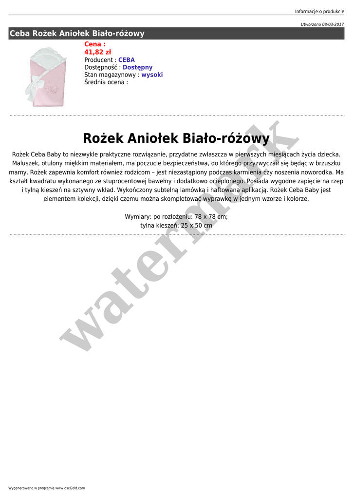 Informacje o produkcie Utworzono 08-03-2017 Ceba Rożek Aniołek Biało-różowy Cena : 41,82 zł Producent : CEBA Dostępność : Dostępny Stan magazynowy : wysoki Średnia ocena : er m ar k Rożek Aniołek Biało-różowy Rożek Ceba Baby to niezwykle praktyczne rozwiązanie, przydatne zwłaszcza w pierwszych miesiącach życia dziecka. Maluszek, otulony miękkim materiałem, ma poczucie bezpieczeństwa, do którego przyzwyczaił się będąc w brzuszku mamy. Rożek zapewnia komfort również rodzicom – jest niezastąpiony podczas karmienia czy noszenia noworodka. Ma kształt kwadratu wykonanego ze stuprocentowej bawełny i dodatkowo ocieplonego. Posiada wygodne zapięcie na rzep i tylną kieszeń na sztywny wkład. Wykończony subtelną lamówką i haftowaną aplikacją. Rożek Ceba Baby jest elementem kolekcji, dzięki czemu można skompletować wyprawkę w jednym wzorze i kolorze. w at Wymiary: po rozłożeniu: 78 x 78 cm; tylna kieszeń: 25 x 50 cm Wygenerowano w programie www.oscGold.com
