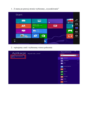 1. Z menu po prawej stronie wybieramy „wyszukiwanie” 2. wpisujemy cmd i wybieramy wiersz polecenia 3. otworzy się nowe okno, wpisujemy w nim komendę „ipconfig /all” i potwierdzamy wciskając Enter 4. z listy wyszukujemy „karta ethernet połączenie lokalne” i „adres sieciowy”, który podajemy podczas zgłoszenia