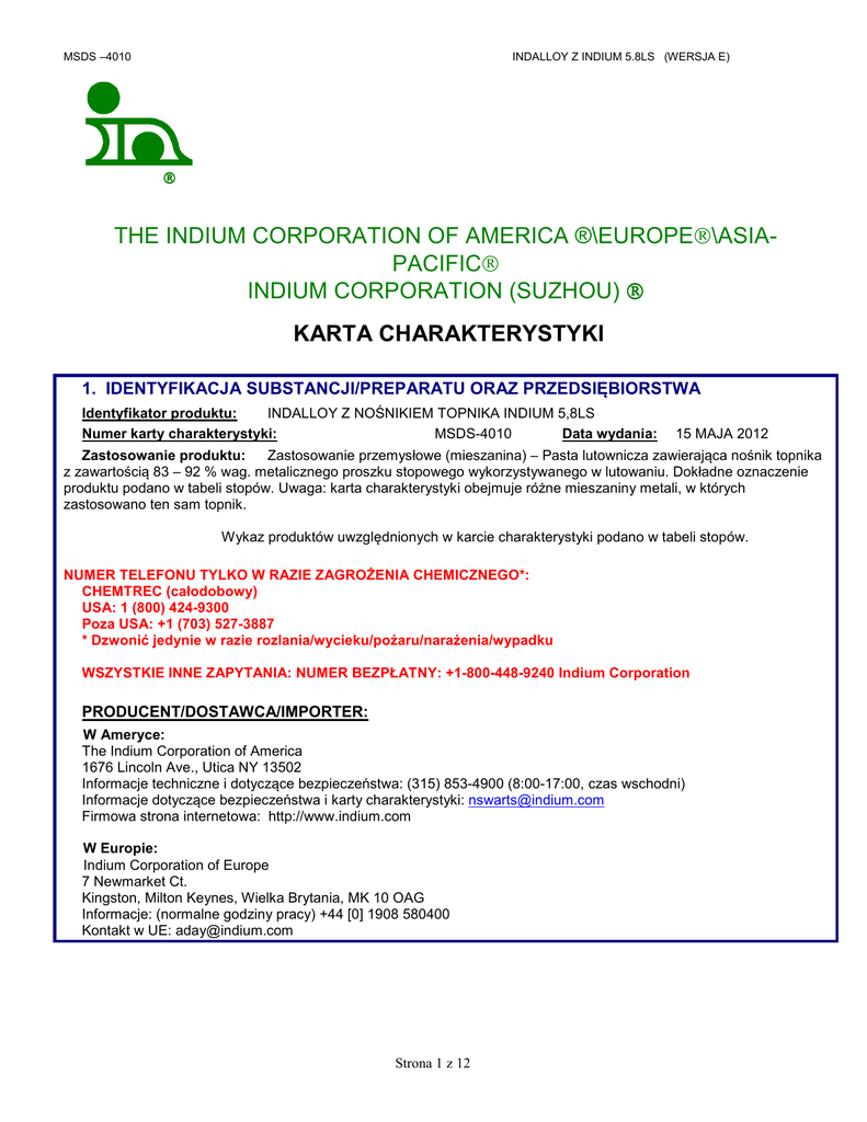 MSDS –4010 INDALLOY Z INDIUM 5.8LS (WERSJA E) THE INDIUM CORPORATION OF AMERICA ®\EUROPE\ASIAPACIFIC INDIUM CORPORATION (SUZHOU) KARTA CHARAKTERYSTYKI 1. IDENTYFIKACJA SUBSTANCJI/PREPARATU ORAZ PRZEDSIĘBIORSTWA Identyfikator produktu: INDALLOY Z NOŚNIKIEM TOPNIKA INDIUM 5,8LS Numer karty charakterystyki: MSDS-4010 Data wydania: 15 MAJA 2012 Zastosowanie produktu: Zastosowanie przemysłowe (mieszanina) – Pasta lutownicza zawierająca nośnik topnika z zawartością 83 – 92 % wag. metalicznego proszku stopowego wykorzystywanego w lutowaniu. Dokładne oznaczenie produktu podano w tabeli stopów. Uwaga: karta charakterystyki obejmuje różne mieszaniny metali, w których zastosowano ten sam topnik. Wykaz produktów uwzględnionych w karcie charakterystyki podano w tabeli stopów. NUMER TELEFONU TYLKO W RAZIE ZAGROŻENIA CHEMICZNEGO*: CHEMTREC (całodobowy) USA: 1 (800) 424-9300 Poza USA: +1 (703) 527-3887 * Dzwonić jedynie w razie rozlania/wycieku/pożaru/narażenia/wypadku WSZYSTKIE INNE ZAPYTANIA: NUMER BEZPŁATNY: +1-800-448-9240 Indium Corporation PRODUCENT/DOSTAWCA/IMPORTER: W Ameryce: The Indium Corporation of America 1676 Lincoln Ave., Utica NY 13502 Informacje techniczne i dotyczące bezpieczeństwa: (315) 853-4900 (8:00-17:00, czas wschodni) Informacje dotyczące bezpieczeństwa i karty charakterystyki: [email protected] Firmowa strona internetowa: http://www.indium.com W Europie: Indium Corporation of Europe 7 Newmarket Ct. Kingston, Milton Keynes, Wielka Brytania, MK 10 OAG Informacje: (normalne godziny pracy) +44 [0] 1908 580400 Kontakt w UE: [email protected] Strona 1 z 12 MSDS –4010 INDALLOY Z INDIUM 5.8LS (WERSJA E) W Chinach: Indium Corporation (Suzhou) Co., Ltd. No. 428 Xinglong Street Suzhou Industrial Park Suchun Industrial Square Unit No. 14-C Jiangsu Province, Chiny 215126 Informacje: (86) 512-6283-4900 W Azji: Asia-Pacific Operations-Singapore 29 Kian Teck Avenue Singapur 628908 Informacje: +65 6268-8678 2. IDENTYFIKACJA ZAGROŻEŃ GŁÓWNE DROGI NARAŻENIA: ⊗Oczy ⊗Wdychanie ⊗Skóra Czynniki rakotwórcze wymienione w: ⊗Spożycie NTP IARC OSHA ⊗Niewymienione Klasyfikacja: Zwroty R: Wykazy ogólne Symbol X R36/37/38, R42/43 R33,R40,R48,R61, R50/53 (zakres stosowania, patrz karta charakterystyki) Pełna treść poszczególnych zwrotów R – patrz punkt 16. Informacje ogólne (GHS): produkty zawierające ołów Hasło ostrzegawcze: Ostrzeżenie Zwroty informujące o zagrożeniu H302 Działa szkodliwie po połknięciu H315 Działa drażniąco na skórę H317 Może powodować reakcję alergiczną skóry H332 Działa szkodliwie w następstwie wdychania H334 Może powodować objawy alergii lub astmy lub trudności w oddychaniu w następstwie wdychania H335 Może powodować podrażnienie dróg oddechowych. H351 Podejrzewa się, że powoduje raka (ołów) H360 Może działać szkodliwie na płodność lub na dziecko w łonie matki (dotyczy produktu zawierającego ołów) H373 Może powodować uszkodzenie narządów poprzez długotrwałe lub narażenie powtarzane (dotyczy produktu zawierającego ołów) EUH201A Uwaga! Zawiera ołów (dotyczy jedynie wymienionych produktów zawierających ołów). Patrz wykaz. EUH208 Zawiera kalafonię. Może powodować wystąpienie reakcji alergicznej H400+H413 Działa bardzo toksycznie na organizmy wodne, może powodować długotrwałe szkodliwe skutki dla organizmów wodnych (ołów) Informacje ostrzegawcze P233 Przechowywać pojemnik szczelnie zamknięty. P261 Unikać wdychania pyłu/dymu/gazu/mgły/par/rozpylonej cieczy P270 Nie jeść, nie pić i nie palić podczas używania produktu Strona 2 z 12 MSDS –4010 INDALLOY Z INDIUM 5.8LS (WERSJA E) P273 P280 P362 P302 +P352 P304 + 341 Unikać uwolnienia do środowiska Stosować rękawice ochronne/ odzież ochronną/ ochronę oczu /ochronę twarzy Zanieczyszczoną odzież zdjąć i wyprać przed ponownym użyciem W PRZYPADKU KONTAKTU ZE SKÓRĄ:: Umyć dużą ilością wody z mydłem. W PRZYPADKU DOSTANIA SIĘ DO DRÓG ODDECHOWYCH: W przypadku trudności z oddychaniem, wyprowadzić lub wynieść poszkodowanego na świeże powietrze i zapewnić warunki do odpoczynku w pozycji umożliwiającej swobodne oddychanie. P305 + 351 W PRZYPADKU DOSTANIA SIĘ DO OCZU:: Ostrożnie płukać wodą przez kilka minut. ----------------------------------------------------------------------------------------------------------------------------------------------------------------INNE ZAGROŻENIA: MOŻLIWE SKUTKI DLA ZDROWIA: Kontakt z oczami: Kontakt z materiałem w temperaturze pokojowej lub z dymami materiału w typowej temperaturze lutowania rozpływowego ponad 100°C mo że powodować silne podrażnienie oczu. Połknięcie: Działa drażniąco na przewód pokarmowy. Może wywoływać oparzenia. Wdychanie: Opary lub dymy materiału w typowej temperaturze lutowania rozpływowego ponad 100°C mog ą powodować miejscowe podrażnienie dróg oddechowych. Kalafonia może spowodować astmę zawodową. Kontakt ze skórą: Może wywoływać podrażnienie lub zapalenie skóry. Kalafonia może wywoływać uczulenie skóry. Przewlekłe: SREBRO: Długotrwały kontakt ze skórą lub spożycie proszku, soli lub dymów srebra może spowodować chorobę o nazwie argyria, powodującą niebieskawe zabarwienie skóry i oczu. CYNA: W badaniach na zwierzętach stwierdzono zwiększoną częstość występowania mięsaka. MIEDŹ: Nadmierne narażenie na dymy miedzi może powodować gorączkę miedziową (dreszcze, bóle mięśni, nudności, gorączka, suchość w gardle, kaszel, osłabienie, zobojętnienie), metaliczny lub słodki smak, przebarwienie skóry i włosów. OŁÓW: Długotrwałe narażenie na pary lub dymy w wyższej temperaturze może powodować podrażnienie dróg oddechowych i ogólnoustrojowe zatrucie ołowiem. Objawy zatrucia ołowiem obejmują ból głowy, nudności, ból brzucha, ból mięśni i stawów oraz uszkodzenie układu nerwowego, krwionośnego i nerek. 3. SKŁAD I INFORMACJA O SKŁADNIK