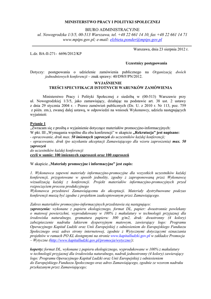 MINISTERSTWO PRACY I POLITYKI SPOŁECZNEJ BIURO ADMINISTRACYJNE ul. Nowogrodzka 1/3/5, 00-513 Warszawa, tel. +48 22 661 14 10, fax +48 22 661 14 71 www.mpips.gov.pl; e-mail: [email protected] Warszawa, dnia 23 sierpnia 2012 r. L.dz. BA-II-271- 6696/2012/KP Uczestnicy postępowania Dotyczy: postępowania o udzielenie zamówienia publicznego na Organizację dwóch jednodniowych konferencji – znak sprawy: 40/DWF/PN/2012. WYJAŚNIENIE TREŚCI SPECYFIKACJI ISTOTNYCH WARUNKÓW ZAMÓWIENIA Ministerstwo Pracy i Polityki Społecznej z siedzibą w (00-513) Warszawie przy ul. Nowogrodzkiej 1/3/5, jako zamawiający, działając na podstawie art. 38 ust. 2 ustawy z dnia 29 stycznia 2004 r. - Prawo zamówień publicznych (Dz. U. z 2010 r. Nr 113, poz. 759 z późn. zm.), zwanej dalej ustawą, w odpowiedzi na wniosek Wykonawcy, udziela następujących wyjaśnień: Pytanie 1 „Zwracam się z prośbą o wyjaśnienie dotyczące materiałów promocyjno-informacyjnych: W pkt. III „Wymagania wspólne dla obu konferencji” w akapicie „Rekrutacja” jest napisane: - opracowanie, druk max. 50 imiennych zaproszeń do uczestników kaŜdej konferencji; - opracowanie, druk (po uzyskaniu akceptacji Zamawiającego dla wzoru zaproszenia) max. 50 zaproszeń do uczestników kaŜdej konferencji czyli w sumie: 100 imiennych zaproszeń oraz 100 zaproszeń W akapicie „Materiały promocyjne i informacyjne” jest zapis: 1. Wykonawca zapewni materiały informacyjno-promocyjne dla wszystkich uczestników kaŜdej konferencji, przygotowane w sposób jednolity, zgodny z zaproponowaną przez Wykonawcę wizualizacją kaŜdej z konferencji. Projekt materiałów informacyjno-promocyjnych przed rozpoczęciem procesu produkcyjnego Wykonawca przedstawi Zamawiającemu do akceptacji. Materiały dystrybuowane podczas konferencji muszą być zgodne z projektem zaakceptowanym przez Zamawiającego. Zakres materiałów promocyjno-informacyjnych przedstawia się następująco: zaproszenia: wykonane z papieru ekologicznego, format DL, papier: dwustronnie powlekany o matowej powierzchni, wyprodukowany w 100% z makulatury w technologii przyjaznej dla środowiska naturalnego, gramatura papieru: 300 g/m2, druk: dwustronny (4 kolory) zabezpieczenie nadruku lakierem dyspersyjnym matowym, zawierający logo: Programu Operacyjnego Kapitał Ludzki oraz Unii Europejskiej z odniesieniem do Europejskiego Funduszu Społecznego oraz adres strony internetowej, zgodnie z Wytycznymi dotyczącymi oznaczania projektów w ramach PO KL dostępnymi na stronie www.kapitalludzki.gov.pl w zakładce Promocja – Wytyczne (http://www.kapitalludzki.gov.pl/promocja/wytyczne/); koperty: format DL, wykonane z papieru ekologicznego, wyprodukowane w 100% z makulatury w technologii przyjaznej dla środowiska naturalnego, nadruk jednostronny (4 kolory) zawierający logo: Programu Operacyjnego Kapitał Ludzki oraz Unii Europejskiej z odniesieniem do Europejskiego Funduszu Społecznego oraz adres Zamawiającego, zgodnie ze wzorem nadruku przekazanym przez Zamawiającego; Czyli w sumie: zaproszenia i koperty w ilości 270 sztuk (120 sztuk na etap I oraz 150 sztuk na etap II) co pozostaje w sprzeczności z wcześniejszym zapisem. Proszę o wyjaśnienie jaka jest właściwa ilość zaproszeń oraz kopert (wraz z informacją czy są to zaproszenia imienne czy ogólne)?” Odpowiedź Ilość zaproszeń jaką Wykonawca jest zobowiązany wydrukować, została wskazana w pkt 3 i 4 „Rekrutacja”: opracowanie, druk (po uzyskaniu akceptacji Zamawiającego dla wzoruzaproszenia) i wysyłka max. 50 imiennych zaproszeń do uczestników kaŜdej konferencji na min. 20 dni przed datą kaŜdej z konferencji (pkt 3) oraz opracowanie, druk (po uzyskaniu akceptacji Zamawiającego dla wzoru zaproszenia) max. 50 ogólnych zaproszeń do uczestników kaŜdej konferencji i dostarczenie ich do siedziby Zamawiającego na min. 20 dni przed datą kaŜdej (pkt 4). Wykonawca zapewnia zaproszenia dla wszystkich planowanych uczestników konferencji poprzez opracowanie graficznego projektu zaproszenia (w wersji umoŜliwiającej druk) w formacie i na papierze określonym w pkt „Materiały promocyjne i informacyjne”. Jeśli Zamawiający uzna, Ŝe niezbędny jest druk większej liczby zaproszeń, wówczas dokona ich dodruku z własnych środków z opracowanego graficznie projektu Wykonawcy. Pytanie 2 Czy istnieje moŜliwość zorganizowania cateringu w wyodrębnionej części (korytarz lub oddzielna sala obok) na terenie Ministerstwa Rozwoju Regionalnego, przy Sali konferencyjnej (kinowej) w dniu 22 października 2012 roku. Czy jest to usługa odpłatna? Odpowiedź Istnieje moŜliwość zorganizowania cateringu w foyer sali konferencyjnej (kinowej) w dniu 22 października 2012 r. Udostępnienie przez Ministerstwo Rozwoju Regionalnego foyer jest nieodpłatne, natomiast zapewnienie cateringu leŜy po stronie Wykonawcy zgodnie z Załącznikiem nr 2 do SIWZ (Opis przedmiotu zamówienia). Pytanie 3 Czy bannery mają być zakupione czy wypoŜyczone? Odpowiedź Zgodnie z treścią Załącznika nr 2 do SIWZ (Opis przedmiotu zamówienia) w pkt „Materiały promocyjne i informacyjne” (pkt 3) Wykonawca zapewni zaprojektowanie i wykonanie, po akceptacji oraz według wskazówek Zamawiającego, po 1 rozwijalnym bannerze na kaŜdą konferencję (rozmiar: 85x200 cm, materiał powlekany, kaseta z aluminium z mechanizmem samozwijającym, nadruk kolorowy, jednostronny, pokrowiec). Nadruk powinien zawierać logo: Programu Operacyjnego Kapitał Ludzki oraz Unii Europejskiej z odniesieniem do Europejskiego Funduszu Społecznego oraz adres strony internetowej, zgodnie z Wytycznymi dot. oznaczania projektów PO KL. Zgodnie ze wzorem umowy stanowiącej Załącznik nr 4 do SIWZ bannery stają się własnością Zamawiającego. Pytanie 4 Jaką ilość materiałów promocyjnych naleŜy wykonać czy 270 szt. ? Odpowiedź Zgodnie z treścią Załącznika nr 2 do SIWZ (Opis przedmiotu zamówienia) w pkt „Materiały promocyjne i i