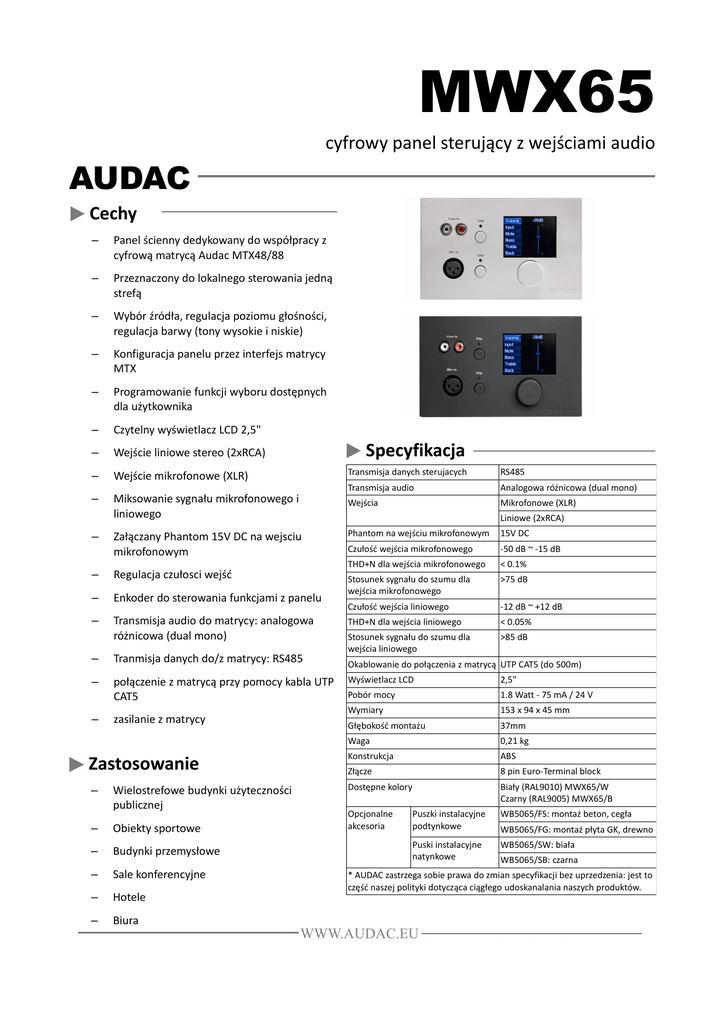MWX65 cyfrowy panel sterujący z wejściami audio AUDAC Cechy – Panel ścienny dedykowany do współpracy z cyfrową matrycą Audac MTX48/88 – Przeznaczony do lokalnego sterowania jedną strefą – Wybór źródła, regulacja poziomu głośności, regulacja barwy (tony wysokie i niskie) – Konfiguracja panelu przez interfejs matrycy MTX – Programowanie funkcji wyboru dostępnych dla użytkownika – Czytelny wyświetlacz LCD 2,5" – Wejście liniowe stereo (2xRCA) – Wejście mikrofonowe (XLR) Transmisja danych sterujacych RS485 – Miksowanie sygnału mikrofonowego i liniowego Transmisja audio Analogowa różnicowa (dual mono) Wejścia Mikrofonowe (XLR) – Specyfikacja Liniowe (2xRCA) Załączany Phantom 15V DC na wejsciu mikrofonowym – Regulacja czułosci wejść – Enkoder do sterowania funkcjami z panelu – Transmisja audio do matrycy: analogowa różnicowa (dual mono) – Tranmisja danych do/z matrycy: RS485 – połączenie z matrycą przy pomocy kabla UTP CAT5 – zasilanie z matrycy Zastosowanie – Wielostrefowe budynki użyteczności publicznej – Obiekty sportowe – Budynki przemysłowe – Sale konferencyjne – Hotele – Biura Phantom na wejściu mikrofonowym 15V DC Czułość wejścia mikrofonowego -50 dB ~ -15 dB THD+N dla wejścia mikrofonowego < 0.1% Stosunek sygnału do szumu dla wejścia mikrofonowego >75 dB Czułość wejścia liniowego -12 dB ~ +12 dB THD+N dla wejścia liniowego < 0.05% Stosunek sygnału do szumu dla wejścia liniowego >85 dB Okablowanie do połączenia z matrycą UTP CAT5 (do 500m) Wyświetlacz LCD 2,5" Pobór mocy 1.8 Watt - 75 mA / 24 V Wymiary 153 x 94 x 45 mm Głębokość montażu 37mm Waga 0,21 kg Konstrukcja ABS Złącze 8 pin Euro-Terminal block Dostępne kolory Biały (RAL9010) MWX65/W Czarny (RAL9005) MWX65/B Opcjonalne akcesoria Puszki instalacyjne podtynkowe WB5065/FS: montaż beton, cegła Puski instalacyjne natynkowe WB5065/SW: biała WB5065/FG: montaż płyta GK, drewno WB5065/SB: czarna * AUDAC zastrzega sobie prawa do zmian specyfikacji bez uprzedzenia: jest to część naszej polityki dotycząca ciągłego udoskanalania naszych produktów. WWW.AUDAC.EU