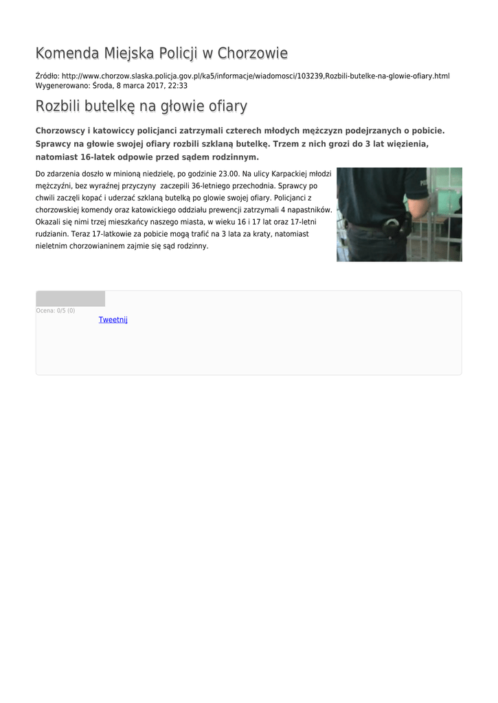Komenda Miejska Policji w Chorzowie Źródło: http://www.chorzow.slaska.policja.gov.pl/ka5/informacje/wiadomosci/103239,Rozbili-butelke-na-glowie-ofiary.html Wygenerowano: Środa, 8 marca 2017, 22:33 Rozbili butelkę na głowie ofiary Chorzowscy i katowiccy policjanci zatrzymali czterech młodych mężczyzn podejrzanych o pobicie. Sprawcy na głowie swojej ofiary rozbili szklaną butelkę. Trzem z nich grozi do 3 lat więzienia, natomiast 16-latek odpowie przed sądem rodzinnym. Do zdarzenia doszło w minioną niedzielę, po godzinie 23.00. Na ulicy Karpackiej młodzi mężczyźni, bez wyraźnej przyczyny zaczepili 36-letniego przechodnia. Sprawcy po chwili zaczęli kopać i uderzać szklaną butelką po glowie swojej ofiary. Policjanci z chorzowskiej komendy oraz katowickiego oddziału prewencji zatrzymali 4 napastników. Okazali się nimi trzej mieszkańcy naszego miasta, w wieku 16 i 17 lat oraz 17-letni rudzianin. Teraz 17-latkowie za pobicie mogą trafić na 3 lata za kraty, natomiast nieletnim chorzowianinem zajmie się sąd rodzinny. Ocena: 0/5 (0) Tweetnij