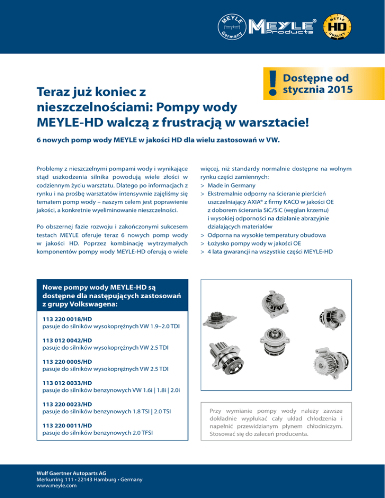! Dostępne od stycznia 2015 Teraz już koniec z nieszczelnościami: Pompy wody MEYLE-HD walczą z frustracją w warsztacie! 6 nowych pomp wody MEYLE w jakości HD dla wielu zastosowań w VW. Problemy z nieszczelnymi pompami wody i wynikające stąd uszkodzenia silnika powodują wiele złości w codziennym życiu warsztatu. Dlatego po informacjach z rynku i na prośbę warsztatów intensywnie zajęliśmy się tematem pomp wody – naszym celem jest poprawienie jakości, a konkretnie wyeliminowanie nieszczelności. Po obszernej fazie rozwoju i zakończonymi sukcesem testach MEYLE oferuje teraz 6 nowych pomp wody w jakości HD. Poprzez kombinację wytrzymałych komponentów pompy wody MEYLE-HD oferują o wiele więcej, niż standardy normalnie dostępne na wolnym rynku części zamiennych: > Made in Germany >Ekstremalnie odporny na ścieranie pierścień uszczelniający AXIA® z firmy KACO w jakości OE z doborem ścierania SiC/SiC (węglan krzemu) i wysokiej odporności na działanie abrazyjnie działających materiałów > Odporna na wysokie temperatury obudowa > Łożysko pompy wody w jakości OE > 4 lata gwarancji na wszystkie części MEYLE-HD Nowe pompy wody MEYLE-HD są dostępne dla następujących zastosowań z grupy Volkswagena: 113 220 0018/HD pasuje do silników wysokoprężnych VW 1.9–2.0 TDI 113 012 0042/HD pasuje do silników wysokoprężnych VW 2.5 TDI 113 220 0005/HD pasuje do silników wysokoprężnych VW 2.5 TDI 113 012 0033/HD pasuje do silników benzynowych VW 1.6i | 1.8i | 2.0i 113 220 0023/HD pasuje do silników benzynowych 1.8 TSI | 2.0 TSI 113 220 0011/HD pasuje do silników benzynowych 2.0 TFSI Wulf Gaertner Autoparts AG Merkurring 111 • 22143 Hamburg • Germany www.meyle.com Przy wymianie pompy wody należy zawsze dokładnie wypłukać cały układ chłodzenia i napełnić przewidzianym płynem chłodniczym. Stosować się do zaleceń producenta.
