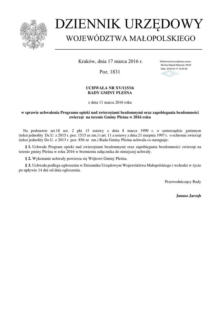 DZIENNIK URZĘDOWY WOJEWÓDZTWA MAŁOPOLSKIEGO Kraków, dnia 17 marca 2016 r. Elektronicznie podpisany przez: Monika Majsak-Białczyk; MUW Poz. 1831 Data: 2016-03-17 15:00:28 UCHWAŁA NR XV/115/16 RADY GMINY PLEŚNA z dnia 11 marca 2016 roku w sprawie uchwalenia Programu opieki nad zwierzętami bezdomnymi oraz zapobiegania bezdomności zwierząt na terenie Gminy Pleśna w 2016 roku Na podstawie art.18 ust. 2 pkt 15 ustawy z dnia 8 marca 1990 r. o samorządzie gminnym (tekst jednolity Dz.U. z 2015 r. poz. 1515 ze zm.) i art. 11 a ustawy z dnia 21 sierpnia 1997 r. o ochronie zwierząt (tekst jednolity Dz.U. z 2013 r. poz. 856 ze zm.) Rada Gminy Pleśna uchwala co następuje: § 1. Uchwala Program opieki nad zwierzętami bezdomnymi oraz zapobiegania bezdomności zwierząt na terenie gminy Pleśna w roku 2016 w brzmieniu załącznika do niniejszej uchwały. § 2. Wykonanie uchwały powierza się Wójtowi Gminy Pleśna. § 3. Uchwała podlega ogłoszeniu w Dzienniku Urzędowym Województwa Małopolskiego i wchodzi w życie po upływie 14 dni od dnia ogłoszenia. Przewodniczący Rady Janusz Jarząb Dziennik Urzędowy Województwa Małopolskiego –2– Poz. 1831 Załącznik do Uchwały Nr XV/115/16 Rady Gminy Pleśna z dnia 11 marca 2016 r. Program opieki nad zwierzętami bezdomnymi oraz zapobiegania bezdomności zwierząt na terenie Gminy Pleśna w 2016 roku Rozdział 1. Cele i zadania programu § 1. Cele programu 1. Zapewnienie opieki nad zwierzętami bezdomnymi w rozumieniu art. 4 pkt. 16 ustawy z dnia 21 sierpnia 1997 r. o ochronie zwierząt (Dz. U. z 2013 r. poz. 856 ze zm.) zwanej dalej „ustawą” 2. Zapobieganie bezdomności zwierząt. 3. Zmniejszanie populacji bezdomnych zwierząt. § 2. Zadania programu W ramach programu Gmina Pleśna realizuje zadania: 1. Zapewnienia bezdomnym zwierzętom miejsca w schronisku dla zwierząt; 2. Opieki nad wolno żyjącymi kotami, w tym ich dokarmianie; 3. Odławiania bezdomnych zwierząt; 4. Sterylizacji albo kastracji zwierząt oraz elektronicznego znakowania w schronisku; 5. Poszukiwania właścicieli dla bezdomnych zwierząt; 6. Usypiania ślepych miotów; 7. Zapewnienia miejsca dla bezdomnych zwierząt gospodarskich we wskazanym gospodarstwie rolnym; 8. Zapewnienia całodobowej opieki weterynaryjnej w przypadkach zdarzeń drogowych z udziałem zwierząt; § 3. Wykonawcami programu są 1. Gmina Pleśna 2. Schronisko dla zwierząt w Tarnowie 33-100 Tarnów ul. Cmentarna 31, zwanym dalej „schroniskiem” 3. Organizacje społeczne, stowarzyszenia, fundacje, których statutowym celem działania jest ochrona zwierząt 4. Gabinet Weterynaryjny „VITA-VET” Rzuchowa 315 5. Społeczni opiekunowie zwierząt Rozdział 2. Odławianie bezdomnych zwierząt i zapewnienie im miejsca w schronisku dla zwierząt § 4. Na terenie Gminy odławianie bezdomnych zwierząt będzie miało charakter stały Dziennik Urzędowy Województwa Małopolskiego –3– Poz. 1831 w odniesieniu do pojedynczych zgłoszeń dotyczących pozostawionych bez opieki zwierząt, które uciekły lub zabłąkały się, zostały porzucone przez człowieka w szczególności chorych lub powodujących zagrożenie dla bezpieczeństwa ludzi. § 5. 1. Zgłoszenia o zwierzętach przebywających na terenach ogólnie dostępnych Gminy, co do których istnieje przypuszczenie, że są bezdomne, przyjmować będzie Referat Organizacyjno-Administracyjny, który podejmie działania zmierzające do ustalenia właściciela bądź opiekuna zwierząt. 2. W przypadku nie ustalenia właściciela bądź opiekuna zwierzęcia, o którym mowa w ust.1, Referat Ogólno-Administracyjny, podejmie dalsze działania zmierzające do odłowu zwierzęcia i umieszczenia w schronisku dla zwierząt. § 6. 1. Gmina zapewnia opiekę bezdomnym zwierzętom poprzez utrzymywanie boksu w „schronisku’ na podstawie umowy zwartej z Przedsiębiorstwem Usług Komunalnych sp. z o.o. , która obejmuje również obowiązek odławiania bezdomnych zwierząt z terenu gminy Pleśna, co zapewnia nie tylko ochronę ludzi przed tymi zwierzętami, ale również ochronę tych zwierząt. 2. Organizacje pozarządowe, które posiadają przedstawicieli przeszkolonych w zakresie odławiania zwierząt domowych, a także odpowiedni sprzęt mogą odławiać bezdomne zwierzęta domowe na terenie Gminy Pleśna. Przekazanie przez organizację odłowionego zwierzęcia do schroniska, możliwe będzie po wcześniejszym uzgodnieniu z Referatem Organizacyjno-Administracyjnym Urzędu Gminy. § 7. Zwierzęta bezdomne oraz zwierzęta traktowane w sposób wskazany w art. 6 ust. 2 ustawy przewiezione i umieszczone: zostaną 1. w schronisku dla zwierząt jeżeli jest to zwierzę domowe 2. w gospodarstwie rolnym wskazanym w § 12 niniejszego programu jeżeli jest to zwierzę gospodarskie 3. ogrodzie zoologicznym lub schronisku, jeżeli jest to zwierzę wykorzystywane do celów określonych w art. 7 ust. 1 pkt. 3. ustawy Rozdział 3. Opieka nad wolno żyjącymi kotami, w tym ich dokarmianie § 8. 1. Koty wolno żyjące nie są zwierzętami bezdomnymi i nie są odławiane na zasadach określonych w rozdziale II niniejszego Programu. 2. Sprawowanie opieki nad kotami wolno żyjącymi realizowane jest poprzez: 1) zakup i wydawanie karmy społecznym opiekunom (karmicielom) kotów, którzy podpiszą z gminą deklarację na wykonywanie czynności karmienia i opieki nad kotami wolno żyjącymi. 2) czynności karmienia i opieki nad kotami wolno żyjącymi może sprawować pracownik gospodarczy gminy 3) finansowanie w uzasadnionych przypadkach leczenia kotów w ramach umowy zawartej z Gabinetem Weterynaryjnym „VITA-VET” 33-114 Rzuchowa 315 3. Gmina, na pisemny wniosek społecznego opiekuna (karmiciela) zwierząt może wydać skierowanie na przeprowadzenie zabiegu sterylizacji lub kastracji oraz leczenie kotów wolno żyjących przez Gabinet Weterynaryjny „VITA-VET ” 33-114 Rzuchowa 315, z którym Gmina zawarła stosowną umowę. Rozdział 4. Sterylizacja albo kastracja 