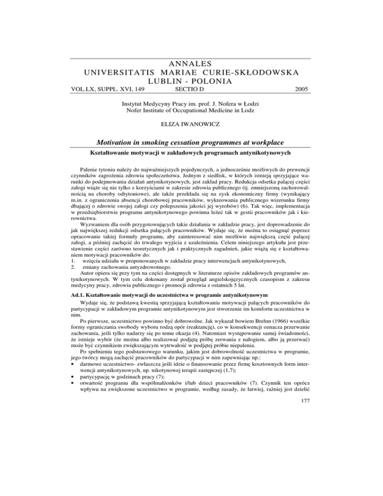 ANNALES UNIVERSITATIS MARIAE CURIE-SKŁODOWSKA LUBLIN - POLONIA VOL.LX, SUPPL. XVI, 149 SECTIO D 2005 Instytut Medycyny Pracy im. prof. J. Nofera w Łodzi Nofer Institute of Occupational Medicine in Lodz ELIZA IWANOWICZ Motivation in smoking cessation programmes at workplace Kształtowanie motywacji w zakładowych programach antynikotynowych Palenie tytoniu należy do najważniejszych pojedynczych, a jednocześnie możliwych do prewencji czynników zagrożenia zdrowia społeczeństwa. Jednym z siedlisk, w których istnieją sprzyjające warunki do podejmowania działań antynikotynowych, jest zakład pracy. Redukcja odsetka palącej części załogi wiąże się nie tylko z korzyściami w zakresie zdrowia publicznego (tj. zmniejszoną zachorowalnością na choroby odtytoniowe), ale także przekłada się na zysk ekonomiczny firmy (wynikający m.in. z ograniczenia absencji chorobowej pracowników, wykreowania publicznego wizerunku firmy dbającej o zdrowie swojej załogi czy polepszenia jakości jej wyrobów) (6). Tak więc, implementacja w przedsiębiorstwie programu antynikotynowego powinna leżeć tak w gestii pracowników jak i kierownictwa. Wyzwaniem dla osób przygotowujących takie działania w zakładzie pracy, jest doprowadzenie do jak największej redukcji odsetka palących pracowników. Wydaje się, że można to osiągnąć poprzez opracowanie takiej formuły programu, aby zainteresować nim możliwie największą część palącej załogi, a później zachęcić do trwałego wyjścia z uzależnienia. Celem niniejszego artykułu jest przestawienie części zarówno teoretycznych jak i praktycznych zagadnień, jakie wiążą się z kształtowaniem motywacji pracowników do: 1. wzięcia udziału w proponowanych w zakładzie pracy interwencjach antynikotynowych, 2. zmiany zachowania antyzdrowotnego. Autor opiera się przy tym na części dostępnych w literaturze opisów zakładowych programów antynikotynowych. W tym celu dokonany został przegląd angielskojęzycznych czasopism z zakresu medycyny pracy, zdrowia publicznego i promocji zdrowia z ostatnich 5 lat. Ad.1. Kształtowanie motywacji do uczestnictwa w programie antynikotynowym Wydaje się, że podstawą kwestią sprzyjającą kształtowaniu motywacji palących pracowników do partycypacji w zakładowym programie antynikotynowym jest stworzenie im komfortu uczestnictwa w nim. Po pierwsze, uczestnictwo powinno być dobrowolne. Jak wykazał bowiem Brehm (1966) wszelkie formy ograniczania swobody wyboru rodzą opór (reaktancję), co w konsekwencji oznacza przerwanie zachowania, jeśli tylko nadarzy się po temu okazja (4). Natomiast występowanie samej świadomości, że istnieje wybór (że można albo realizować podjętą próbę zerwania z nałogiem, albo ją przerwać) może być czynnikiem zwiększającym wytrwałość w podjętej próbie niepalenia. Po spełnieniu tego podstawowego warunku, jakim jest dobrowolność uczestnictwa w programie, jego twórcy mogą zachęcić pracowników do partycypacji w nim zapewniając np.: • darmowe uczestnictwo- zwłaszcza jeśli idzie o finansowanie przez firmę kosztownych form interwencji antynikotynowych, np. nikotynowej terapii zastępczej (1,7); • partycypację w godzinach pracy (7); • otwartość programu dla współmałżonków i/lub dzieci pracowników (7). Czynnik ten oprócz wpływu na zwiększone uczestnictwo w programie, według zasady, że łatwiej, raźniej jest dzielić 177 wyzwania i problemy z bliską osobą, odgrywa jeszcze jedną, istotną rolę. Otóż, jak pokazują badania, najczęściej powrót do nałogu ma miejsce wtedy, gdy w najbliższym otoczeniu znajdują się palacze (5); • program atrakcyjny w oczach załogi- można to osiągnąć np. poprzez: kompleksowość interwencji (1), wprowadzenie niekonwencjonalnych metod terapii, np. hipnozy (7), czy możliwości otrzymywania nagród finansowych za niepalenie (2, 3). Wydaje się, że program antytytoniowy może szczególnie cieszyć się zainteresowaniem w przedsiębiorstwach, w których występuje narażenie na substancje chemiczne działające synergistycznie lub addytywnie ze składnikami dymu papierosowego w zakresie inicjowania chorób nowotworowych. Może mieć to miejsce zwłaszcza wtedy, gdy pojawi się przypadek takiego zachorowania wśród personelu. Wynika to faktu, że wiedza dotycząca szkodliwości omawianego nałogu motywuje zwłaszcza wtedy, gdy jest zakorzeniona w indywidualnym doświadczeniu palacza (6). Ad. 2 Kształtowanie motywacji do rzucenia palenia Gdy twórcom programu uda się stworzyć komfort uczestnictwa w nim i w rezultacie zainteresować znaczny odsetek załogi uzależnionej od nikotyny, należy to wykorzystać wprowadzając takie formy oddziaływania na palaczy, by zmotywować ich do trwałej zmiany zachowania antyzdrowotnego. Należy podkreślić, iż dobór właściwych rodzajów oddziaływania jest trudny tym bardziej, że istnieją takie, które nie tylko nie zwiększają, ale i zmniejszają motywację palacza do rozstania się z nałogiem. Ważne jest więc poznanie zarówno jednych jak i drugich form. W dalszej części artykułu autor koncentruje się więc na niektórych zagadnieniach wpływu: • nagród finansowych za niepalenie, • psychoterapii oraz • współzawodnictwa na kształtowanie u palaczy motywacji do wyjścia z nałogu uzależnienia nikotynowego. Należy podkreślić, iż są to jedynie trzy z wielu możliwych form oddziaływania na uczestników programu antytytoniowego. Wybór padł właśnie na nie ze względu na ich odmienny wpływ na kształtowanie motywacji do rzucenia palenia. Jak wspomniano powyżej, stosowanie w programie antynikotynowym nagród za niepalenie jest czynnikiem motywującym do partycypacji w nim. Okazuje się jednak, że wysoki odsetek palących pracowników uczestniczących w programie z gratyfikacjami pieniężnymi często nie przekłada się na wysoki odsetek jego beneficjentów na stałe rozstających się z nałogiem.