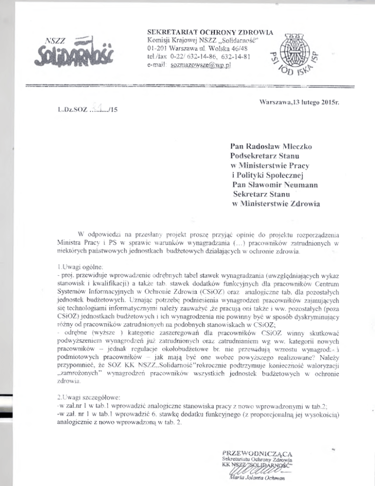 NSZZ /■, j L.Dz.SOZ <..L../15 S E K R E T A R IA T O C H R O N Y Z D R O W IA Komisji Krajowej NSZZ „Solidarność” 01-201 W arszawa u l W olska 46/48 tel./fax 0-22/632-14-86, 632-14-81 e-mai 1; sozm azowsze@ \yp.p 1 W a rsz a w a , 13 lutego 2015r. Pa» Radosław Mleczko Podsekretarz Stanu w Ministerstwie Pracy i Polityki Społecznej Pan Sławomir Neumann Sekretarz Stanu w Ministerstwie Zdrowia W odpowiedzi na przesłany projekt proszę przyjąć opinię do projektu rozporządzenia Ministra Pracy i PS w sprawie warunków wynagradzania ( ...) pracow ników zatrudnionych w niektórych państw ow ych jednostkach budżetow ych działających w ochronie zdrowia. 1.Uwagi ogólne: - proj. przewiduje w prow adzenie odrębnych tabel stawek w ynagradzania (uw zględniających wykaz stanowisk i kw alifikacji) a także tab. stawek dodatków funkcyjnych dla pracow ników Centrum Systemów Inform acyjnych w Ochronie Zdrowia (CSiOZ) oraz analogiczne tab. dla pozostałych jednostek budżetow ych. Uznając potrzebę podniesienia wynagrodzeń pracow ników zajmujących się technologiami inform atycznym i należy zauważyć ,że pracują oni także i ww. pozostałych (poza CSiOZ) jednostkach budżetow ych i ich w ynagrodzenia nie pow inny być w sposób dyskryminujący różny od pracow ników zatrudnionych na podobnych stanow iskach w CSiOZ; - odrębne (wyższe ) kategorie zaszeregowali dla pracow ników CSiO Z winny skutkować podwyższeniem w ynagrodzeń ju ż zatrudnionych oraz zatrudnianiem w g ww. kategorii nowych pracowników - jednak regulacje okołobudżetowe br. nie przew idują wzrostu w ynagrodź i podm iotowych pracow ników ja k m ają być one wobec pow yższego realizowane? Należy przypom nieć, źe SOZ KK N S Z Z „Solidam ość’’rokrocznie podtrzym uje konieczność waloryzacji „zam rożonych” w ynagrodzeń pracow ników wszystkich jednostek budżetow ych w ochronie zdrowia. 2.Uwagi szczegółowe: -w zał.nr 1 w tab .l wprowadzić analogiczne stanowiska pracy z nowo wprow adzonym i w tab.2; -w zał. nr 1 w tab .l wprow adzić 6. stawkę dodatku funkcyjnego (z proporcjonalną jej wysokością) analogicznie z now o w prow adzoną w tab. 2. PRZEWODNICZĄCA Sekretariajy Ouhronv Zdrowia Maria Jolanta Ochman