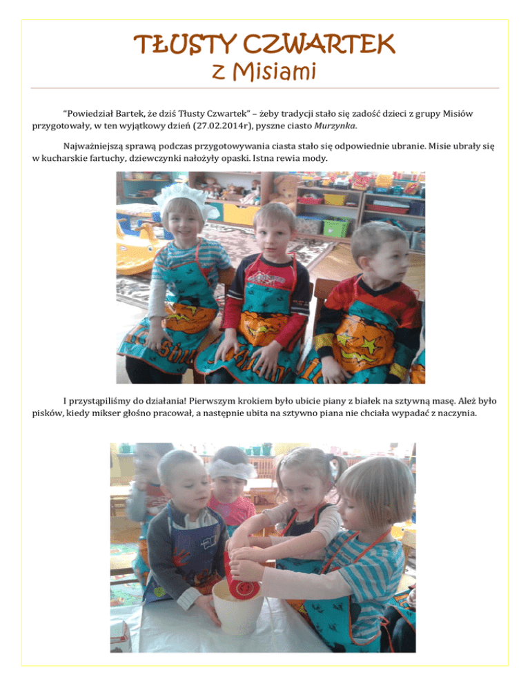TŁUSTY CZWARTEK z Misiami “Powiedział Bartek, że dziś Tłusty Czwartek” – żeby tradycji stało się zadość dzieci z grupy Misiów przygotowały, w ten wyjątkowy dzień (27.02.2014r), pyszne ciasto Murzynka. Najważniejszą sprawą podczas przygotowywania ciasta stało się odpowiednie ubranie. Misie ubrały się w kucharskie fartuchy, dziewczynki nałożyły opaski. Istna rewia mody. I przystąpiliśmy do działania! Pierwszym krokiem było ubicie piany z białek na sztywną masę. Ależ było pisków, kiedy mikser głośno pracował, a następnie ubita na sztywno piana nie chciała wypadać z naczynia. Kolejnym punktem w naszym przepisie na wyśmienitego Murzynka stało się dokładne zmiksowanie żółtek z masą kakaowo – margarynową. Te działanie wymagało niezwykłej precyzji działania i wyjątkowego skupienia. Następnie do wcześniej przygotowanej masy dzieci dodały mąkę z proszkiem do pieczenia i ponownie rozpoczęły intensywne miksowanie. Potrzeba było, aż dwóch ochotników do trzymania miksera i jednego do łapania miski, która w śmieszny sposób zaczęła tańczyć po całym stoliku. Kucharka Patrycja z wielką nobilitacją wymieszała przygotowana masę z wcześniej ubitą pianą z białek. Nie była to łatwa robota, ale łyżką przecież obracała prawdziwa profesjonalistka. Hurra! Wszystkie składniki zostały połączone i umieszczone w prodiżu. Przedszkolaki były dumne z dobrze wykonanej roboty! A tu ciasto już się piecze. Po sali roznosi się niebiański i kuszący zapach. Misiom ślinka cieknie na myśl o przygotowanych pysznościach, żywo komentują postęp pieczenia ciasta. Taaaa dammmm! I oto jest. Pomruk niezadowolenia wydobywa się z misiowych pyszczków, kiedy dowiadują się, iż trzeba będzie poczekać z konsumpcją do momentu, aż ciasto wystygnie. Lecz cóż to, przed dziećmi jeszcze jedno zadanie. Należy udekorować Murzynka bosko czekoladową masą. Ciasto wygląda już tak apetycznie. Masa kakaowa wyłożona starannie - zastyga. To prawdziwy majstersztyk! Niecierpliwe chwile oczekiwania na wystygnięcie ciasta, to chyba jeden z najtragiczniejszych momentów w życiu przedszkolaka. Ale nie ma tego złego, co by na dobre nie wyszło. Przecież zostało trochę słodkiej masy do wylizania z garnka. Mniam, ale pycha! Aż szkoda myć potem misiowe łapki. Nadszedł upragniony czas delektowania się ciastem. PRZEDSZKOLAKI MISIAKI ZROBIŁY TO W SPOSÓB TAK EKSPRESOWY, ŻE NIE ZDĄŻYŁAM ZROBIĆ ANI JEDENGO ZDJĘCIA. Musicie mi tylko uwierzyć na słowo, że mlaskanie rozniosło się echem po całym przedszkolu, a zapach świeżego ciasta niósł się jeszcze długo i zwabił Tygryski do naszej sali. Opracowała: Urszula Korbut