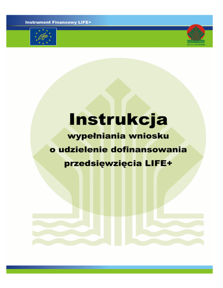 Informacje ogólne Celem przygotowywanego przez Państwa Wniosku jest udzielenie przez Narodowy Fundusz Ochrony Środowiska i Gospodarki Wodnej dofinansowania przedsięwzięcia LIFE+. Wniosek naleŜy złoŜyć w NFOŚiGW niezwłocznie po uzyskaniu przez Wnioskodawcę zaproszenia z Komisji Europejskiej do złoŜenia uaktualnionej elektronicznej wersji wniosku do LIFE+. W przypadku udzielenia dofinansowania, po podpisaniu Umowy o dofinansowaniu przedsięwzięcia, zawieranej pomiędzy NFOŚiGW a Beneficjentem, NFOŚiGW wypełnia odpowiedni formularz wniosku do LIFE+, potwierdzający współfinansowanie przedsięwzięcia, po otrzymaniu dotacji z Komisji Europejskiej (zobowiązanie potwierdzone). Ww. formularz naleŜy zeskanować i dołączyć do formularzy Części A wniosku do LIFE+. Wniosek o udzielenie dofinansowania przedsięwzięcia LIFE+ składa się z 4 części: A i B, które są dostępne do pobrania jako plik tekstowy formatu MS Word, Harmonogramu rzeczowo-finansowego, dostępnego do pobrania jako plik MS Excel oraz potwierdzonej za zgodność z oryginałem na kaŜdej stronie kopii wniosku LIFE+ złoŜonego do Komisji Europejskiej po uzgodnieniach dokonanych w trakcie Fazy rewizji wniosków (tzw. Revision Phase). Przedsięwzięcie opisane we Wniosku o udzielenie dofinansowania nie moŜe róŜnić się od przedsięwzięcia opisanego we wniosku do Instrumentu Finansowego LIFE+ (po uwzględnieniu zmian wprowadzonych w trakcie Fazy rewizji wniosków). W związku z powyŜszym planowana kwota współfinansowania wnioskowana z NFOŚiGW moŜe ulec zmianie w stosunku do kwoty wymienionej w otrzymanej promesie. Nie moŜe jednak przekraczać dozwolonego procentu dofinansowania (zgodnie z Programem współfinansowania przedsięwzięć, uzyskujących wsparcie w ramach Instrumentu Finansowego LIFE+). Prosimy więc o zwrócenie szczególnej uwagi na proponowane koszty przedsięwzięcia, tak aby wnioskowana kwota ze środków NFOŚiGW odpowiadała kwocie współfinansowania przez NFOŚiGW wpisanej w formularzach finansowych wniosku LIFE+. Jeśli przy realizacji przedsięwzięcia przewidywany jest udział partnerów, Wnioskodawca składa jeden Wniosek na całe przedsięwzięcie obejmujący wszystkie planowane działania, występujące zarówno po stronie Wnioskodawcy, jak i partnerów (określanych dalej jako Współbeneficjenci). Przekazanie środków pomiędzy Wnioskodawcą a Współbeneficjentami odbywa się na podstawie odrębnych umów pomiędzy nimi, które zostaną dostarczone do NFOŚiGW po podpisaniu umowy Beneficjent – Komisja Europejska. W przypadku Wniosku składanego przez partnera projektu międzynarodowego w harmonogramie realizacji przedsięwzięcia zawiera się wszystkie działania realizowane przez tego partnera na terenie Polski. Prosimy zwrócić uwagę na fakt, Ŝe NFOŚiGW moŜe współfinansować wyłącznie działania realizowane przez polskie podmioty na terenie Polski. W przypadku, gdy Państwa Współbeneficjentem jest podmiot zagraniczny, NFOŚiGW nie moŜe współfinansować prowadzonych przez niego działań. Obowiązkiem Wnioskodawcy jest wypełnienie wszystkich wolnych pól w formularzach. W przypadku, gdy nie jest moŜliwe podanie wymaganych informacji, w poszczególnych częściach obowiązkowych formularzy zaleca się wpisać „nie dotyczy”. Uwaga: Stronę tytułową Wniosku wypełnia NFOŚiGW. 1. Część A – Informacje administracyjne PRZEDSIĘWZIĘCIE Tytuł przedsięwzięcia (maksymalnie 120 znaków): Powinien zawierać główne załoŜenia i cele przedsięwzięcia, takie jak: nazwa obszaru objętego zakresem przedsięwzięcia, nazwy podstawowych gatunków, których dotyczy przedsięwzięcie itp. (NaleŜy pamiętać, Ŝeby podana w tym miejscu nazwa przedsięwzięcia nie róŜniła się od nazwy, podanej we wniosku do LIFE+. RóŜne nazwy mogą skutkować uznaniem przez KE, Ŝe wypełniony przez NFOŚiGW formularz A6, dotyczy innego przedsięwzięcia. W przypadku wypełnienia wniosku do LIFE+ w języku angielskim naleŜy wpisać jednocześnie polskie tłumaczenie tytułu przedsięwzięcia oraz tytuł oryginalny. Ta sama adnotacja dotyczy wymaganego dla Komponentu I formularza A8). Nazwa skrócona: przedsięwzięcie powinno być moŜliwe do zidentyfikowania we wszystkich formularzach Wniosku przy pomocy swojej nazwy skróconej (maksymalnie 25 znaków). Miejsce realizacji przedsięwzięcia: NaleŜy podać, według obowiązującego podziału administracyjnego, miejscowość, gminę, powiat, województwo. W przypadku, gdy przedsięwzięcie będzie realizowane w wielu lokalizacjach, naleŜy podać miejsca realizacji przedsięwzięcia z dokładnością do powiatu. Przewidywany termin rozpoczęcia przedsięwzięcia: Najwcześniejszy moŜliwy termin rozpoczęcia przedsięwzięcia podawany jest w ogłoszeniu KE o naborze wniosków do Instrumentu Finansowego LIFE+. Przy podawaniu dat naleŜy zawsze uŜywać następującego formatu: DD/MM/RRRR. WNIOSKODAWCA NaleŜy podać nazwę Wnioskodawcy i nazwy Współbeneficjentów. W przypadku, gdy liczba Współbeneficjentów przedsięwzięcia jest większa niŜ liczba wierszy w formularzu, naleŜy wprowadzić dodatkowe wiersze. DANE WNIOSKODAWCY Pełna nazwa (nazwa rejestrowa): NaleŜy podać nazwę, pod którą Wnioskodawca jest oficjalnie zarejestrowany. Powinna to być pełna nazwa jednostki organizacyjnej, podmiotu lub imię i nazwisko osoby będącej Wnioskodawcą, zgodnie z wpisem do rejestrów sądowych, ewidencji bądź określona w odpowiednich przepisach prawa lub akcie powołania/utworzenia. NIP: Jeśli ma to zastosowanie, prosimy podać numer indentyfikacyjny podatnika (NIP) Wnioskodawcy REGON: Jeśli ma to zastosowanie, prosimy podać numer identyfikacyjny krajowego rejestru urzędowego podmiotów gospodarki narodowej Wnioskodawcy KRS: Jeśli ma to zastosowanie, prosimy podać numer Krajowego Rejestru Sądowego Wnioskodawcy. PKD/2007 (ewentualnie PKD/2004): W polu PKD/EKD, naleŜy wpisać jeden numer, odpowia