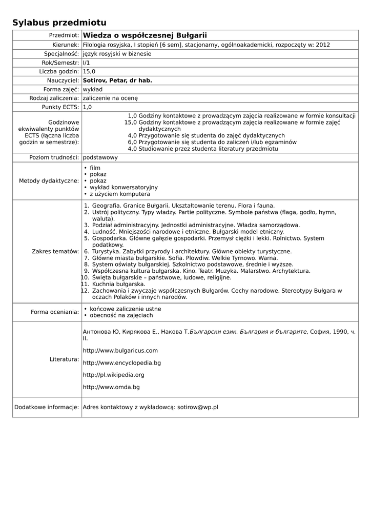 Sylabus przedmiotu Przedmiot: Wiedza o współczesnej Bułgarii Kierunek: Filologia rosyjska, I stopień [6 sem], stacjonarny, ogólnoakademicki, rozpoczęty w: 2012 Specjalność: język rosyjski w biznesie Rok/Semestr: I/1 Liczba godzin: 15,0 Nauczyciel: Sotirov, Petar, dr hab. Forma zajęć: wykład Rodzaj zaliczenia: zaliczenie na ocenę Punkty ECTS: 1,0 1,0 Godziny kontaktowe z prowadzącym zajęcia realizowane w formie konsultacji 15,0 Godziny kontaktowe z prowadzącym zajęcia realizowane w formie zajęć dydaktycznych 4,0 Przygotowanie się studenta do zajęć dydaktycznych 6,0 Przygotowanie się studenta do zaliczeń i/lub egzaminów 4,0 Studiowanie przez studenta literatury przedmiotu Godzinowe ekwiwalenty punktów ECTS (łączna liczba godzin w semestrze): Poziom trudności: podstawowy • • Metody dydaktyczne: • • • film pokaz pokaz wykład konwersatoryjny z użyciem komputera 1. Geografia. Granice Bułgarii. Ukształtowanie terenu. Flora i fauna. 2. Ustrój polityczny. Typy władzy. Partie polityczne. Symbole państwa (flaga, godło, hymn, waluta). 3. Podział administracyjny. Jednostki administracyjne. Władza samorządowa. 4. Ludność. Mniejszości narodowe i etniczne. Bułgarski model etniczny. 5. Gospodarka. Główne gałęzie gospodarki. Przemysł ciężki i lekki. Rolnictwo. System podatkowy. Zakres tematów: 6. Turystyka. Zabytki przyrody i architektury. Główne obiekty turystyczne. 7. Główne miasta bułgarskie. Sofia. Plowdiw. Welkie Tyrnowo. Warna. 8. System oświaty bułgarskiej. Szkolnictwo podstawowe, średnie i wyższe. 9. Współczesna kultura bułgarska. Kino. Teatr. Muzyka. Malarstwo. Archytektura. 10. Święta bułgarskie – państwowe, ludowe, religijne. 11. Kuchnia bułgarska. 12. Zachowania i zwyczaje współczesnych Bułgarów. Cechy narodowe. Stereotypy Bułgara w oczach Polaków i innych narodów. Forma oceniania: • końcowe zaliczenie ustne • obecność na zajęciach Антонова Ю, Кирякова Е., Накова Т.Български език. България и българите, София, 1990, ч. II. http://www.bulgaricus.com Literatura: http://www.encyclopedia.bg http://pl.wikipedia.org http://www.omda.bg Dodatkowe informacje: Adres kontaktowy z wykładowcą: [email protected]