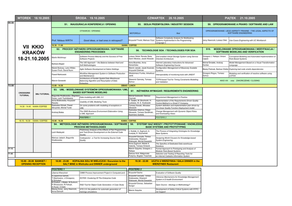 WTOREK 18.10.2005 ŚRODA 09.00 S1. 19.10.2005 CZWARTEK INAUGURACJA KONFERENCJI / OPENING S5. 20.10.2005 SESJA PRZEMYSŁOWA / INDUSTRY SESSION OTWARCIE / OPENING MOTOROLA Prof. Niklaus WIRTH VII KKIO KRAKÓW 18-21.10.2005 PROCESY INŻYNIERII OPROGRAMOWANIA / SOFTWARE ENGINEERING PROCESSES KAWA /COFFEE Barbara Begier The UID Approach − the Balance between Hard and Soft Methodologies Ilona Bluemke, Anna Derezińska Internet Laboratory Instructions for Advanced Software Engineering Course Michał Śmiałek, Andrzej Kardas Model Management Based on a Visual Transformation Language Marek Bukowy, Larry Wilder, Susan Finch, David Nunn Agile Software Development at Sabre Holdings Marcin Jarzab, Jacek Kosinski, Configuration Management of Massively Scalable Krzysztof Zielinski Systems Włodzimierz Funika, Arkadiusz Workflow Management System in Software Production Interoperability of monitoring tools with JINEXT Janik and Maintenance Architecture of Parallel Spatial Data Warehouse: Sławomir Samolej, Tomasz TCPN-based Tool for Timing Constraints Modelling Balancing Algorithm and Resumption of Data Szmuc and Validation Extraction OBIAD / LUNCH UML - MODELOWANIE SYSTEMÓW OPROGRAMOWANIA / UMLS7. BASED SOFTWARE MODELING Bogumiła Hnatkowska, Zbigniew Huzar, Lech Tuzinkiewicz Anna Bobkowska, Krzysztof Reszke Radosław Klimek, Paweł Skrzyński, Michał Turek Data modeling with UML 2.0 Usability of UML Modeling Tools On some problems with modelling of exceptions in UML The ISMS Business Environment Elaboration Using a UML Approach 16.00 - 16.30 S4. INŻYNIERIA WYMAGAŃ / REQUIREMENTS ENGINEERING Michał Godowski, Dariusz Czyrnek S. Szejko, M. Brochocki, H. Łyskawa, W. E. Kozłowski Tomasz Nowak, Mirosław Głowacki Radosław Adamus, Edgar Głowacki, Tomasz Serafiński, Kazimierz Subieta Lech Madeyski Preliminary Analysis of the Effects of Pair Programming and Test-Driven Development on the External Code Quality Mariusz Jadach, Bogumiła Hnatkowska Codespector - a Tool for Increasing Source Code Quality 17.45 18.00 - 23.00 KOPALNIA SOLI W WIELICZCE / Excursion to the SALT MINE in Wieliczka and DINNER underground POSTERS 1 A.Gąsienica-Samek, T.Stachowicz, J.Chrząszcz, A.Schubert M.Graboń, J.Małek, M.Surkont, P.Wroszczuk, R.Fotrzyk, A.Huzar, A.Kaliś Maciej Dorsz, Jerzy Nawrocki, Anna Demuth Implementation of the Requirements Driven Quality Control Method in a Small IT Company System definition and implementation plan driven by non-linear Quality Function Deployment model Change Management with Dynamic Object Roles and Overloading Views POSTERS 2 METODOLOGIE INŻYNIERII OPROGRAMOWANIA / SOFTWARE PROCESS METHODOLOGIES Lilianna Wierzchoń Requirement Management in Practice KAWA / COFFEE 17.15 18.00 - 20.00 BANKIET / OPENING RECEPTION MODELOWANIE OPROGRAMOWANIA I WERYFIKACJA / SOFTWARE MODELING AND VERIFICATION Conceptual Modeling and Automated Implementation of Rule-Based Systems POSTERS 1 KAWA / COFFEE S10. Use-Cases Engineering with UC Workbench Grzegorz J. Nalepa i Antoni Ligęza Andrzej Białas 16.15 - 16.30 Jerzy Nawrocki, Łukasz Olek Grid enabled Virtual Storage System using Service Oriented Architecture S3. 14.30 - 14.45 OPROGRAMOWANIE I JEGO ASPEKTY PRAWNE / THE LEGAL ASPECTS OF SOFTWARE ENGINEERING Łukasz Skitał, Renata Słota, Darin Nikolow, Jacek Kitowski 13.00 - 14.30 BBJ TUTORIAL TECHNOLOGIE SOA / TECHNOLOGIES FOR SOA S9. OPROGRAMOWANIE A PRAWO / SOFTWARE AND LAW Software Process Maturity and the Success of Free Software Projects Marcin Gorawski CROSSGRID TUTORIAL S6. 21.10.2005 Martin Michlmayr Paweł Markowski 13.00 Software Complexity Analysis for Multitasking Krzysztof Trocki, Mariusz Czyz Systems Implemented in the Programming Language C KAWA / COFFEE Good ideas, or bad ones in retrospect? 10.30 - 11.00 S2. /tba/ PIĄTEK S8. SYSTEMY BAZ WIEDZY I PROTOTYPOWANIE / KNOWLEDGE BASE SYSTEMS AND PROTOTYPING J. Koźlak, A. Zygmunt, A. Łuszpaj, K. Szymański The Process of Integrating Ontologies for Knowledge Base Systems Krzysztof Goczyła, Teresa Grabowska, Wojciech Waloszek, Michał Zawadzki Anna Zygmunt, Marek A. Valenta, Tomasz Kmiecik Marcin Szpyrka, Grzegorz J. Nalepa Dariusz Król, Małgorzata Podyma, Bogdan Trawiński 19.30 - 22.00 Designing World Clousers for Knowledge-based System Engineering The Specifics of Dedicated Data warehouse Solutions Formal Approach to Prototyping and Analysis of Modular Rule-Based Systems Selection and Testing of Reporting Tools for an Internet Cadastre Information System UCZTA U WIERZYNKA / GALA DINNER in the WIERZYNEK Restaurant POSTERS 2 CMMI Process Improvement Project in ComputerLand Krzysztof Sacha Evaluation of Software Quality KOTEK: Clustering Of The Enterprise Code Krzysztof Goczyła, Teresa Grabowska, Wojciech Waloszek, Michał Zawadzki Inference Mechanisms for Knowledge Management System in E-health Environment RAD Tool for Object Code Generation: A Case Study Krzysztof Dorosz, Sebastian Gurgul Open Source - Ideology or Methodology? ATG 2.0: the platform for automatic generation of trainings simulations Marcin Szpyrka Development of Safety-Critical Systems with RTPCnet Support Błażej Pietrzak, Bartosz Walter Exploring bad code smells dependencies Grzegorz Rogus, Tomasz Szmuc KKIO VIII Modeling and verification of reactive software using LOTOS oraz ZAKOŃCZENIE / CLOSING