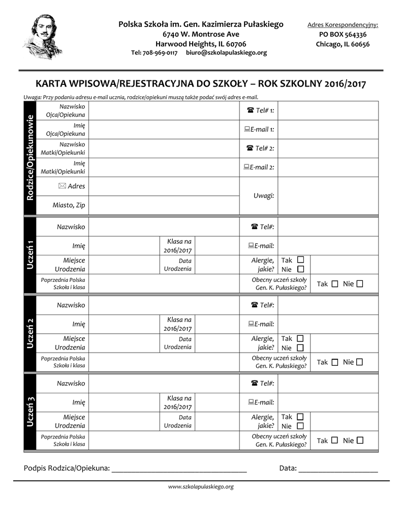 Polska Szkoła im. Gen. Kazimierza Pułaskiego Adres Korespondencyjny: 6740 W. Montrose Ave Harwood Heights, IL 60706 PO BOX 564336 Chicago, IL 60656 Tel: 708-969-0117 [email protected] KARTA WPISOWA/REJESTRACYJNA DO SZKOŁY – ROK SZKOLNY 2016/2017 Rodzice/Opiekunowie Uwaga: Przy podaniu adresu e-mail ucznia, rodzice/opiekuni muszą także podać swój adres e-mail. Nazwisko Ojca/Opiekuna Tel# 1: Imię Ojca/Opiekuna E-mail 1: Nazwisko Matki/Opiekunki Tel# 2: Imię Matki/Opiekunki E-mail 2: Adres Uwagi: Miasto, Zip Tel#: Uczeń 1 Nazwisko Imię Klasa na 2016/2017 Miejsce Urodzenia Data Urodzenia Tak ☐ Nie ☐ Tel#: Nazwisko Uczeń 2 Alergie, Tak ☐ jakie? Nie ☐ Obecny uczeń szkoły Gen. K. Pułaskiego? Poprzednia Polska Szkoła i klasa Imię Klasa na 2016/2017 Miejsce Urodzenia Data Urodzenia E-mail: Alergie, Tak ☐ jakie? Nie ☐ Obecny uczeń szkoły Gen. K. Pułaskiego? Poprzednia Polska Szkoła i klasa Tak ☐ Nie ☐ Tel#: Nazwisko Uczeń 3 E-mail: Imię Klasa na 2016/2017 Miejsce Urodzenia Data Urodzenia E-mail: Alergie, Tak ☐ jakie? Nie ☐ Obecny uczeń szkoły Gen. K. Pułaskiego? Poprzednia Polska Szkoła i klasa Podpis Rodzica/Opiekuna: __________________________________ www.szkolapulaskiego.org Tak ☐ Nie ☐ Data: ____________________