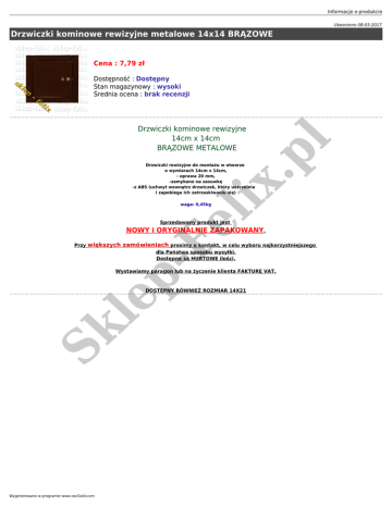 Informacje o produkcie Utworzono 08-03-2017 Drzwiczki kominowe rewizyjne metalowe 14x14 BRĄZOWE Cena : 7,79 zł Dostępność : Dostępny Stan magazynowy : wysoki Średnia ocena : brak recenzji .p l Drzwiczki kominowe rewizyjne 14cm x 14cm BRĄZOWE METALOWE Fe lix Drzwiczki rewizyjne do montażu w otworze o wymiarach 14cm x 14cm, - oprawa 20 mm, -zamykane na zasuwkę -z ABS (uchwyt wewnątrz drzwiczek, który uszczelnia i zapobiega ich zatrzaskiwaniu się) waga: 0,45kg Sprzedawany produkt jest NOWY i ORYGINALNIE ZAPAKOWANY. Przy większych zamówieniach prosimy o kontakt, w celu wyboru najkorzystniejszego Sk le p- dla Państwa sposobu wysyłki. Dostępne są HURTOWE ilości. Wystawiamy paragon lub na życzenie klienta FAKTURĘ VAT. DOSTĘPNY RÓWNIEŻ ROZMIAR 14X21 Wygenerowano w programie www.oscGold.com