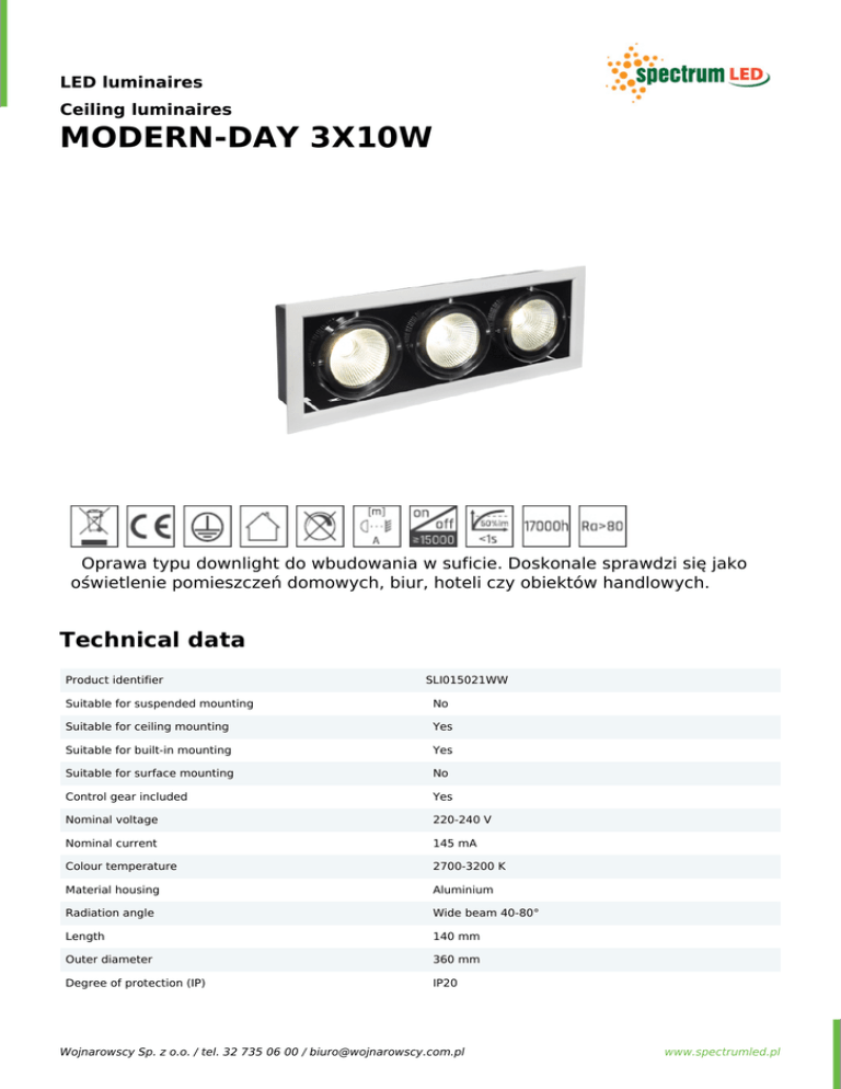 LED luminaires Ceiling luminaires MODERN-DAY 3X10W Oprawa typu downlight do wbudowania w suficie. Doskonale sprawdzi się jako oświetlenie pomieszczeń domowych, biur, hoteli czy obiektów handlowych. Technical data Product identifier SLI015021WW Suitable for suspended mounting No Suitable for ceiling mounting Yes Suitable for built-in mounting Yes Suitable for surface mounting No Control gear included Yes Nominal voltage 220-240 V Nominal current 145 mA Colour temperature 2700-3200 K Material housing Aluminium Radiation angle Wide beam 40-80° Length 140 mm Outer diameter 360 mm Degree of protection (IP) IP20 Wojnarowscy Sp. z o.o. / tel. 32 735 06 00 / [email protected] www.spectrumled.pl LED luminaires Ceiling luminaires MODERN-DAY 3X10W Effective luminous flux 1650 lm Colour rendering index CRI 80-89 Wojnarowscy Sp. z o.o. / tel. 32 735 06 00 / [email protected] Powered by TCPDF (www.tcpdf.org) www.spectrumled.pl